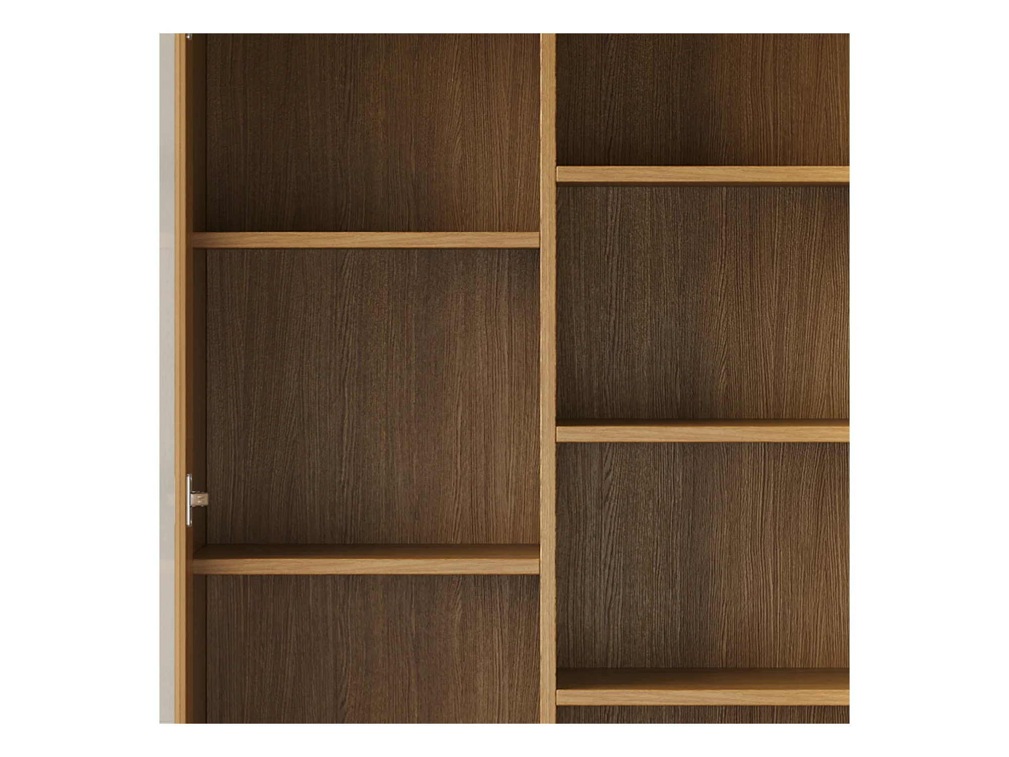Vitrine, boekenkast, servieskast KILES in grijs, wit en eiken. Model met vitrine aan de linkerkant. Ingebouwde LED.
