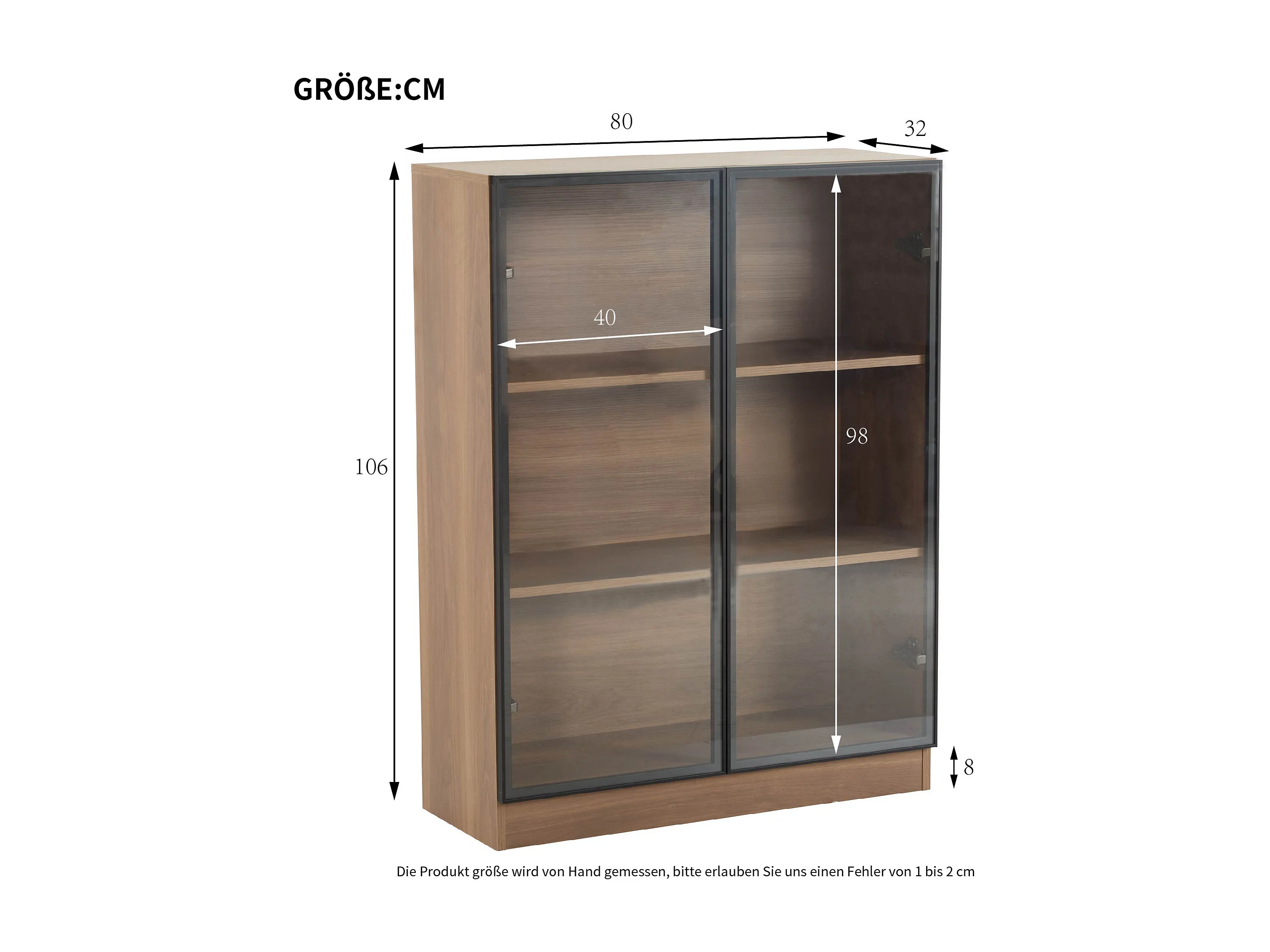 Vitrinekast met 2 deuren 80x32x106 cm met LED-verlichting en planken, spaanplaat en glas, natuurlijke kleur, voor woonkamer