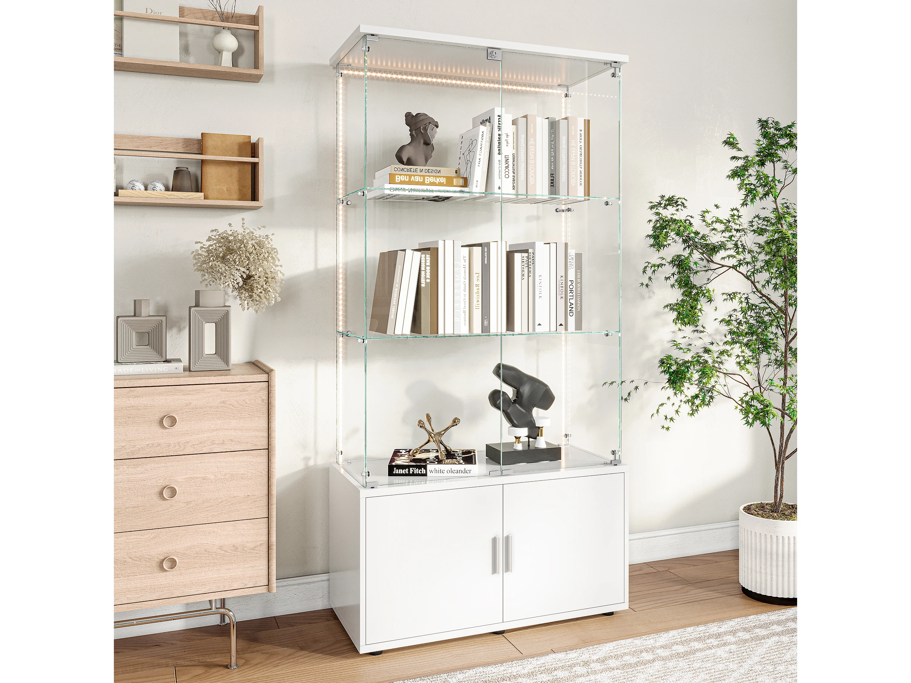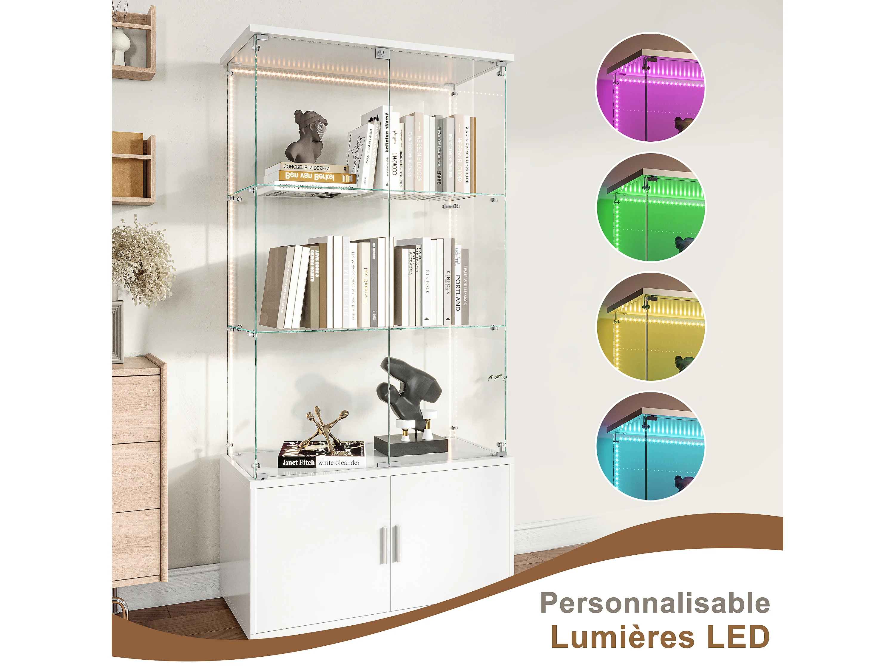 Vitrinekast met 3 planken, LED en opbergruimte, modern wit design, gehard glas en metaal - Ideaal voor woonkamer, slaapkamer, kantoor