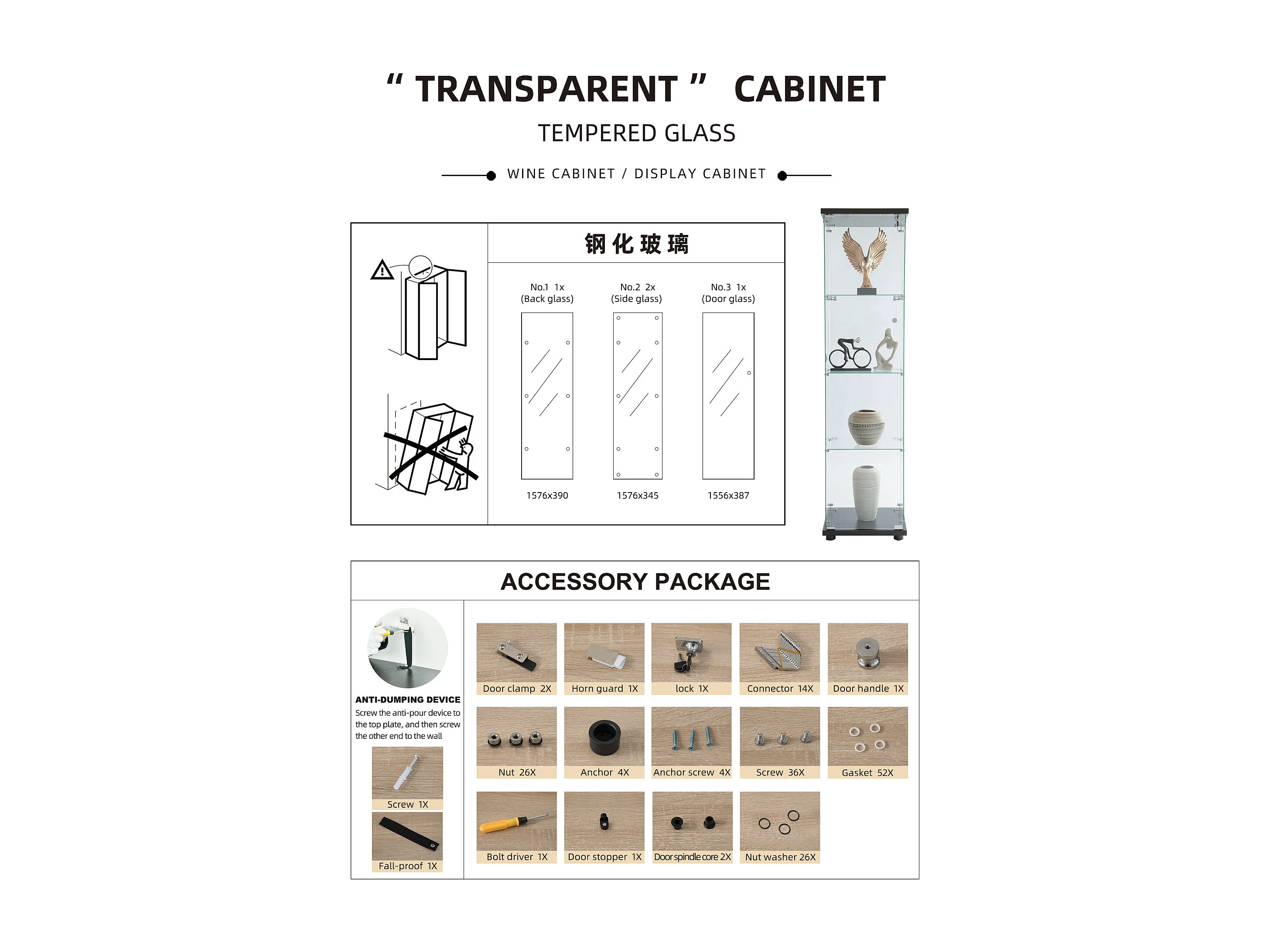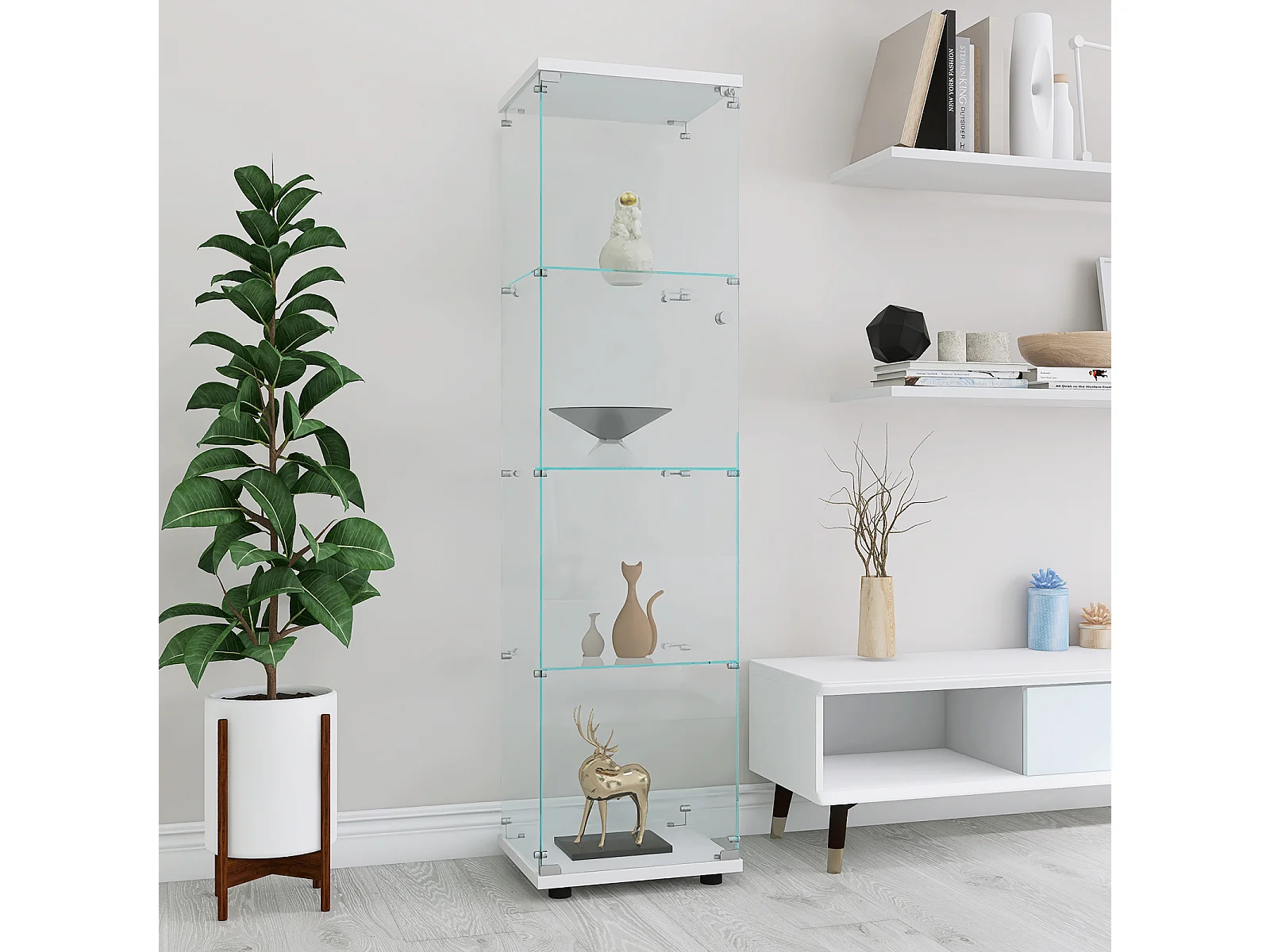 Vitrinekast met 4 planken en gehard glazen deur, vrijstaand, boekenkast en decoratieve vitrinekast voor woonkamer, slaapkamer of kantoor