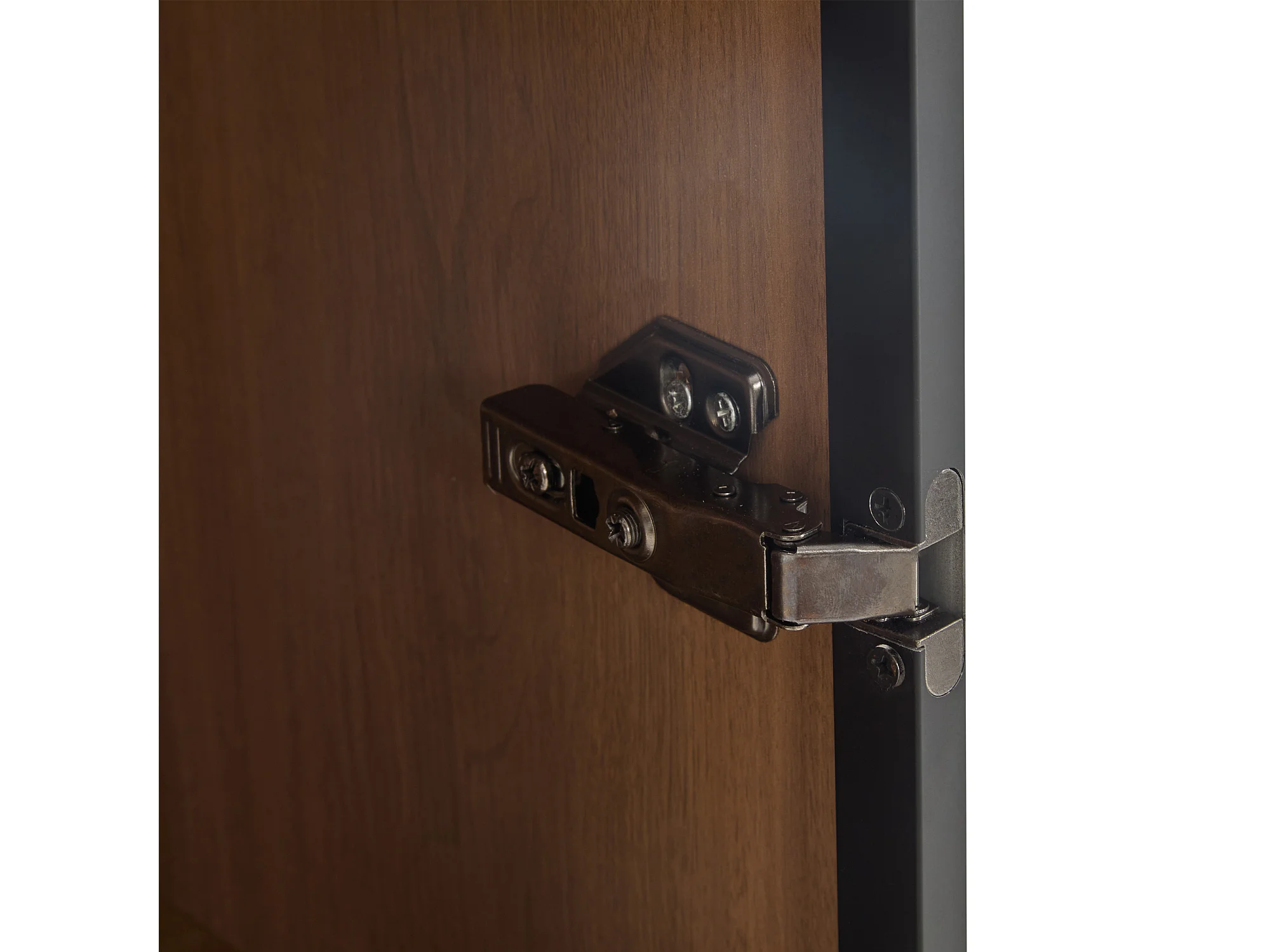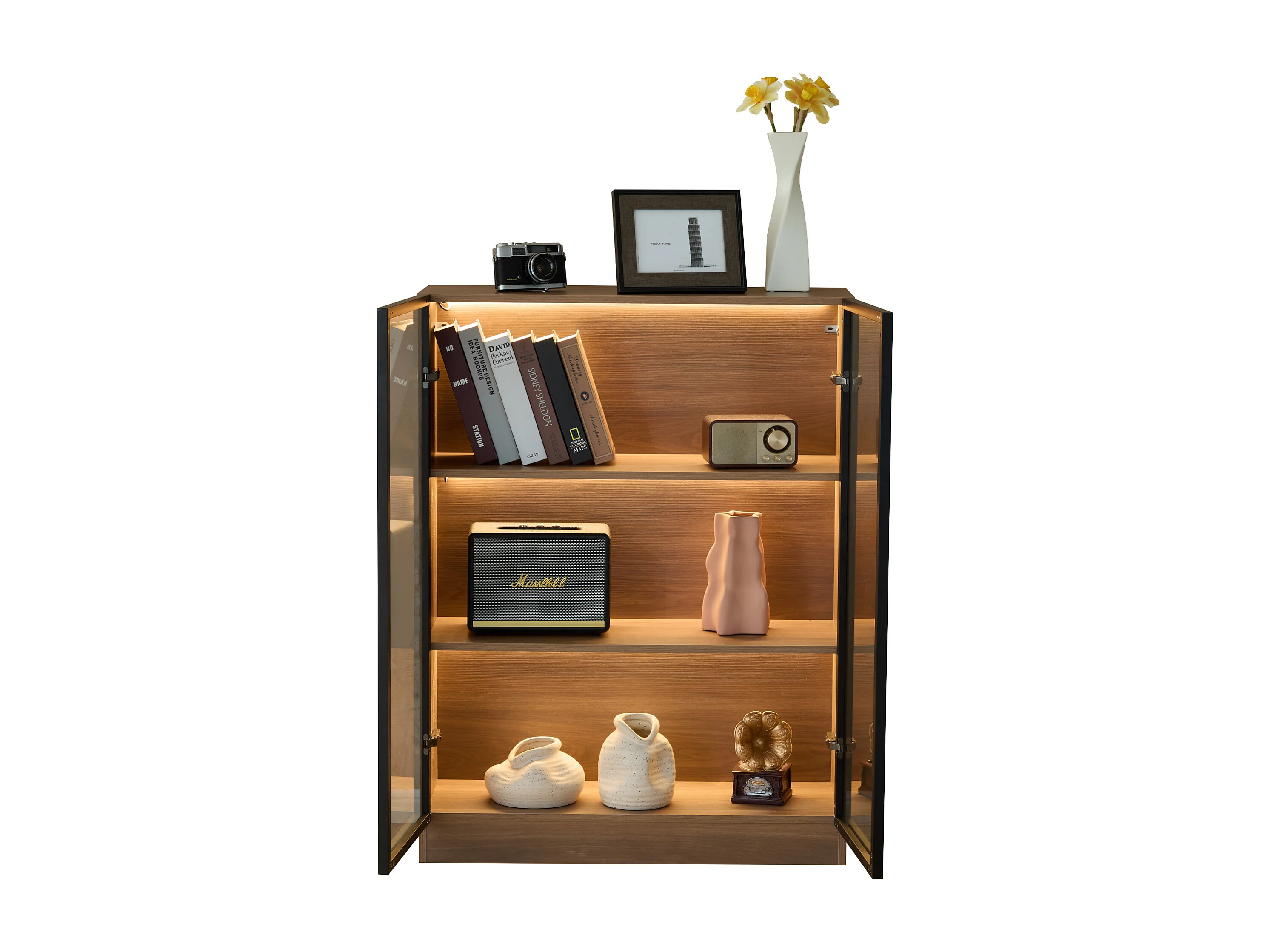 Vitrinekast van glas met 3 planken en LED-stripverlichting, kleur walnoot