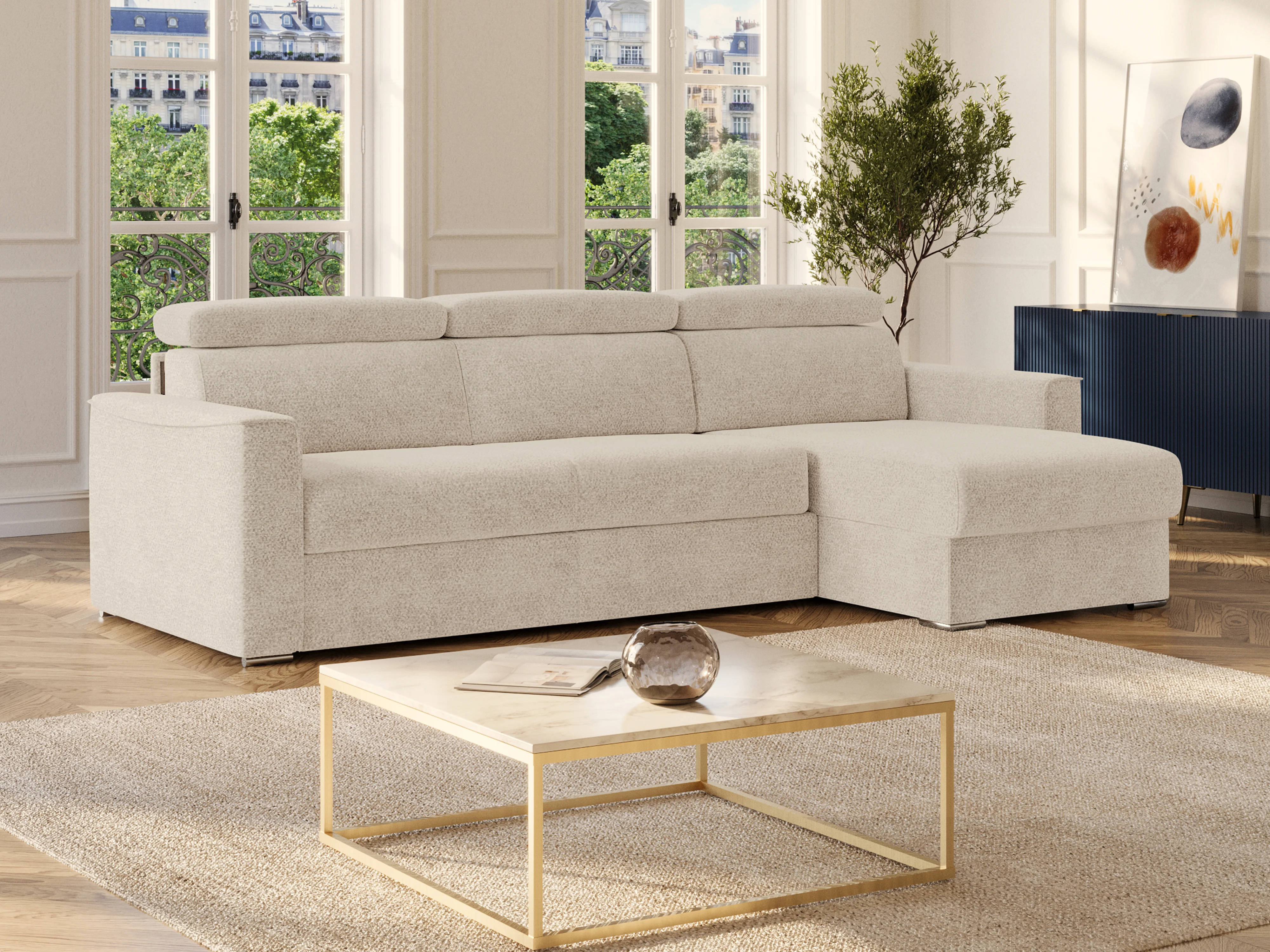 Omkeerbare express-hoekslaapbank in beige chenille stof - Bed van 160 cm met brede latten - Matras 14 cm VIZIR