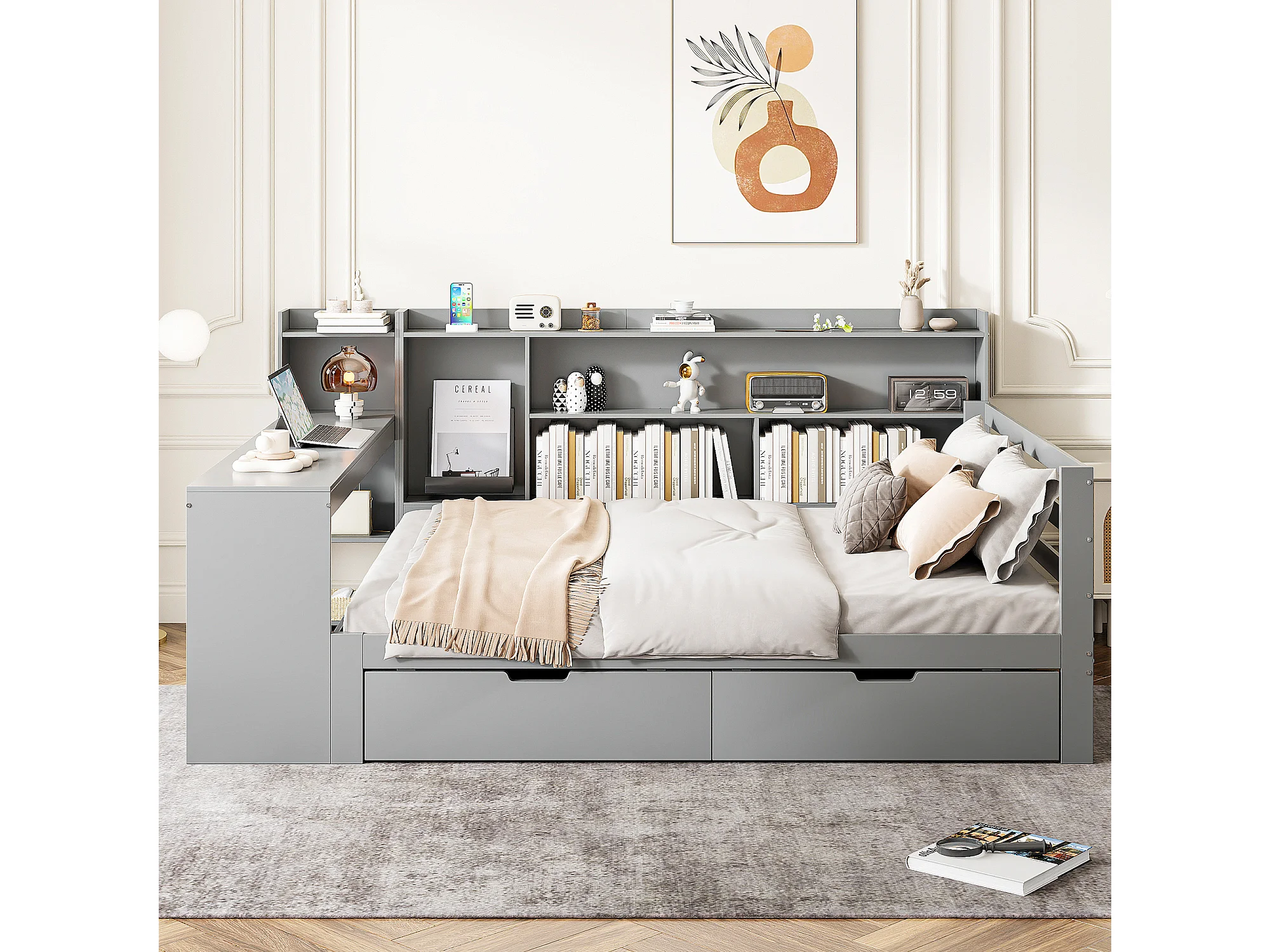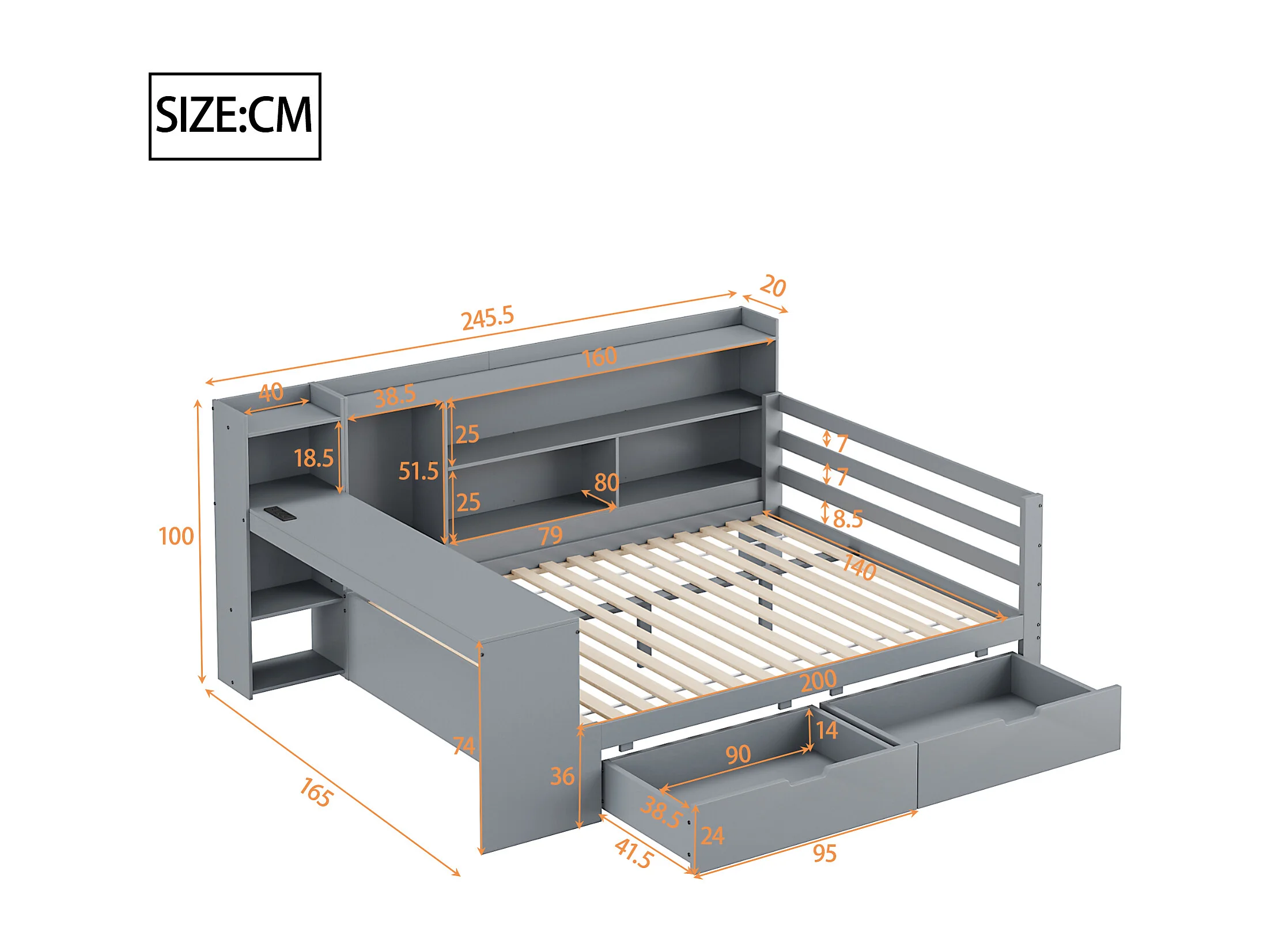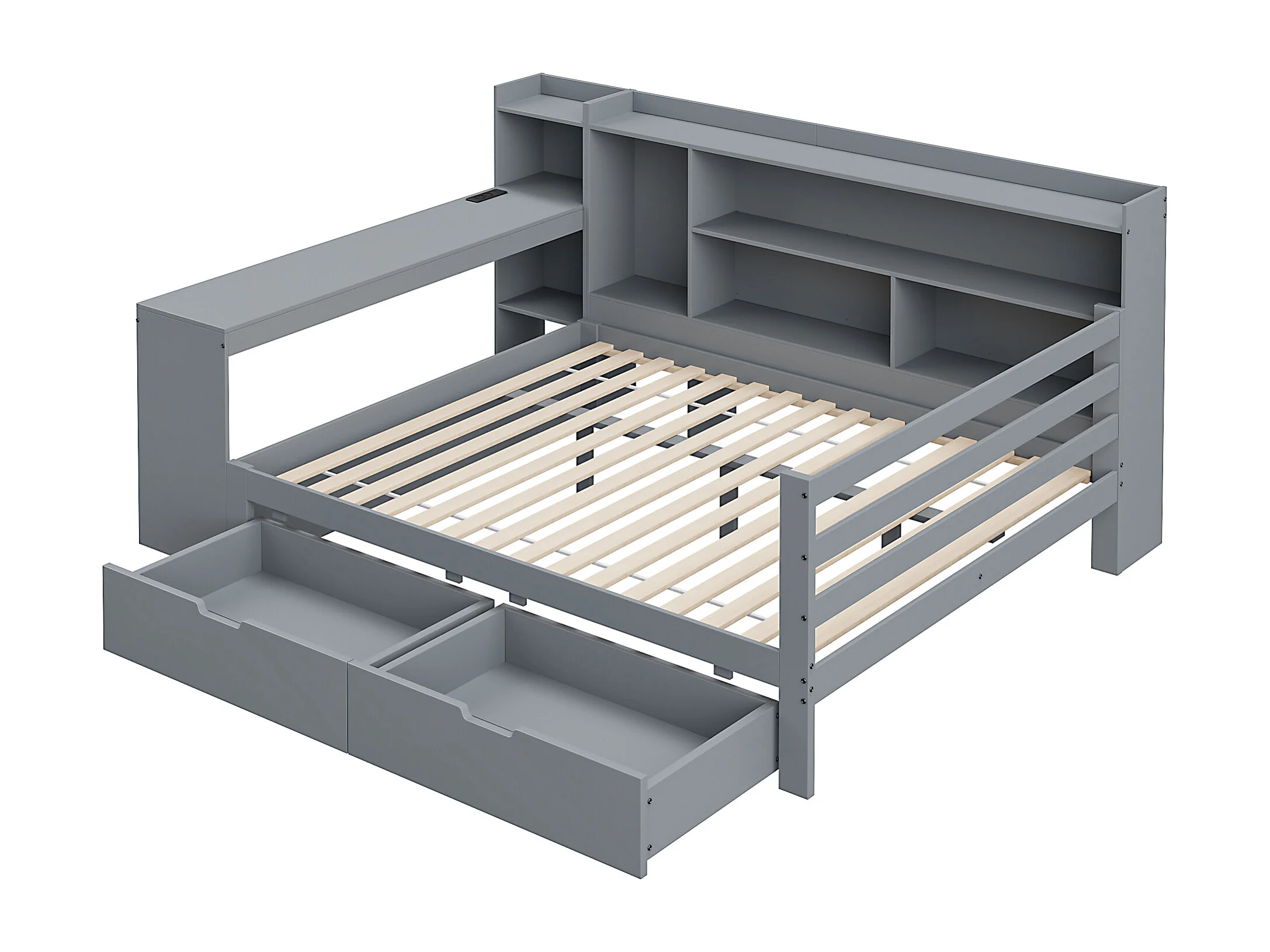 Volwassen bed 140x200 cm - met 2 lades, planken, USB - hout - grijs