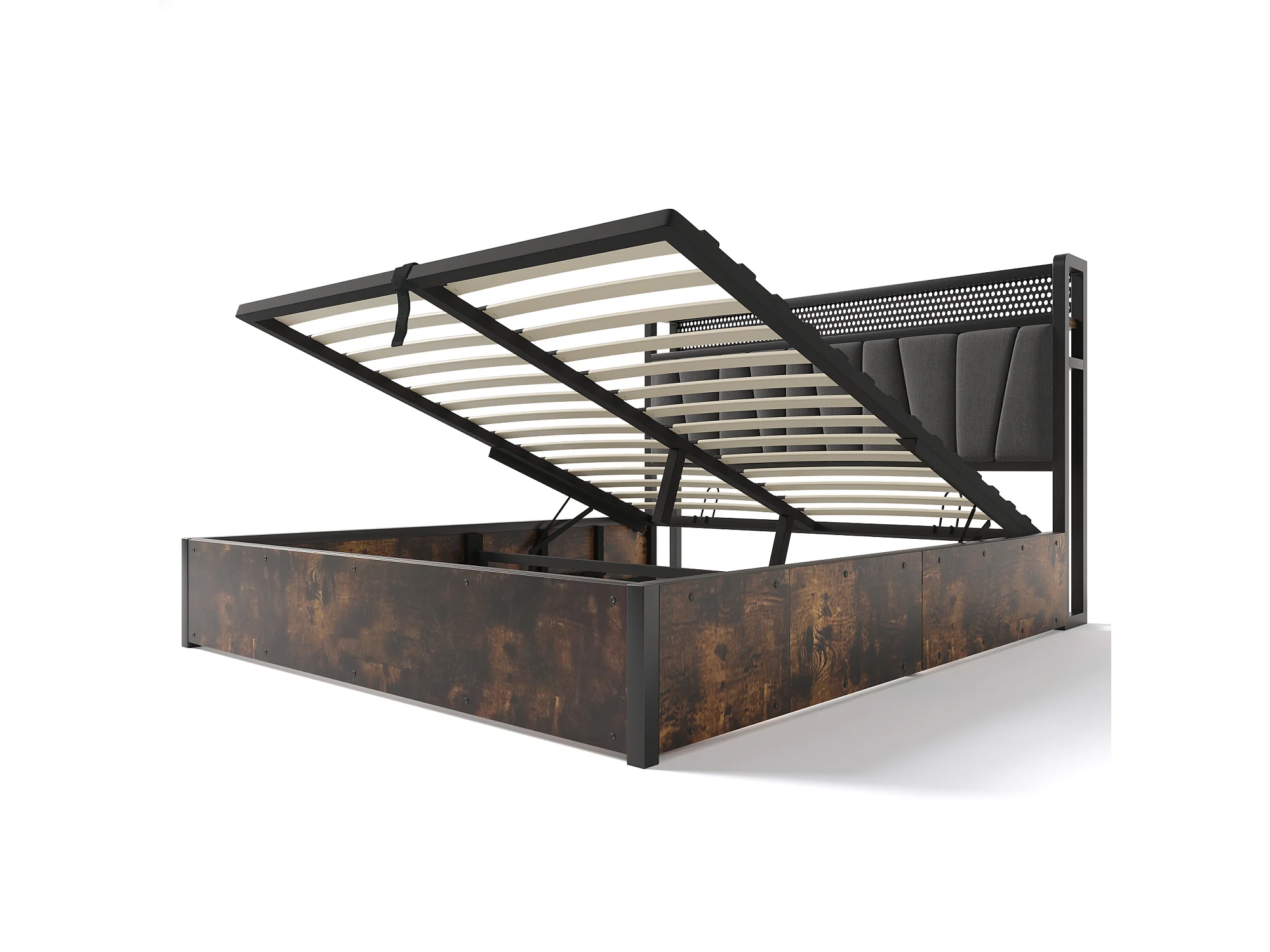 Volwassen bed 140x200 cm - met hoofdbord met opbergruimte, ledverlichting, USB-aansluiting, lattenbodem - linnen - grijs - inclusief matras