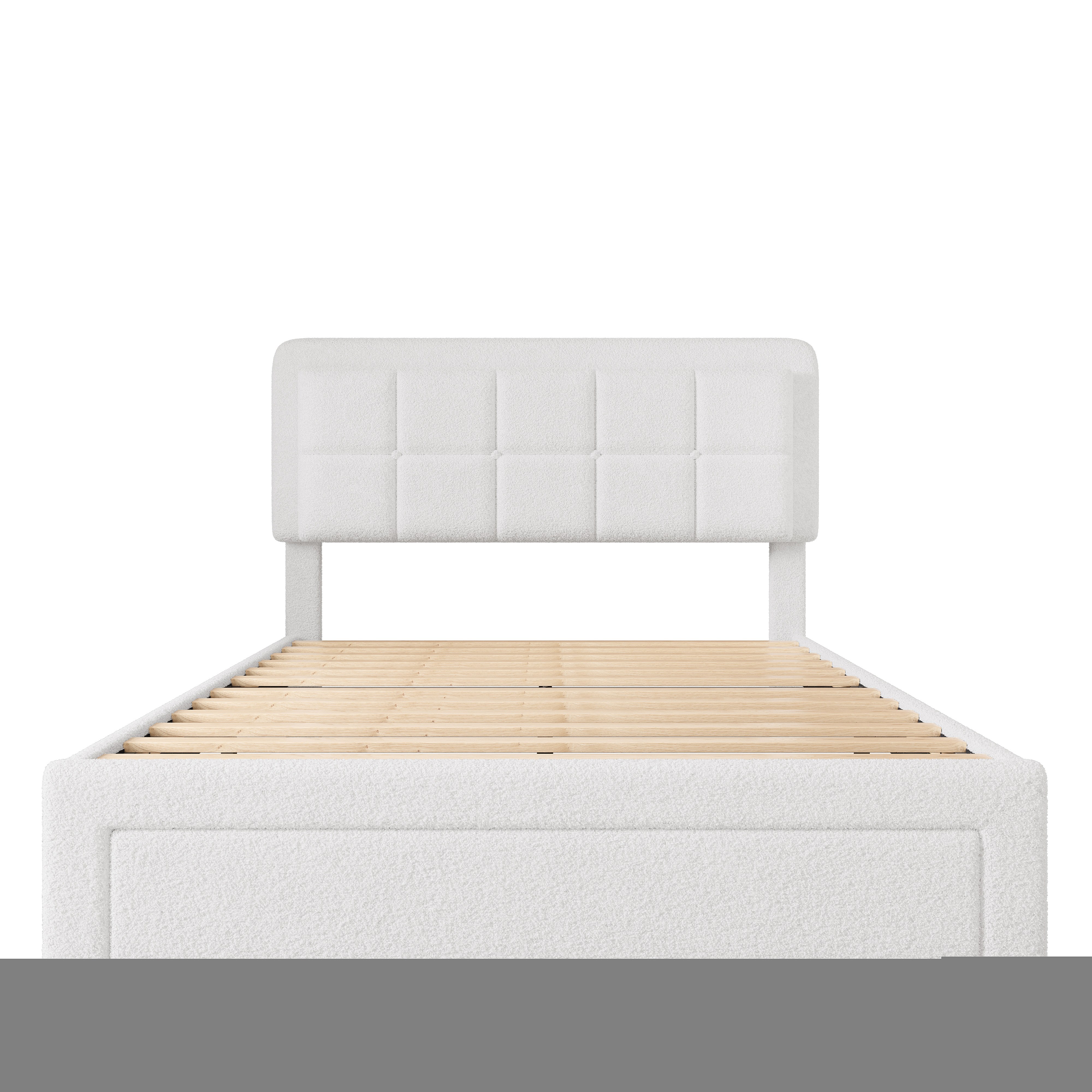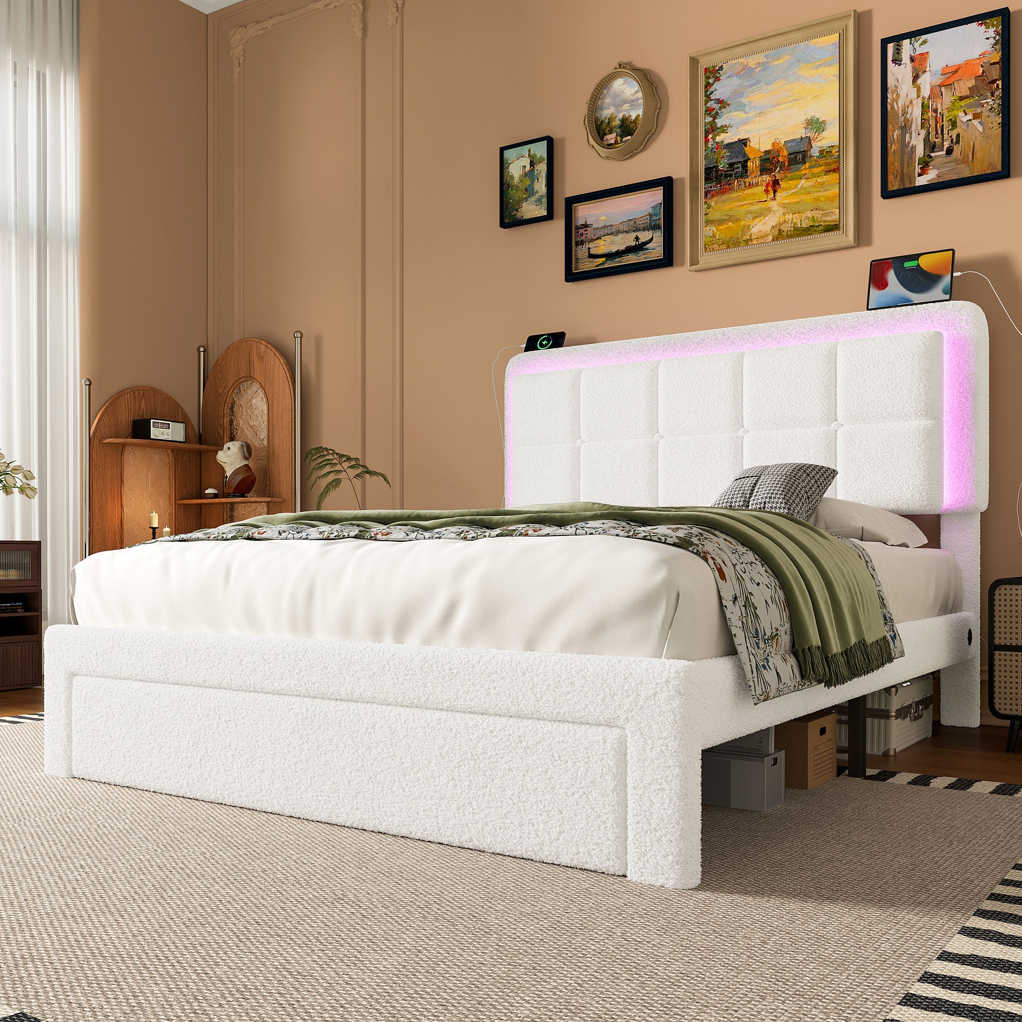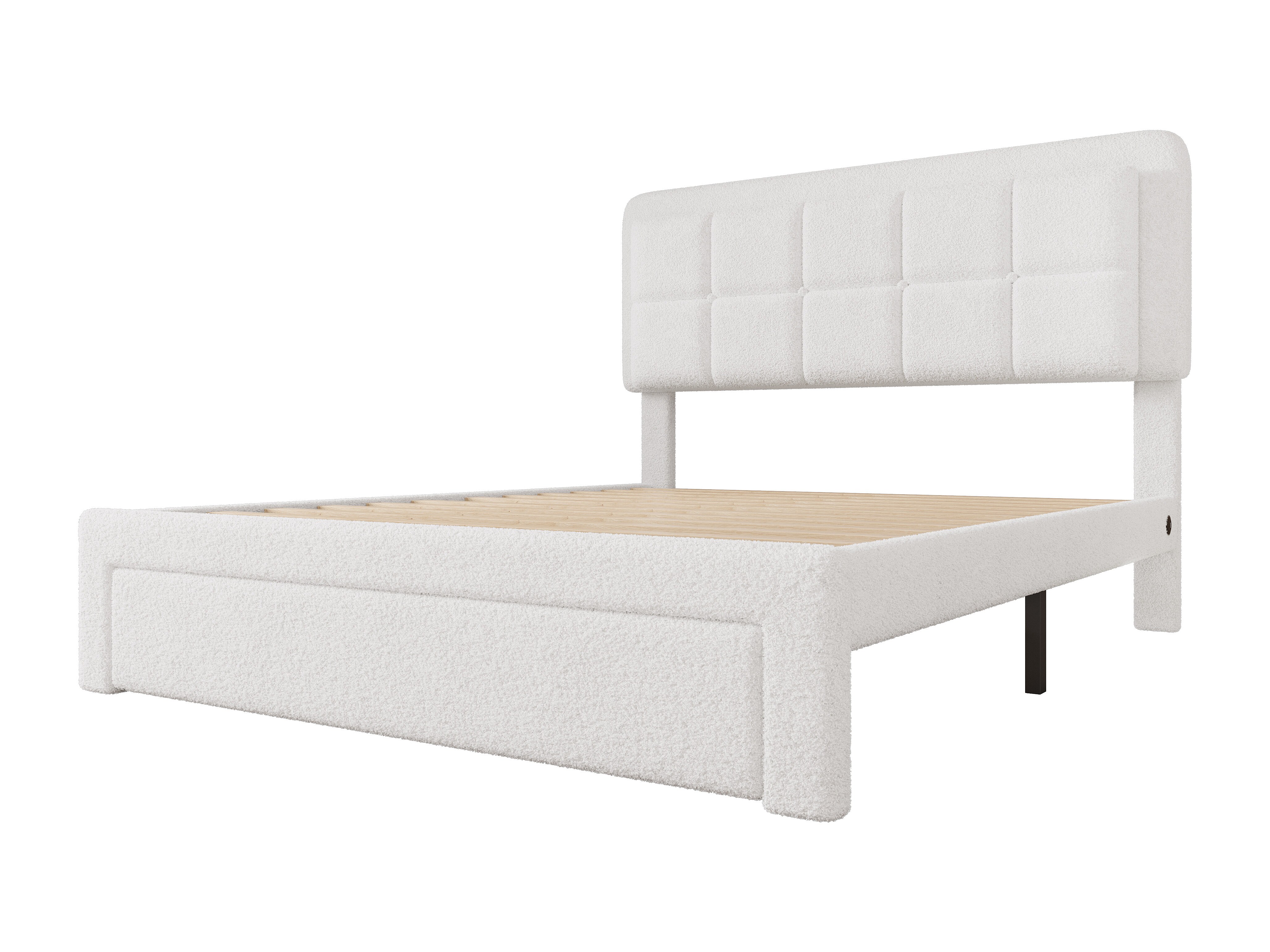 Volwassen bed 140x200 cm met LED en USB, 1 opberglade - wit pluche (zonder matras)