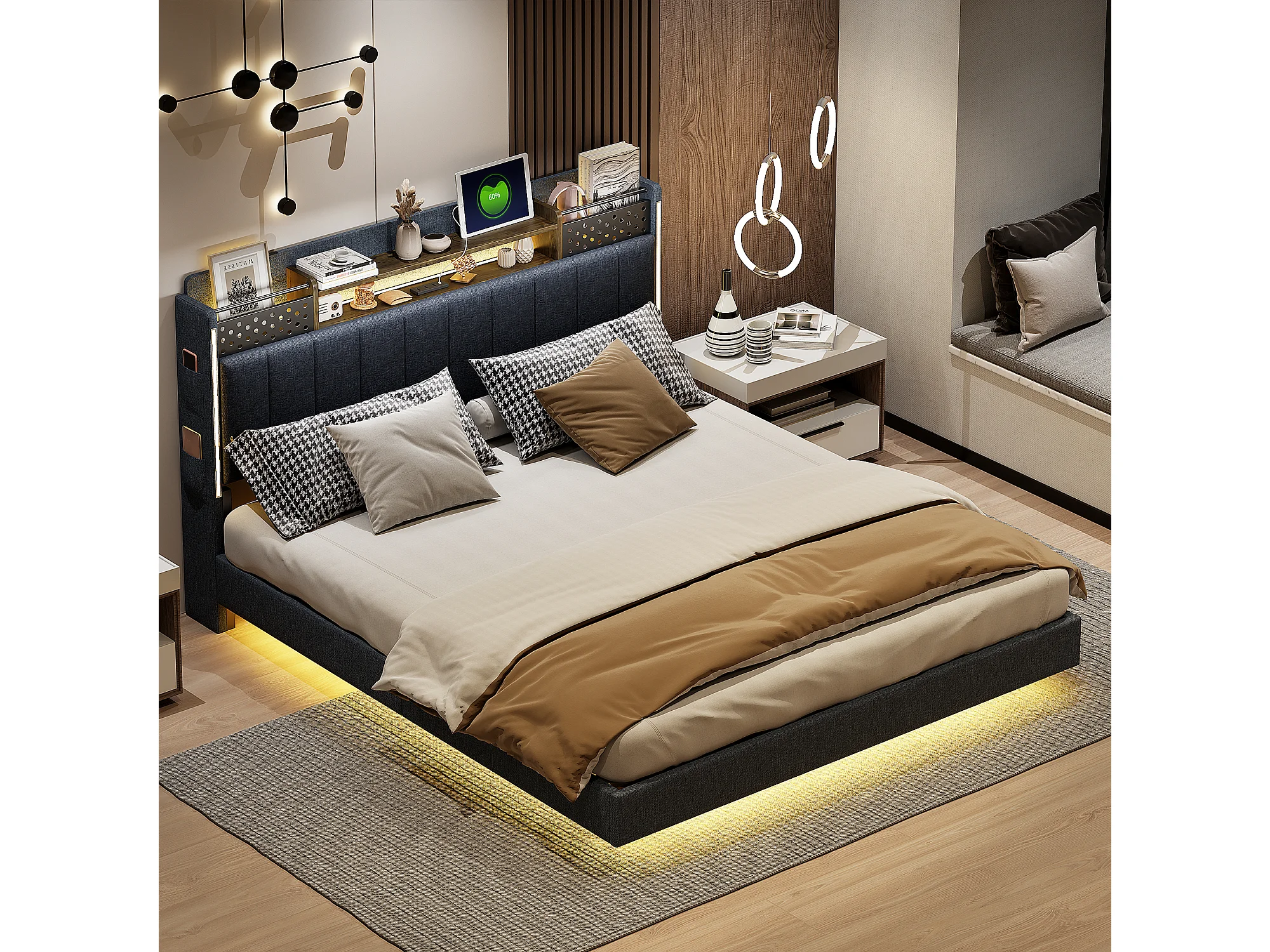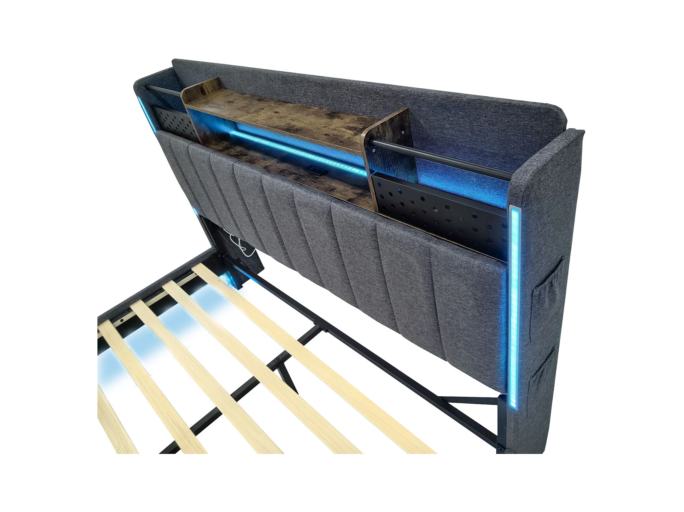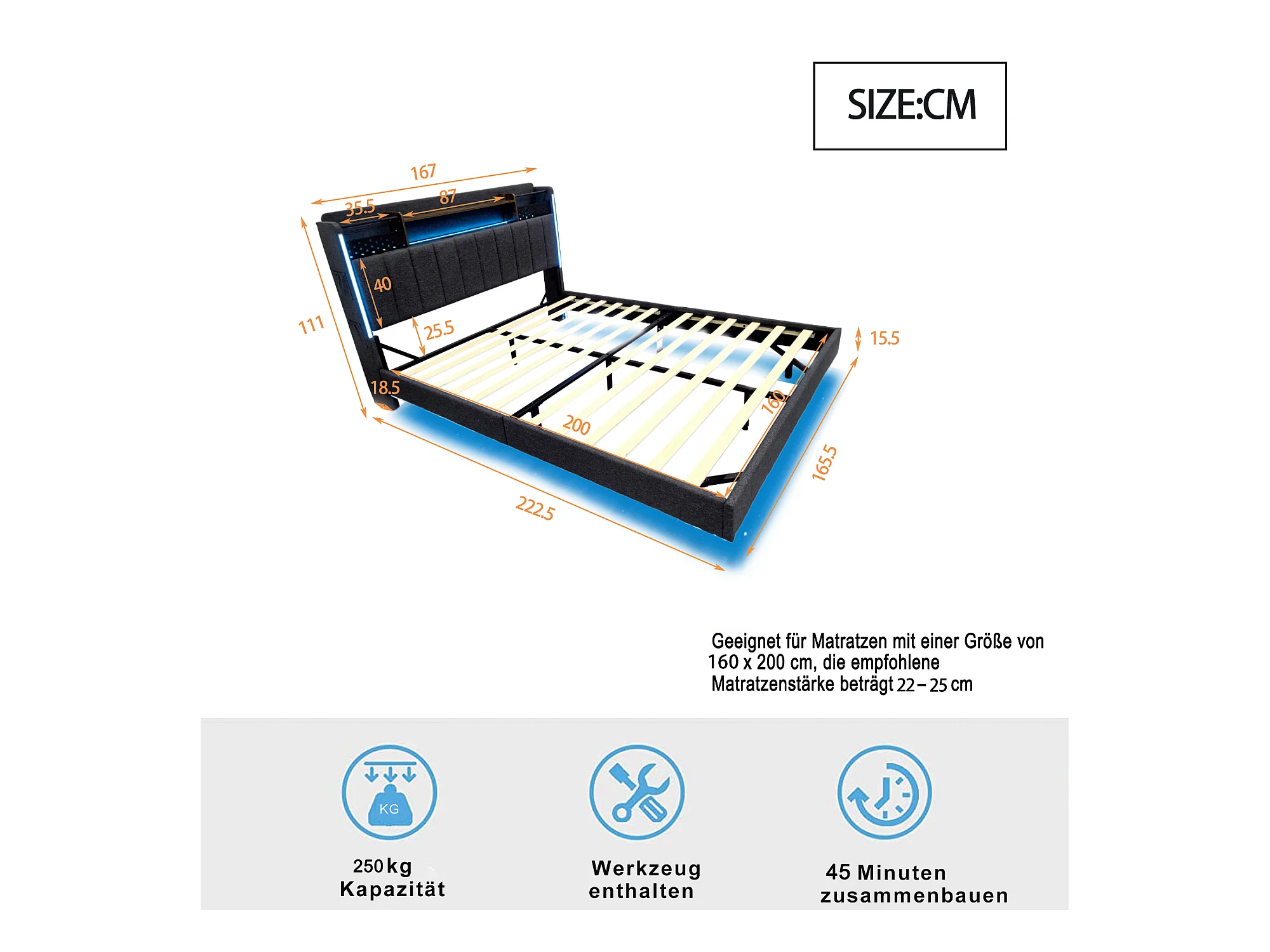 Volwassen bed 160x200 cm - Tweepersoonsbed met LED-verlichting en USB-oplader - grijs linnen - zonder matras