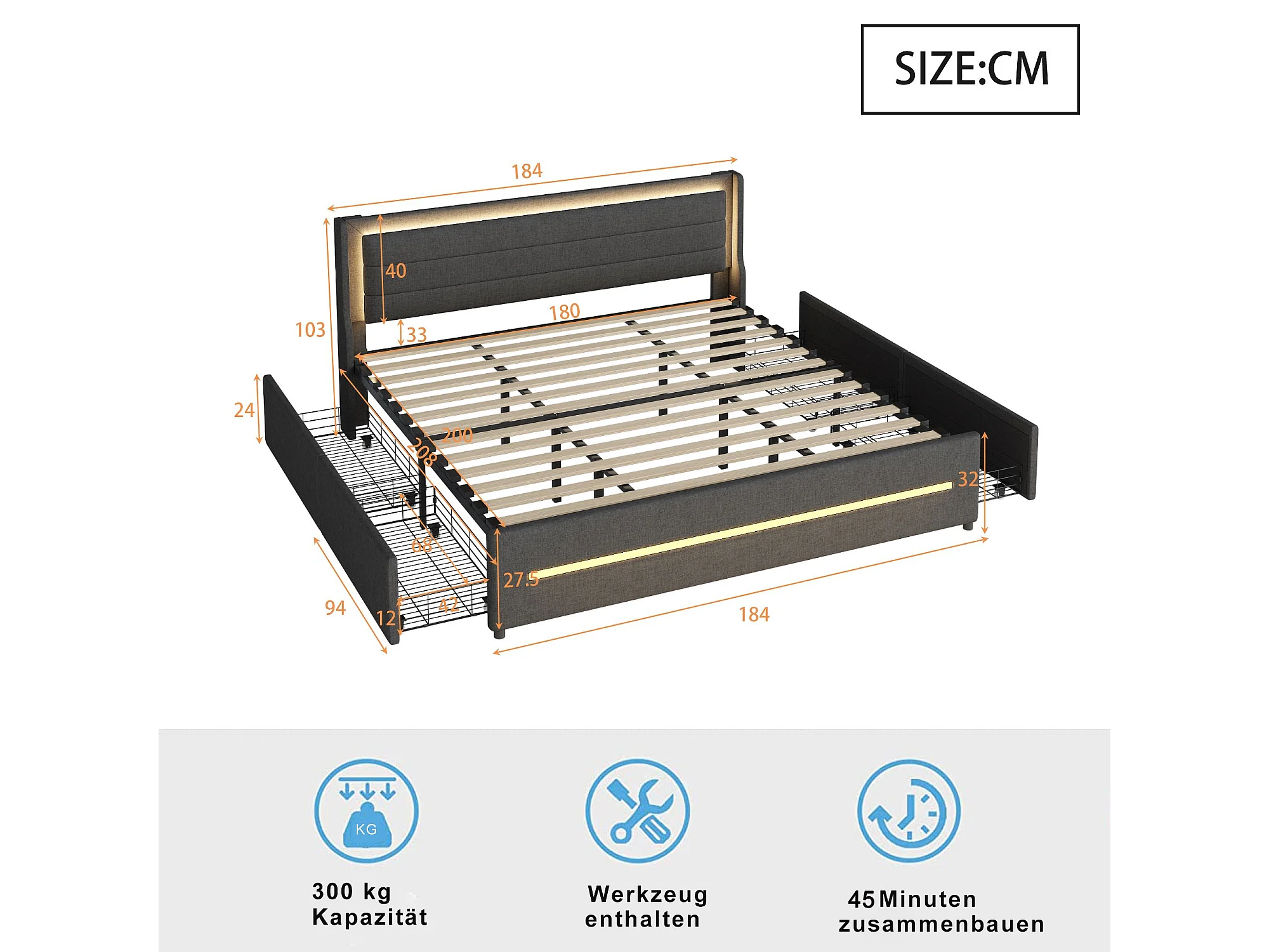Bed 180x200 cm grijs met 4 lades, gestoffeerd tweepersoonsbed voor volwassenen, met LED en USB-C, zonder matras, katoenlinnen