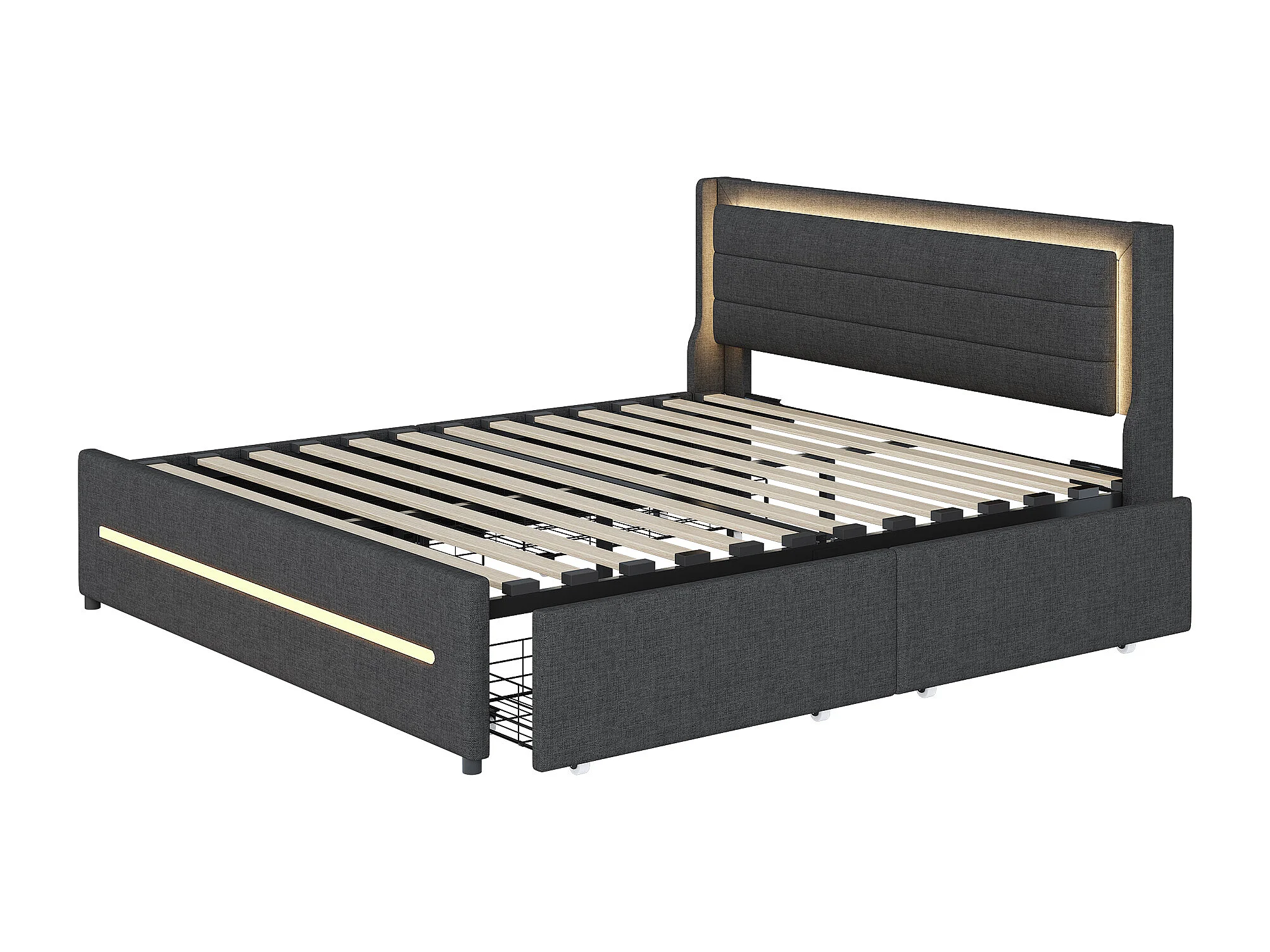 Volwassen bed 180x200 cm - met ledverlichting, 4 lades, hoofdbord, lattenbodem - in linnen - grijs - zonder matras