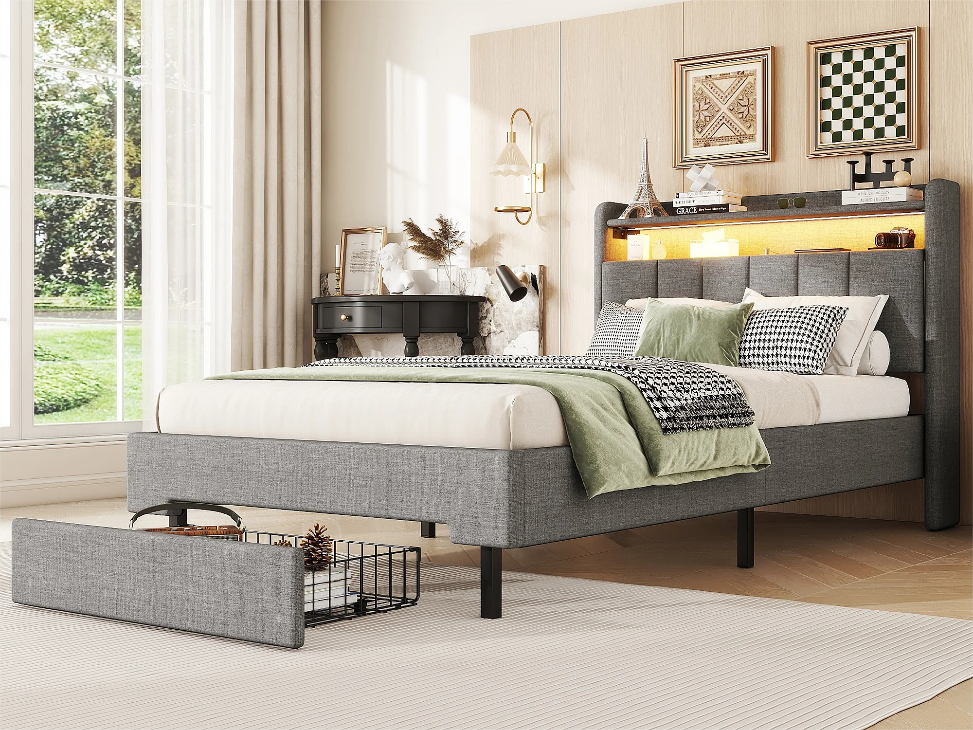 Volwassen bed 90x200 cm met LED en USB-aansluiting - opklapbaar opberghoofd - Grijs
