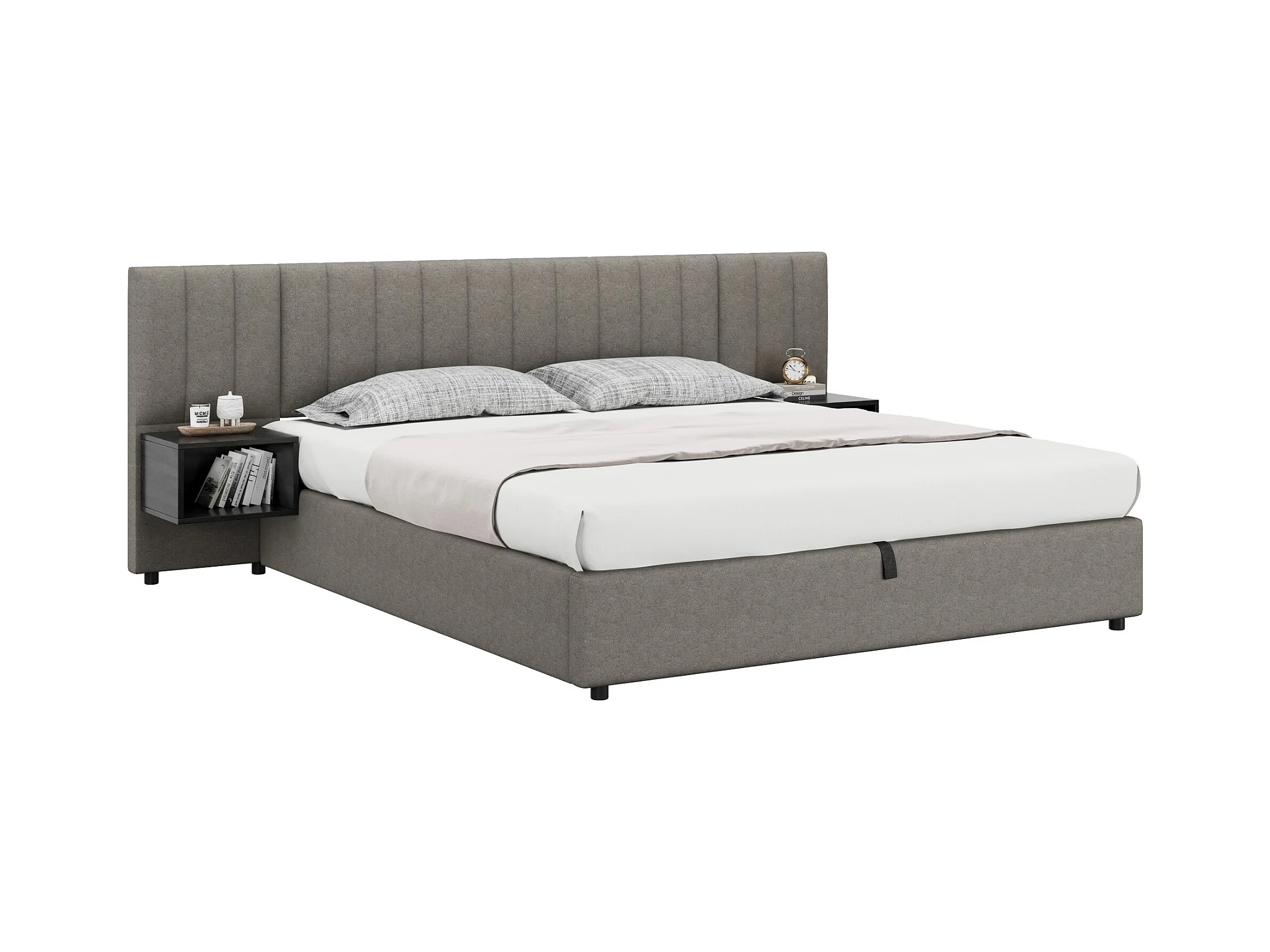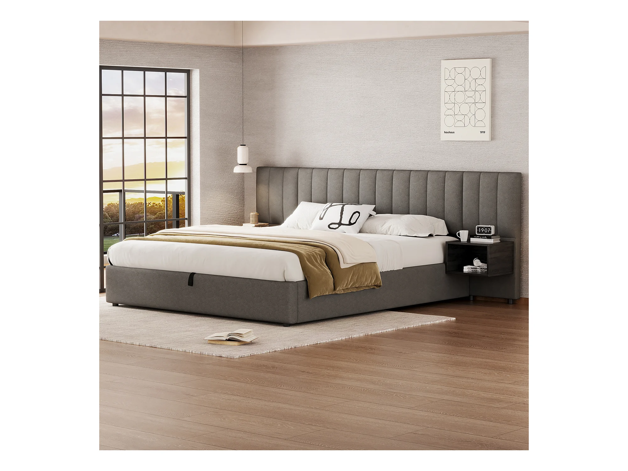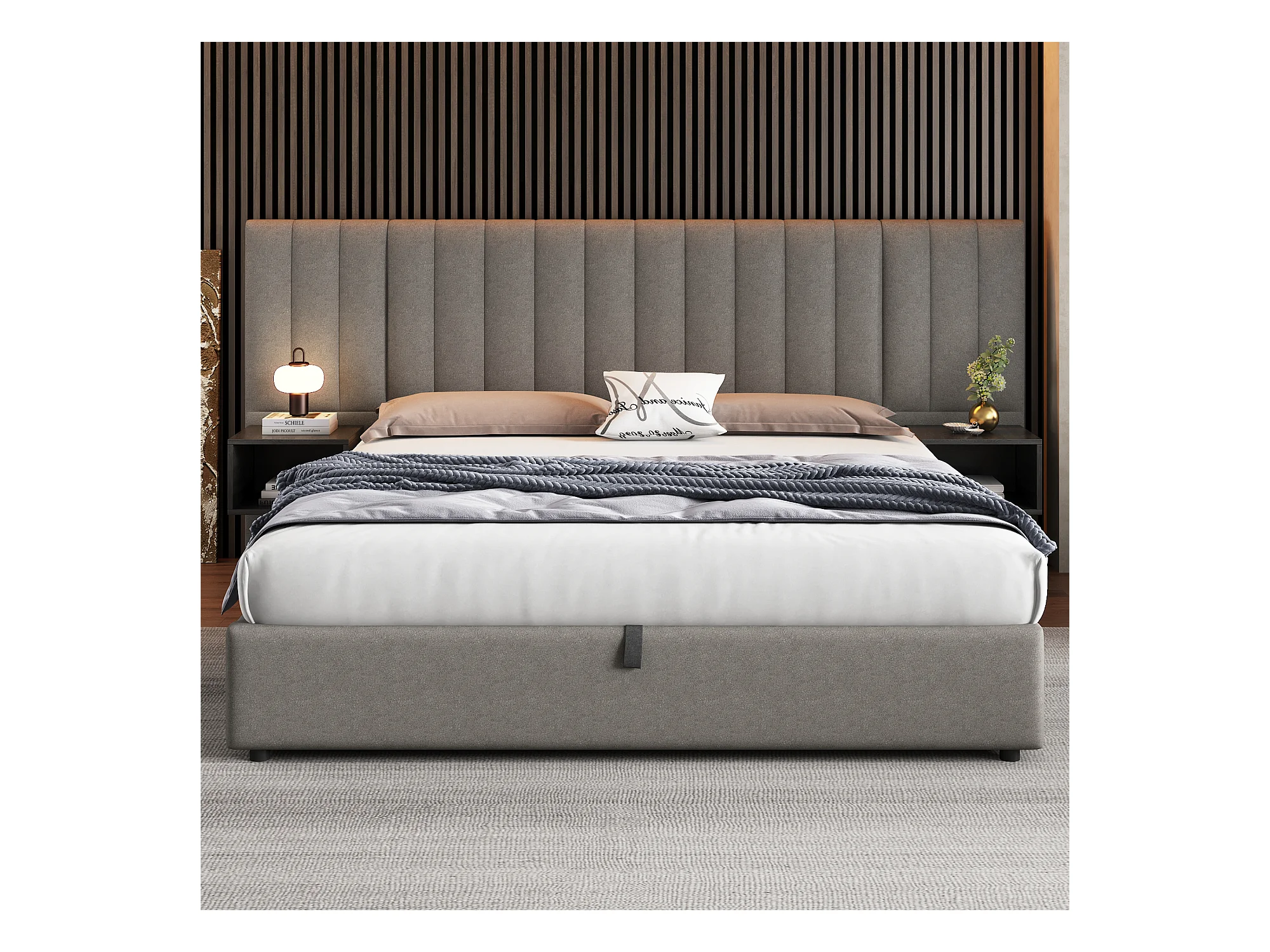 Volwassen opbergbed 180x200 cm met lattenbodem - gestoffeerd hoofdbord met 2 nachtkastjes - linnen - grijs (zonder matras)