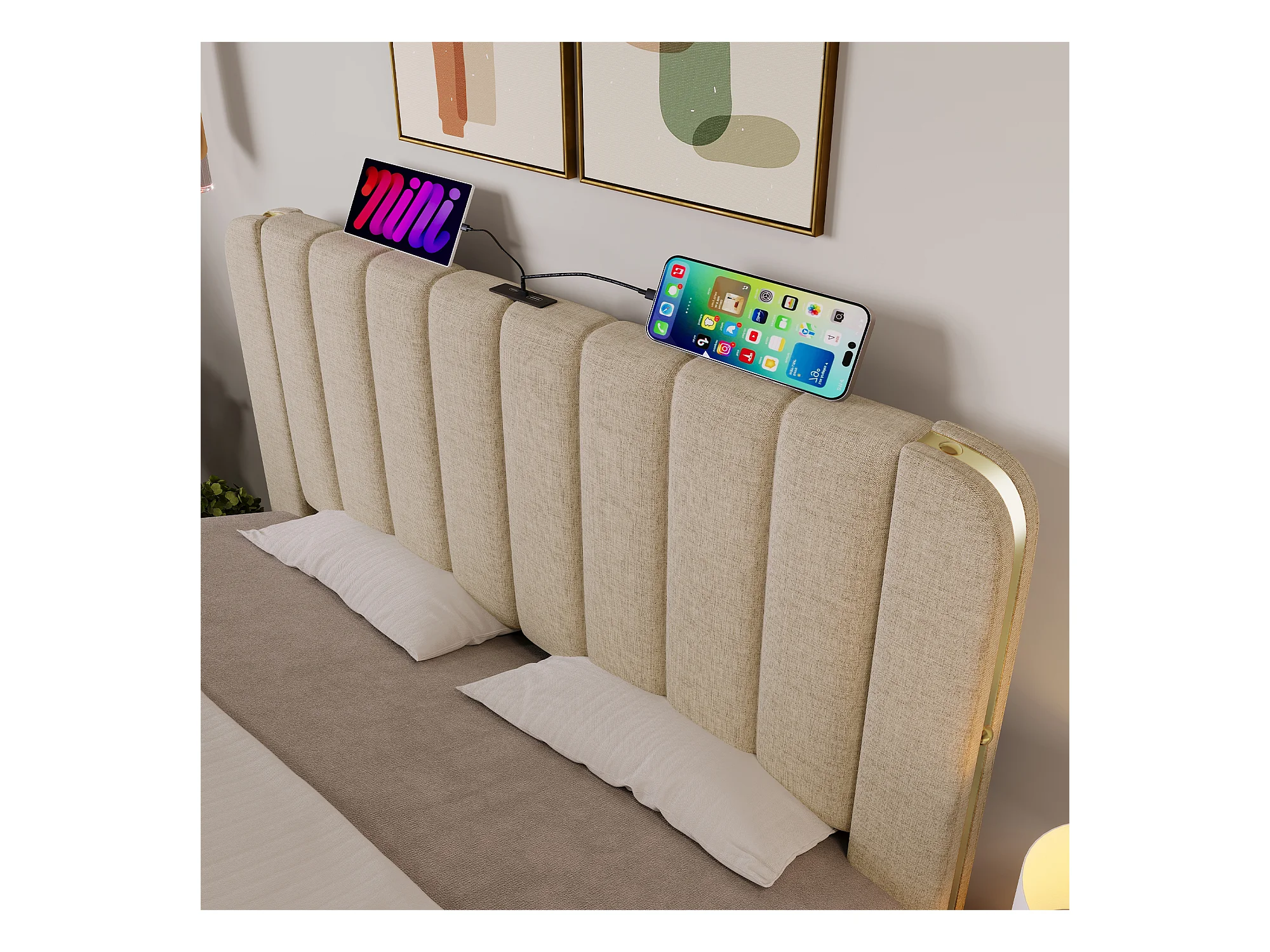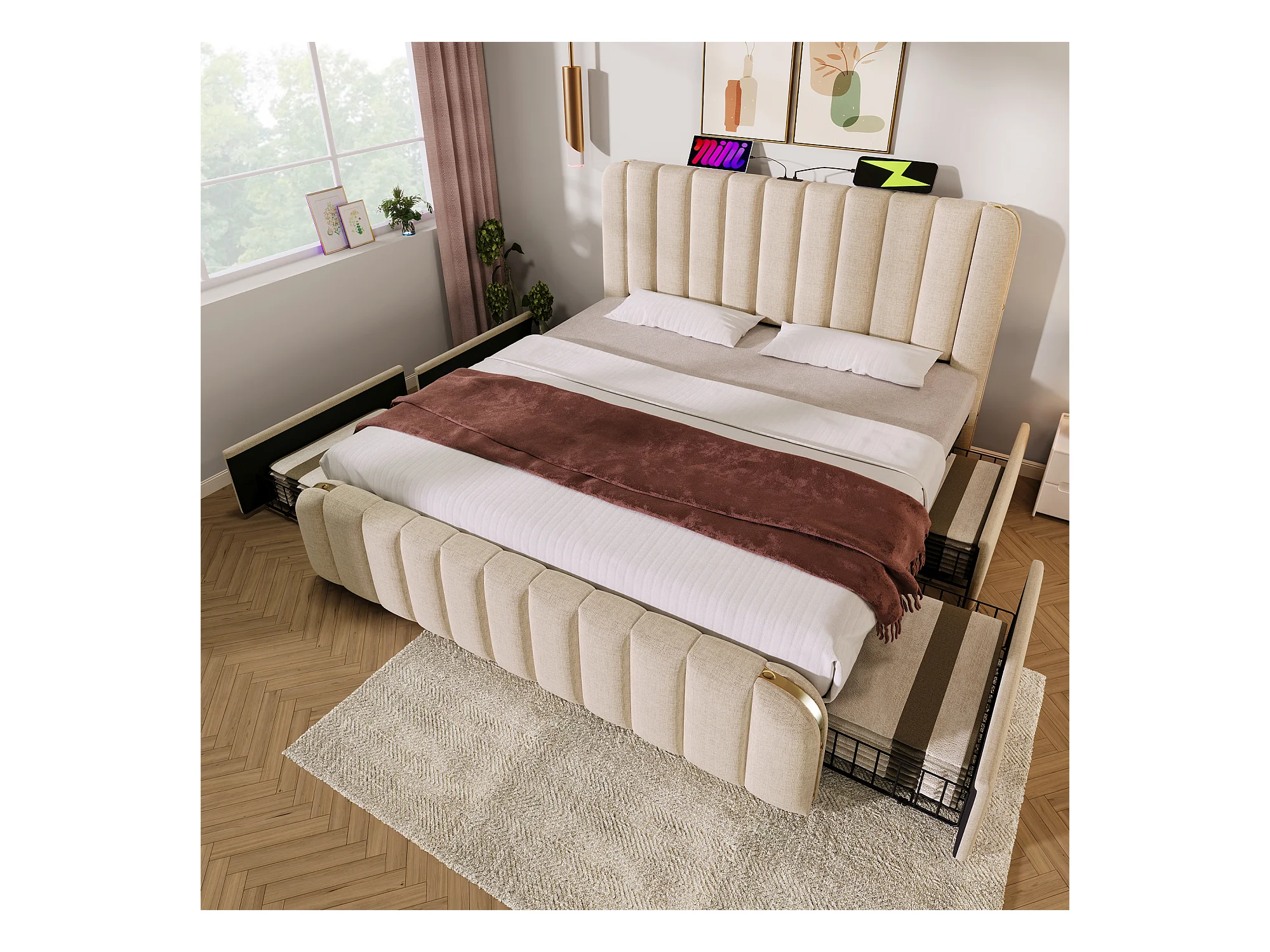Volwassen opbergbed 180x200 cm met onderstel - gewatteerd hoofdeinde met USB en 4 lades - linnen stof - beige (zonder matras)