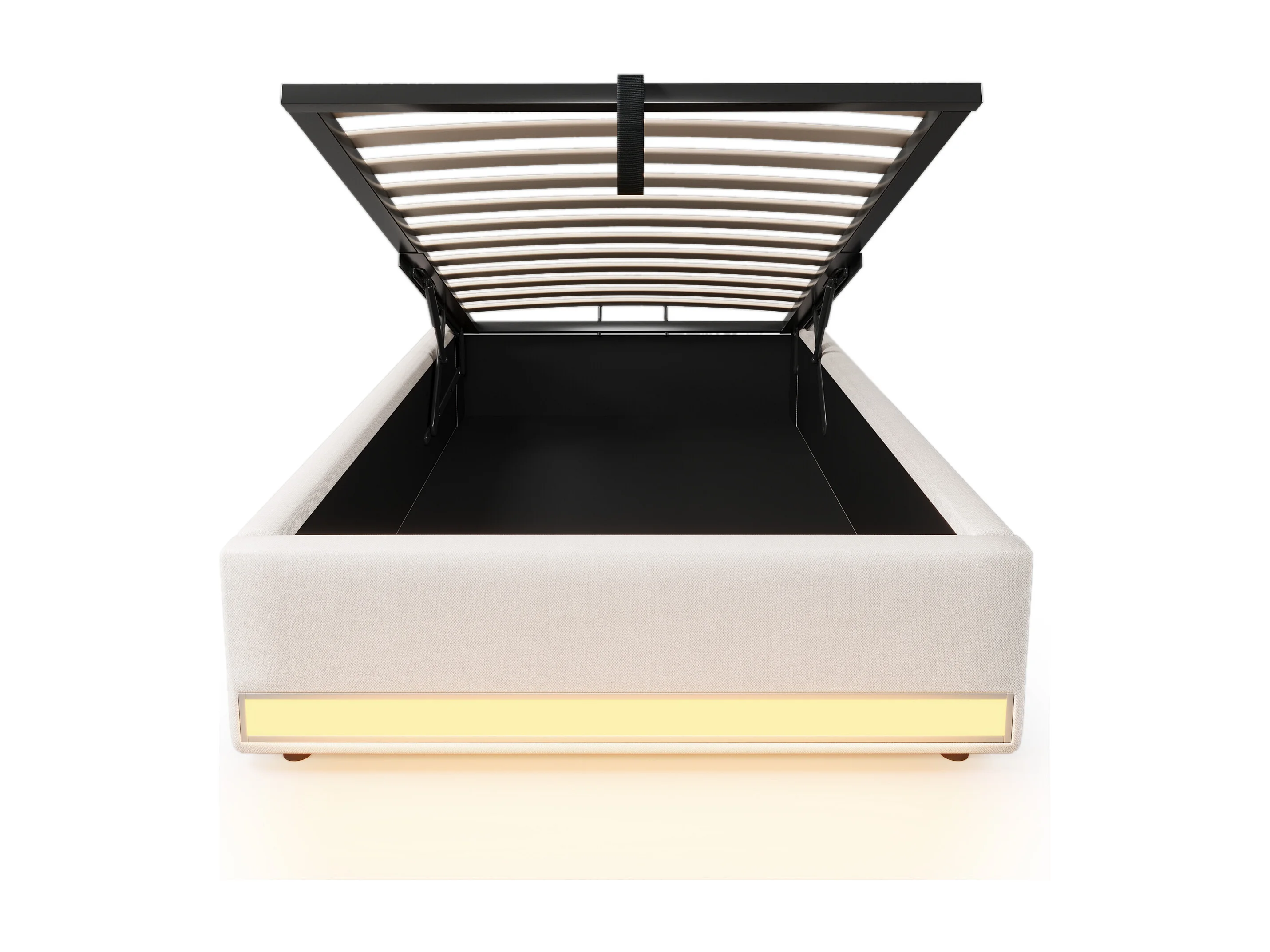 Volwassen opbergbed 90x200cm in beige linnen, zonder hoofdeinde, LED en USB inbegrepen, zonder matras