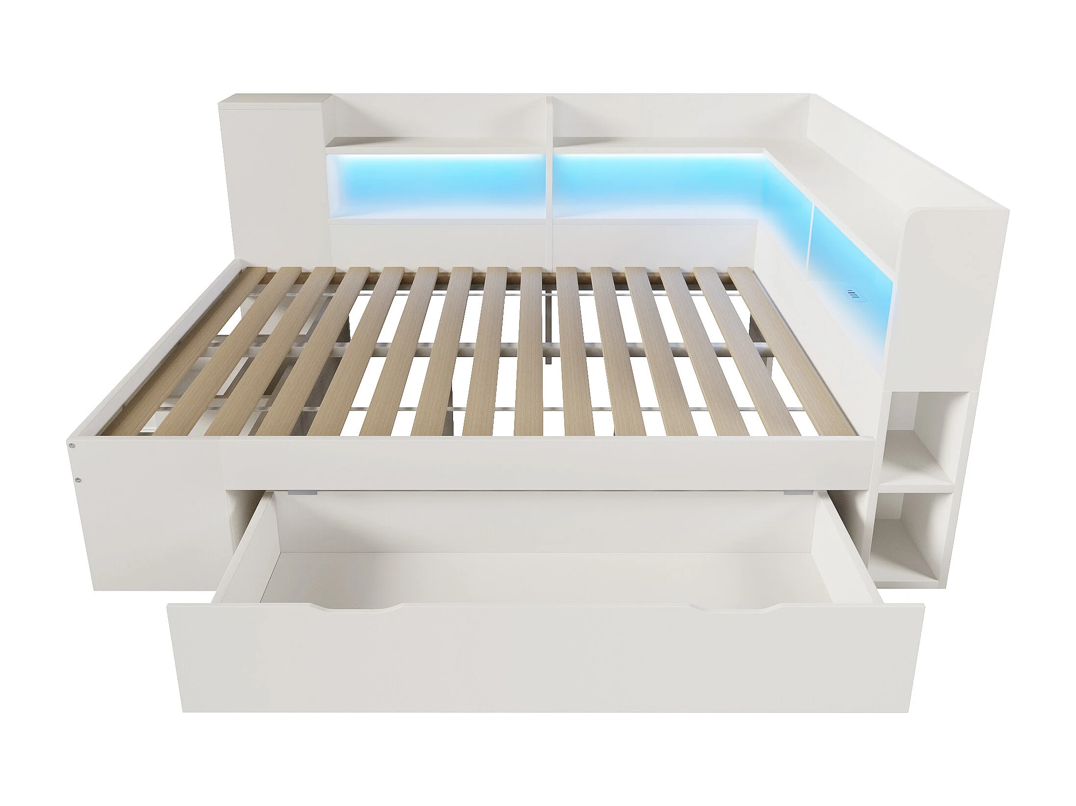 Volwassenenbed 140x200 cm, wit hout, met ledverlichting, USB-poorten, planken en lades (inclusief matras).