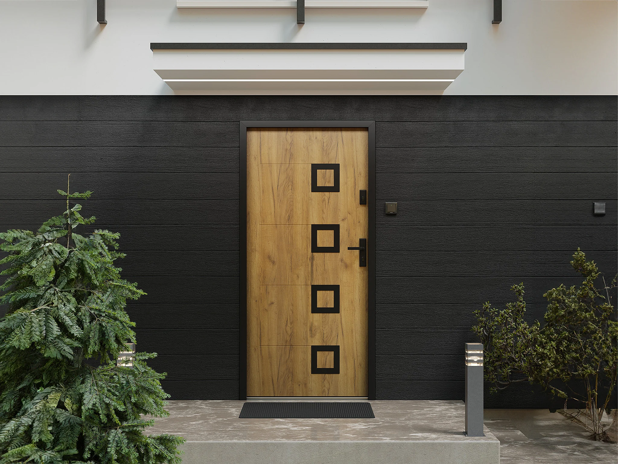 Voordeur van staal met inox L207 x L100 cm, eikeneffect - Duwt links open - TIFANA
