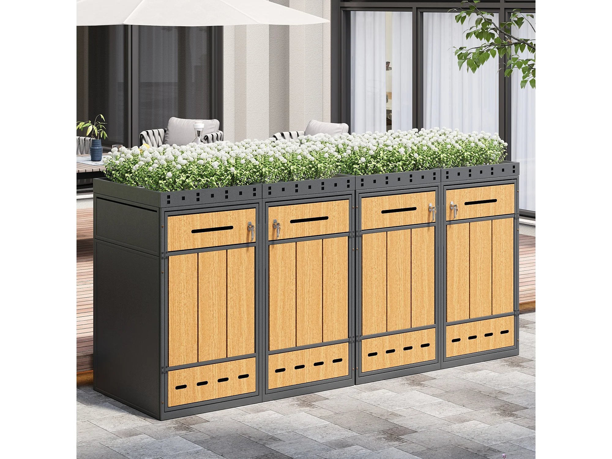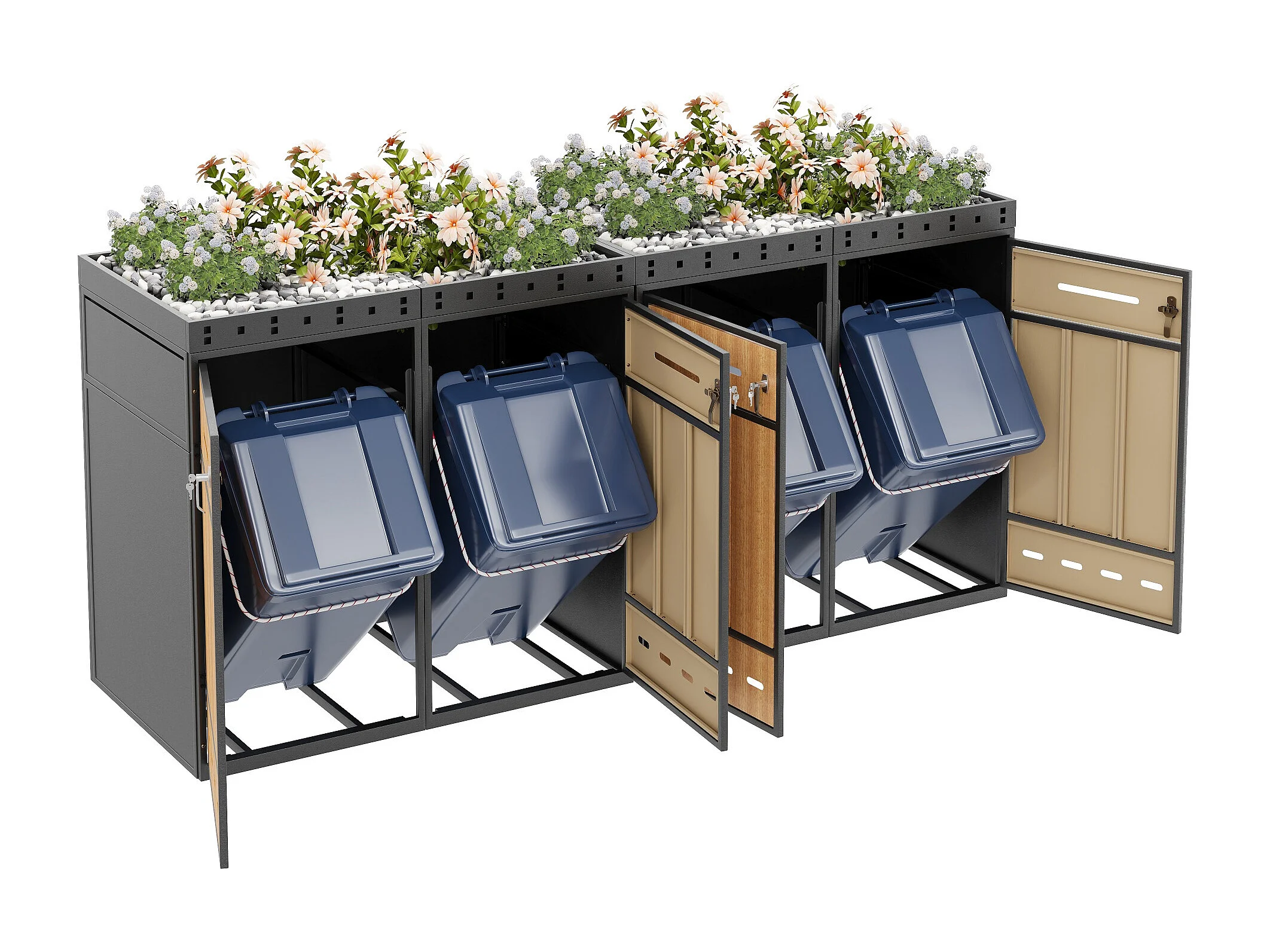 Vuilnisbakkenhuis met groen dak - 2 x 132 x 80 x 124 cm - capaciteit 120-240 liter - met 4 deuren - metaal - grijs + natuur