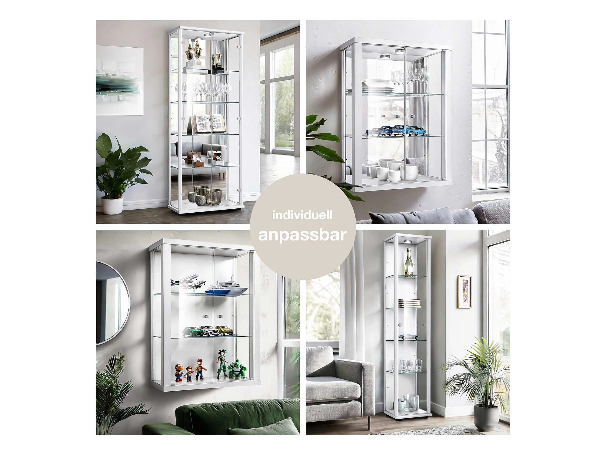 Vitrinekast van gehard glas met 2 niveaus, deur, wit metalen frame en geïntegreerde ledverlichting - Modern en elegant design
