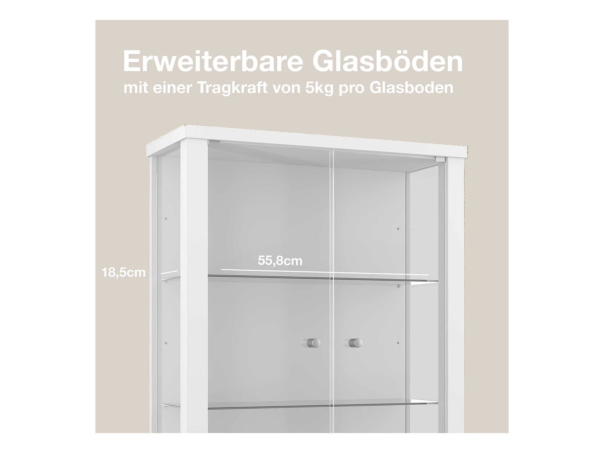 Staande vitrine met 2 deuren, 4 in hoogte verstelbare glasplanken - Met LED-verlichting - 176x67x33 cm - Wit