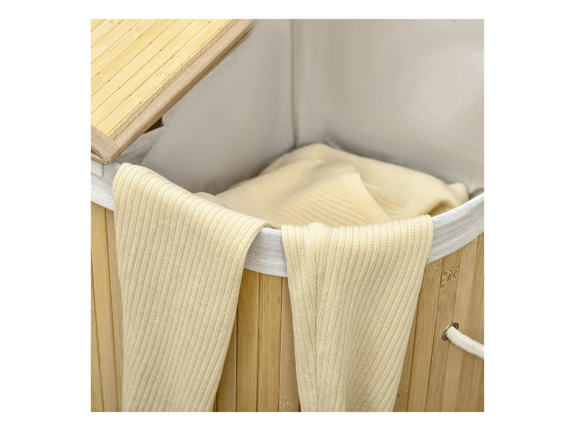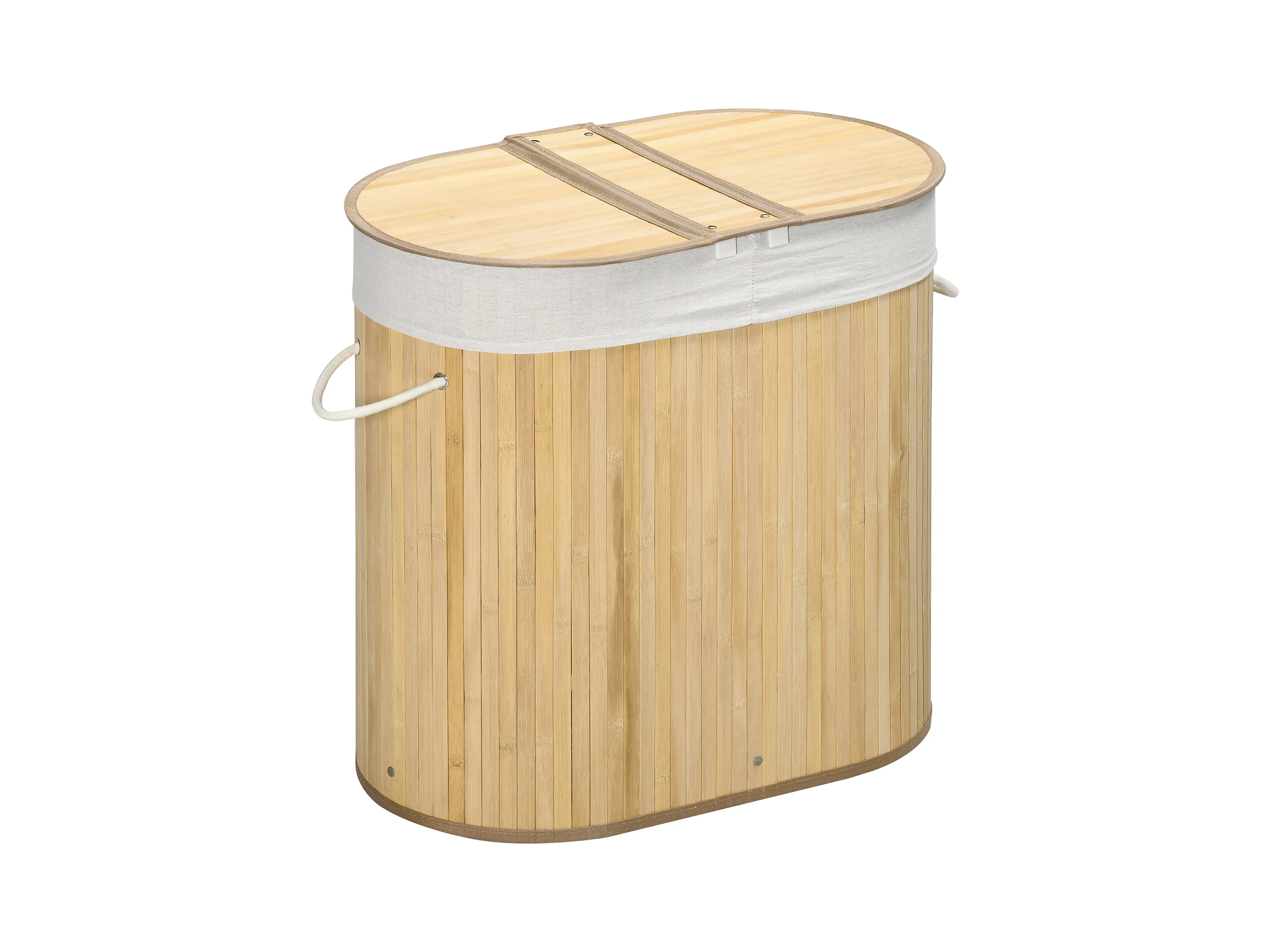 Bamboe wasmand met deksel, 2 compartimenten, 90L, met uitneembare tas, naturel (54,2x35,2x59,5 cm)