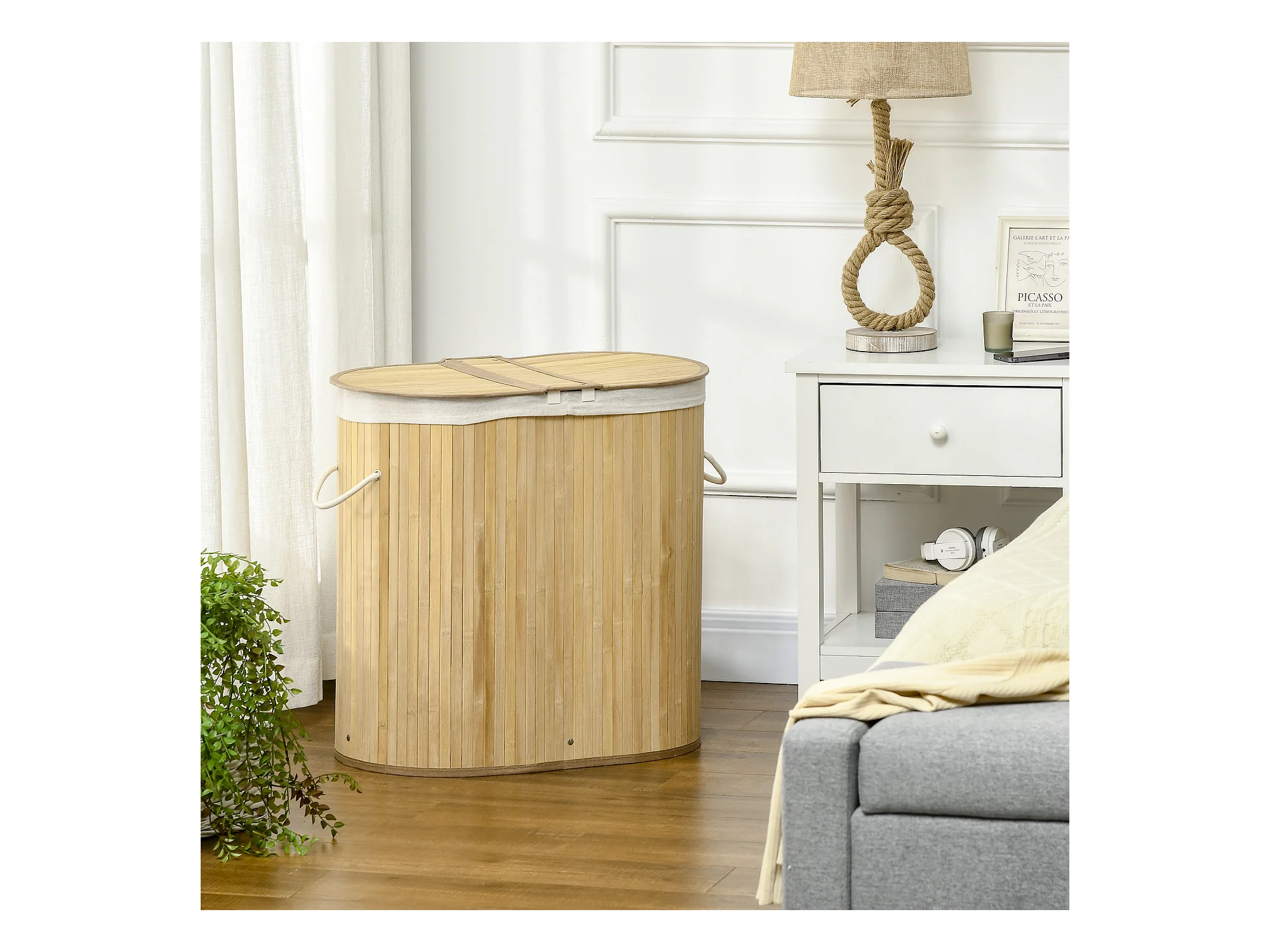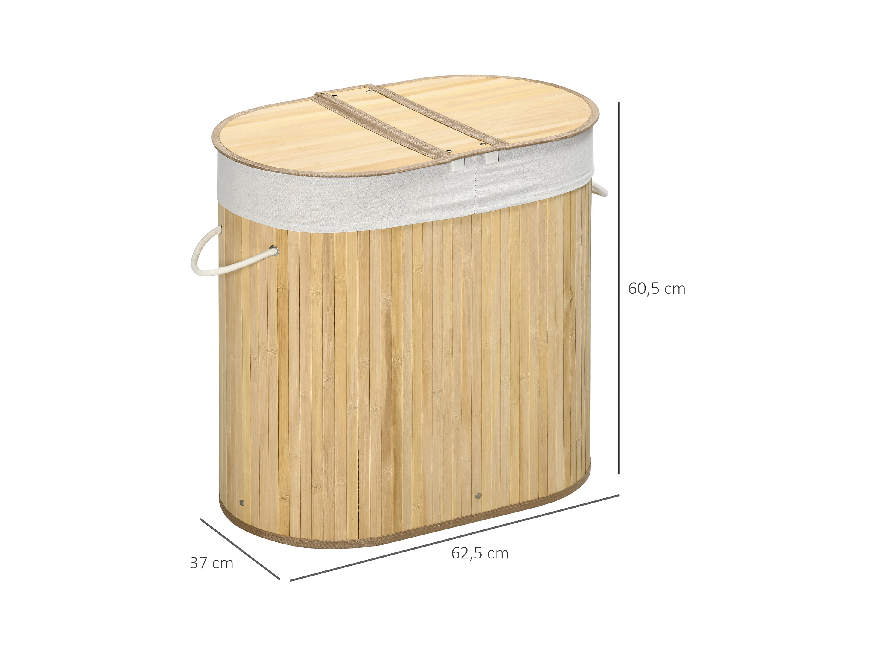 Wasmand met deksel, 2 uitneembare compartimenten, natuurlijk bamboe, georganiseerd en geventileerd (62,5 x 37 x 60,5 cm)