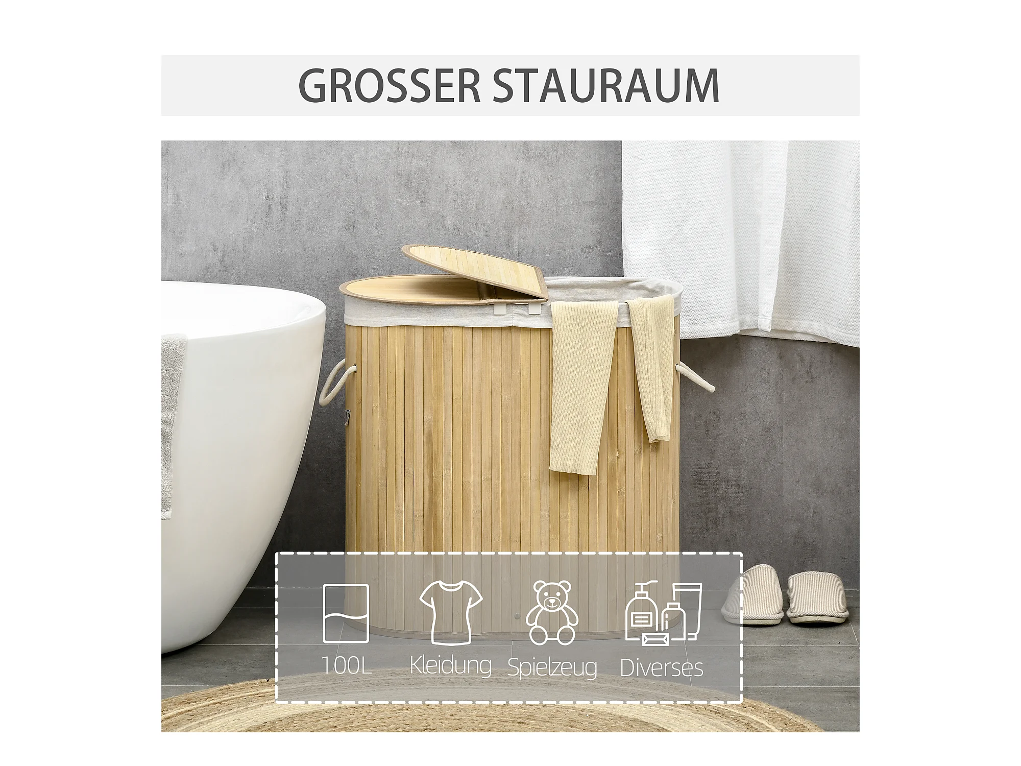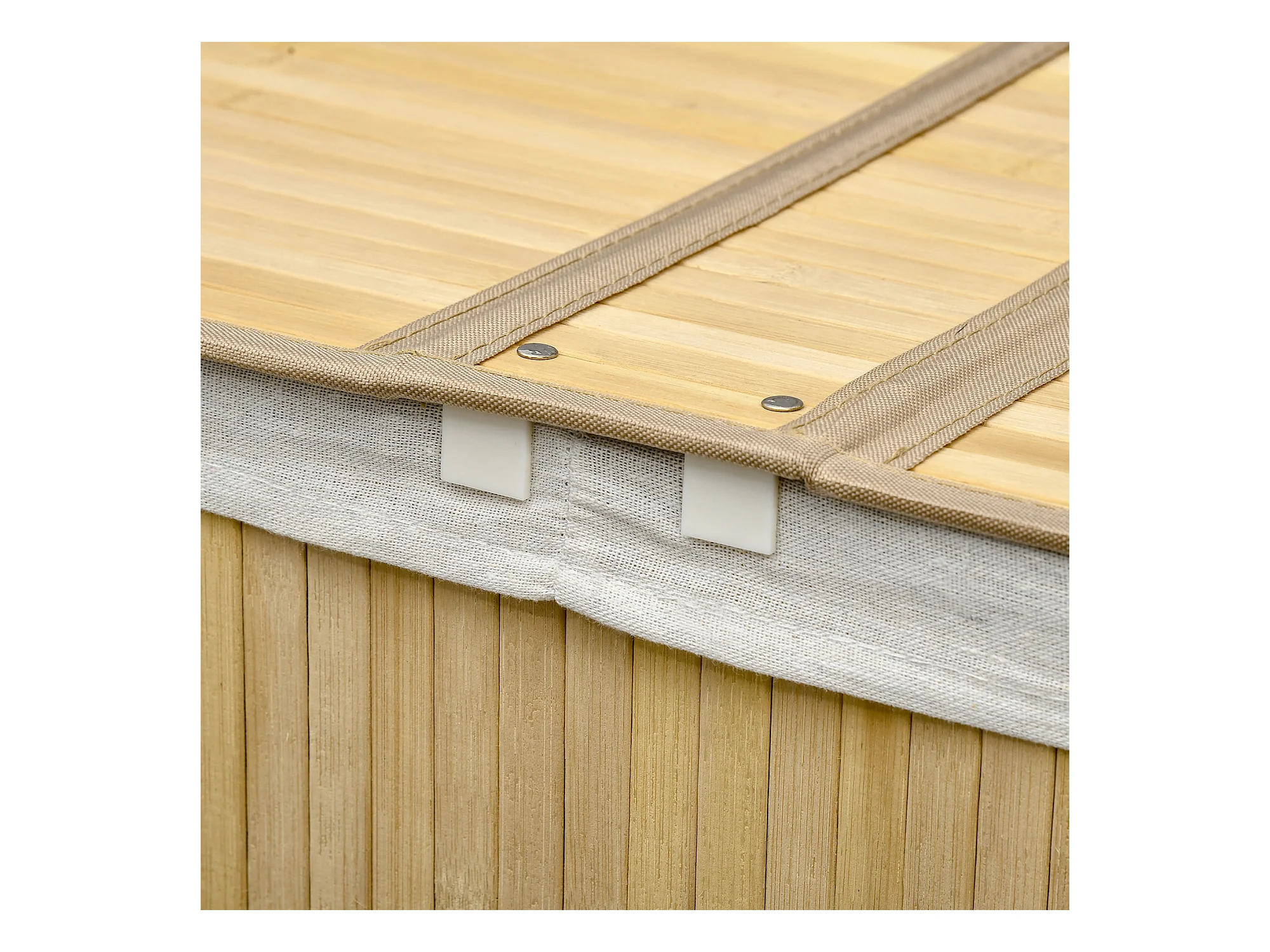 Wasmand 63 L, bamboe mand met deksel, afneembare tas, stof, naturel (44x37x62,5 cm)