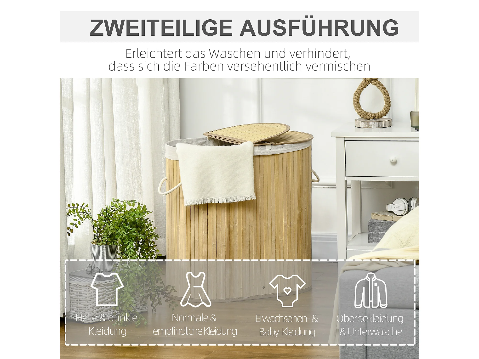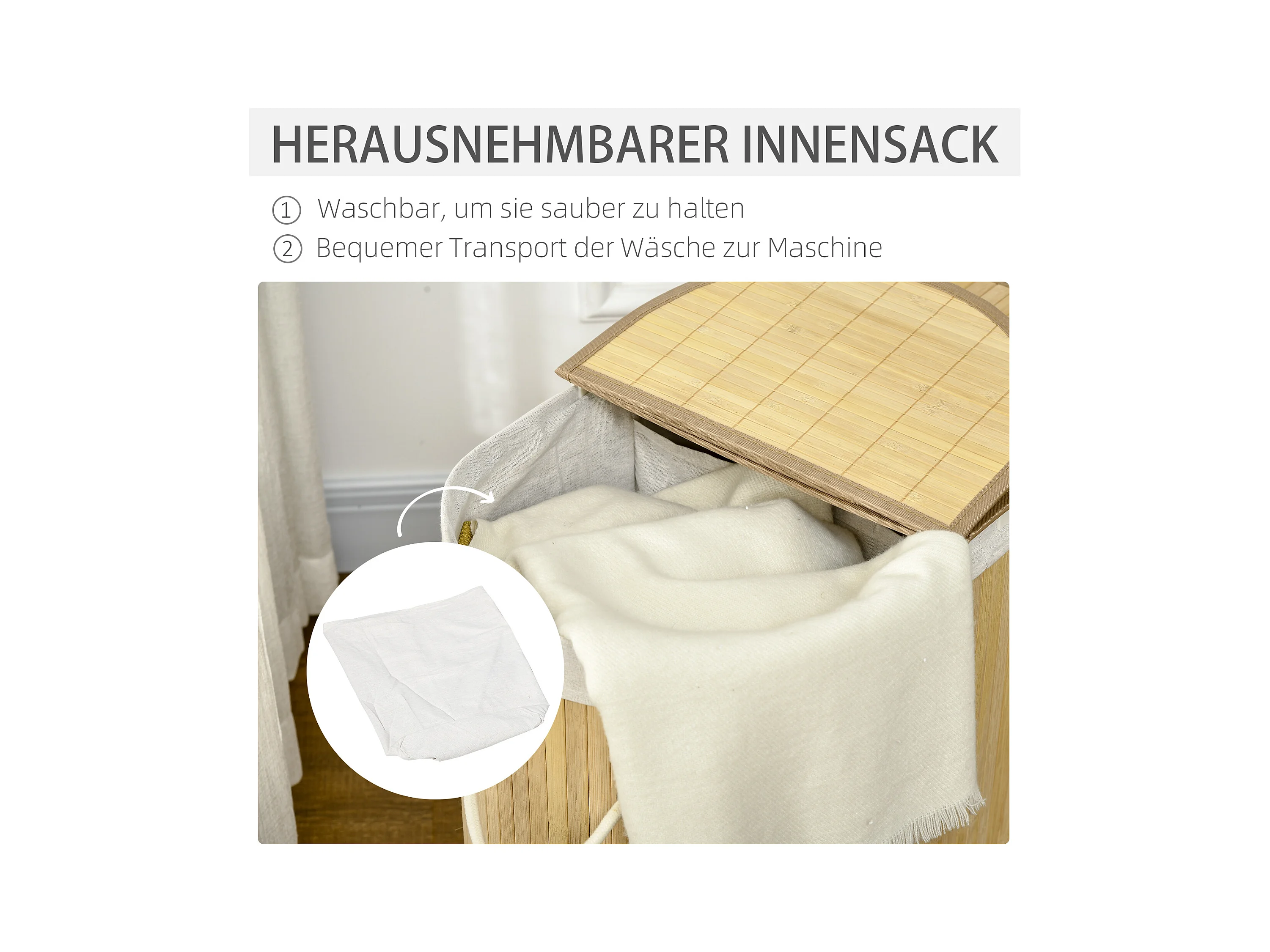 Wasmand met 2 uitneembare zakken, natuurlijk bamboe, compact en praktisch design, crème (63,5x33x73cm)