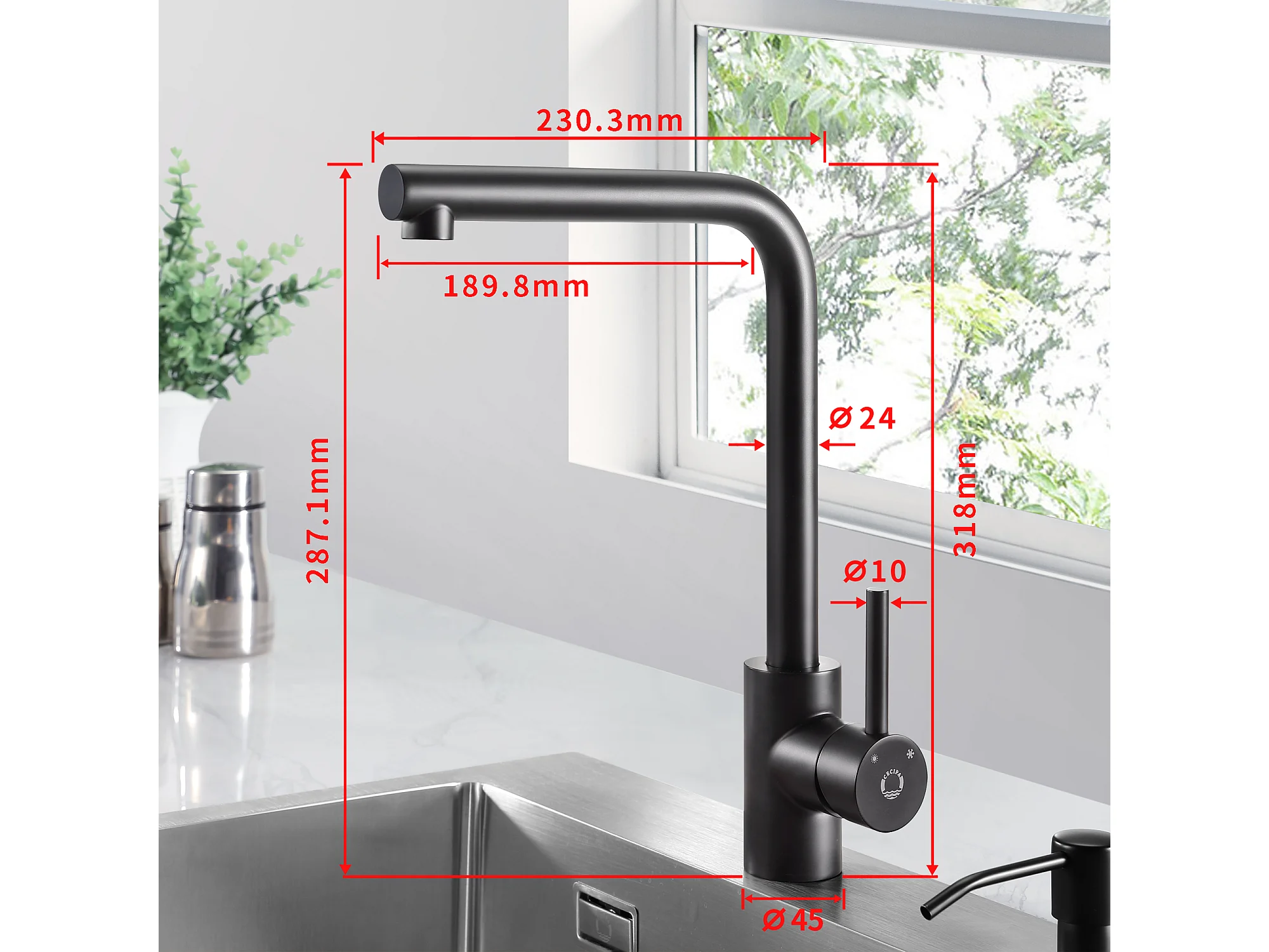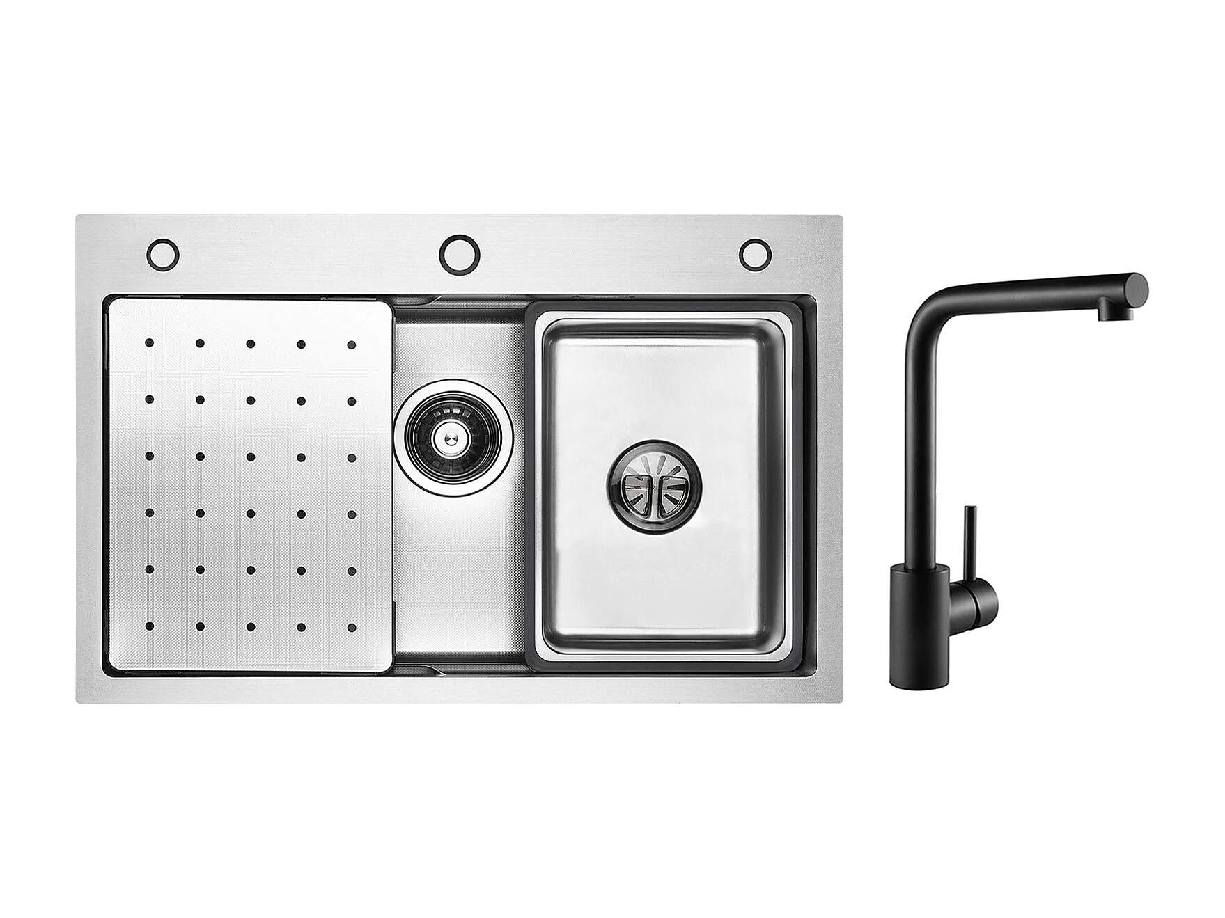 wastafel, 70 x 45 cm, zilveren roestvrijstalen spoelbak met afdruiprek, wastafel, zeepdispenser + 360° draaibare zwarte spoelbakmengkraan