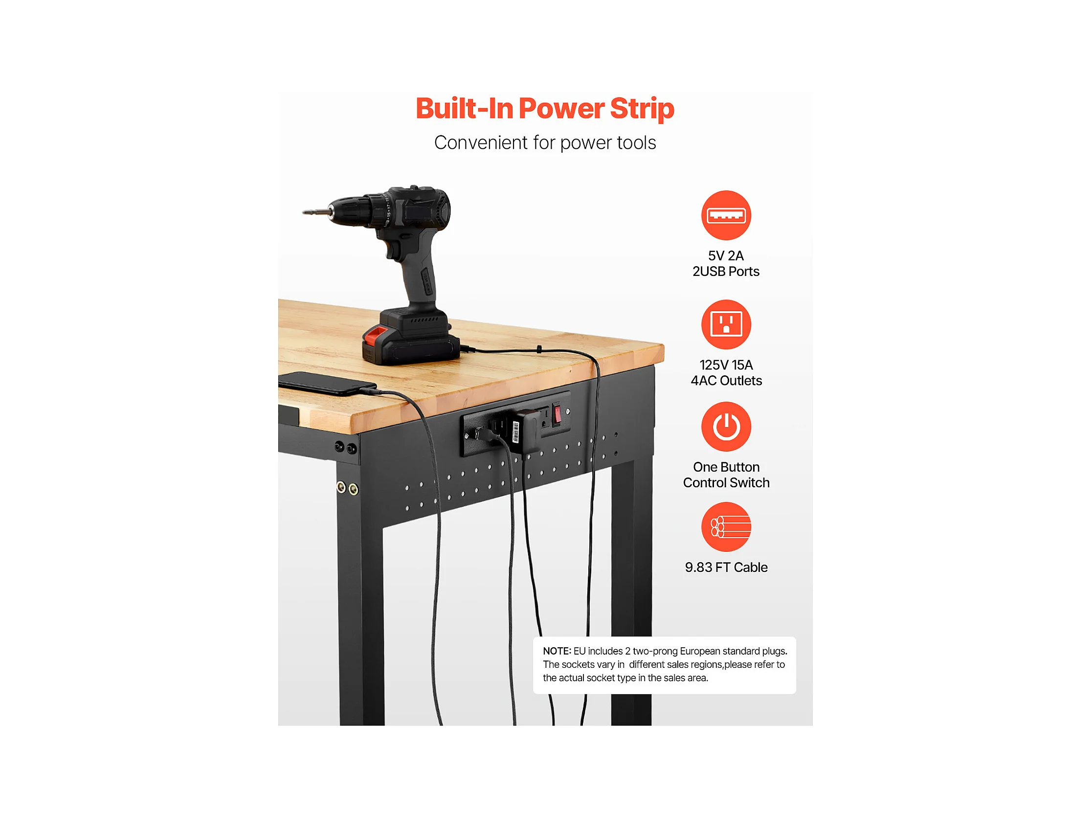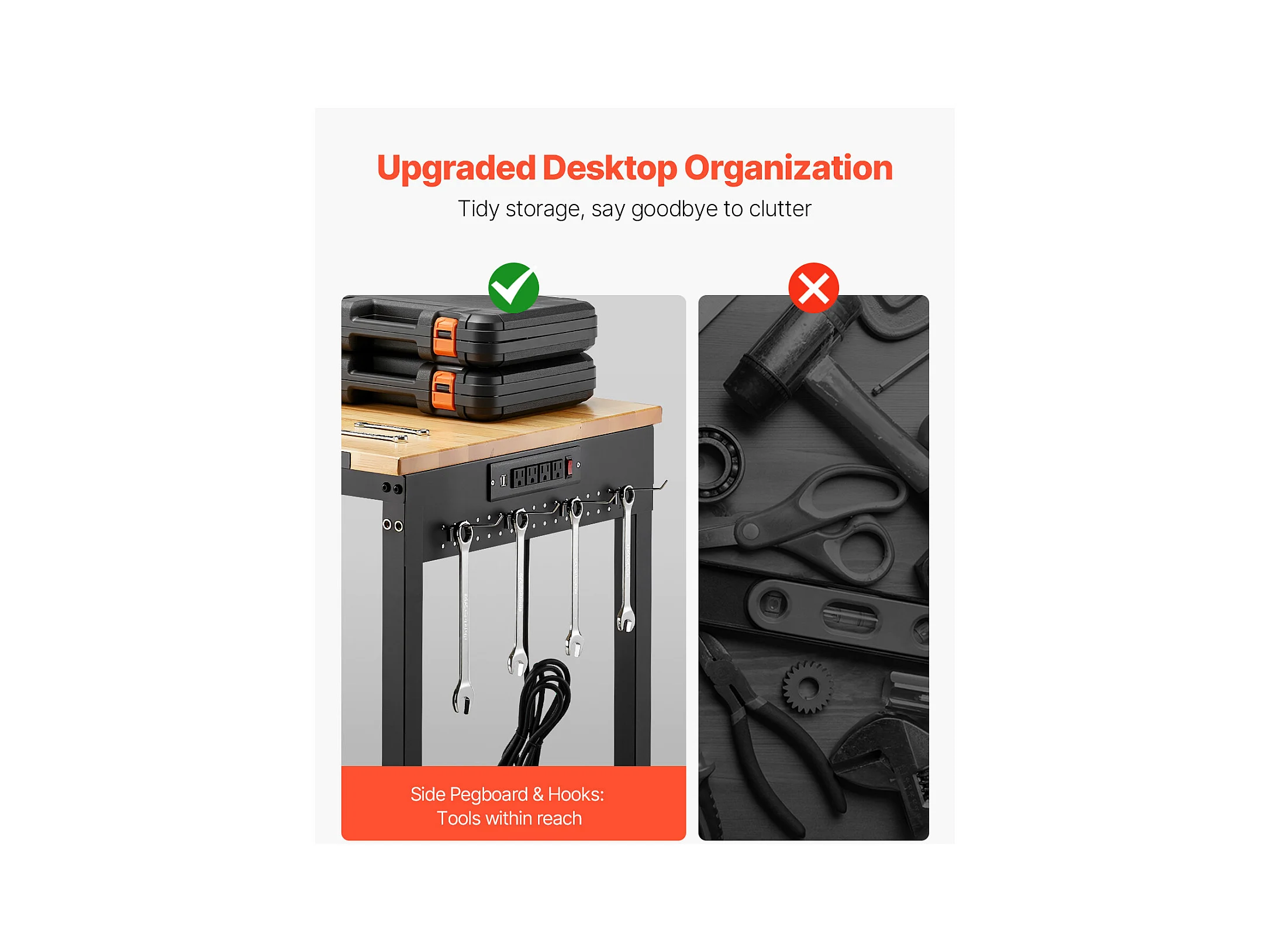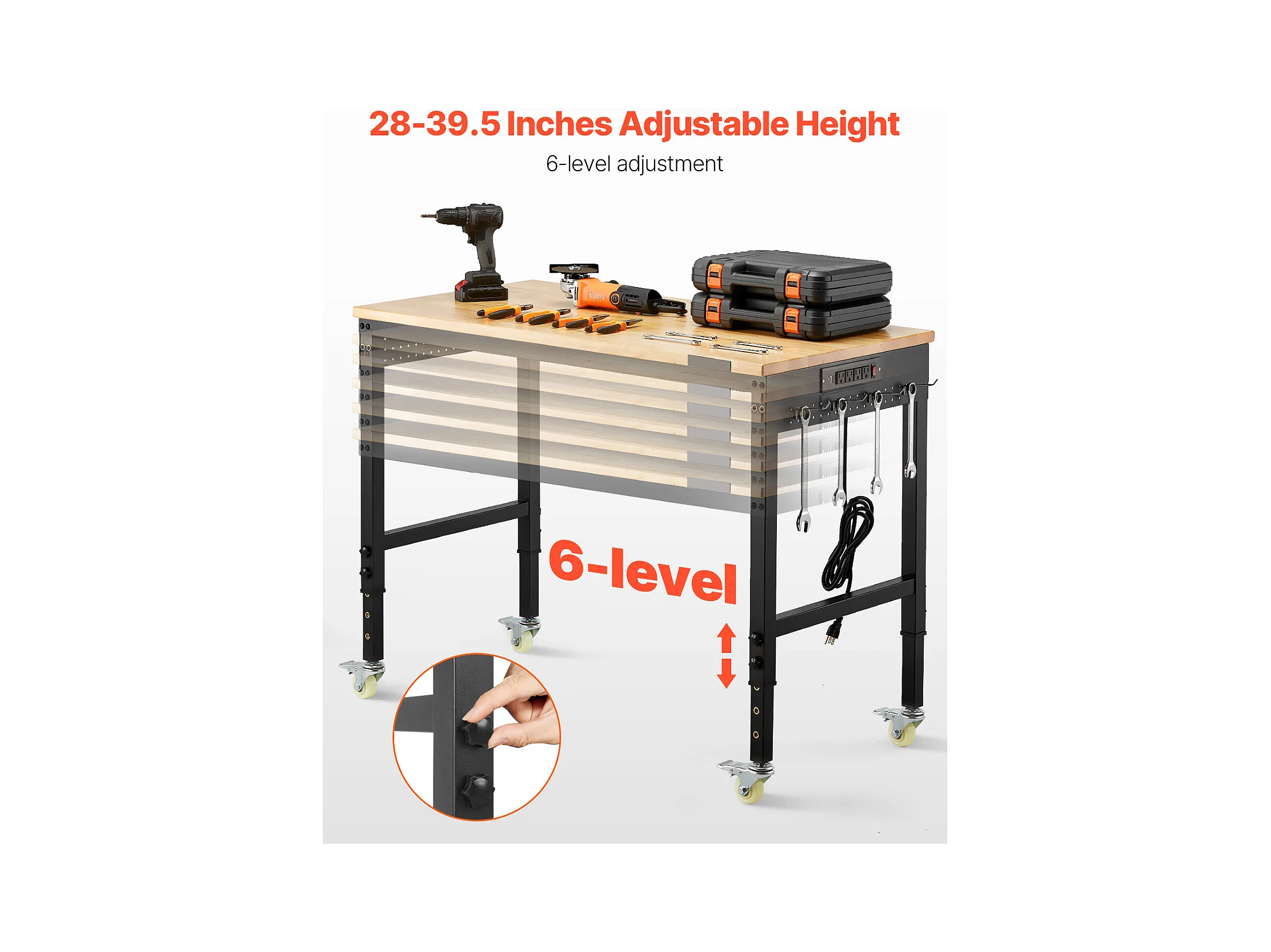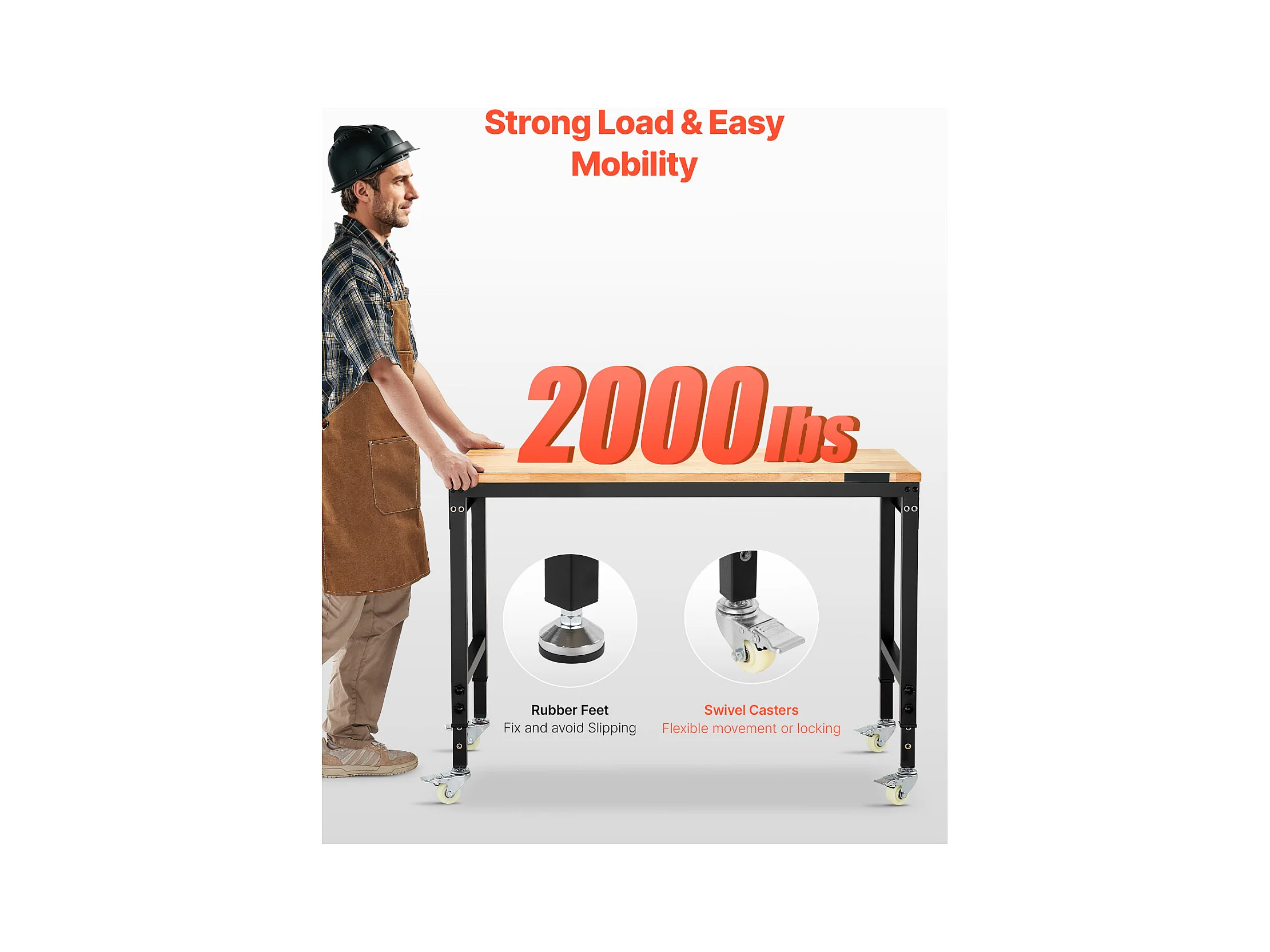 Werkbank voor Garage SucceBuy, 122 cm, Werktafel op Wieltjes met Verstelbare Hoogte, Draagvermogen 907,2 kg, van Eikenhout voor Kantoor, Thuis