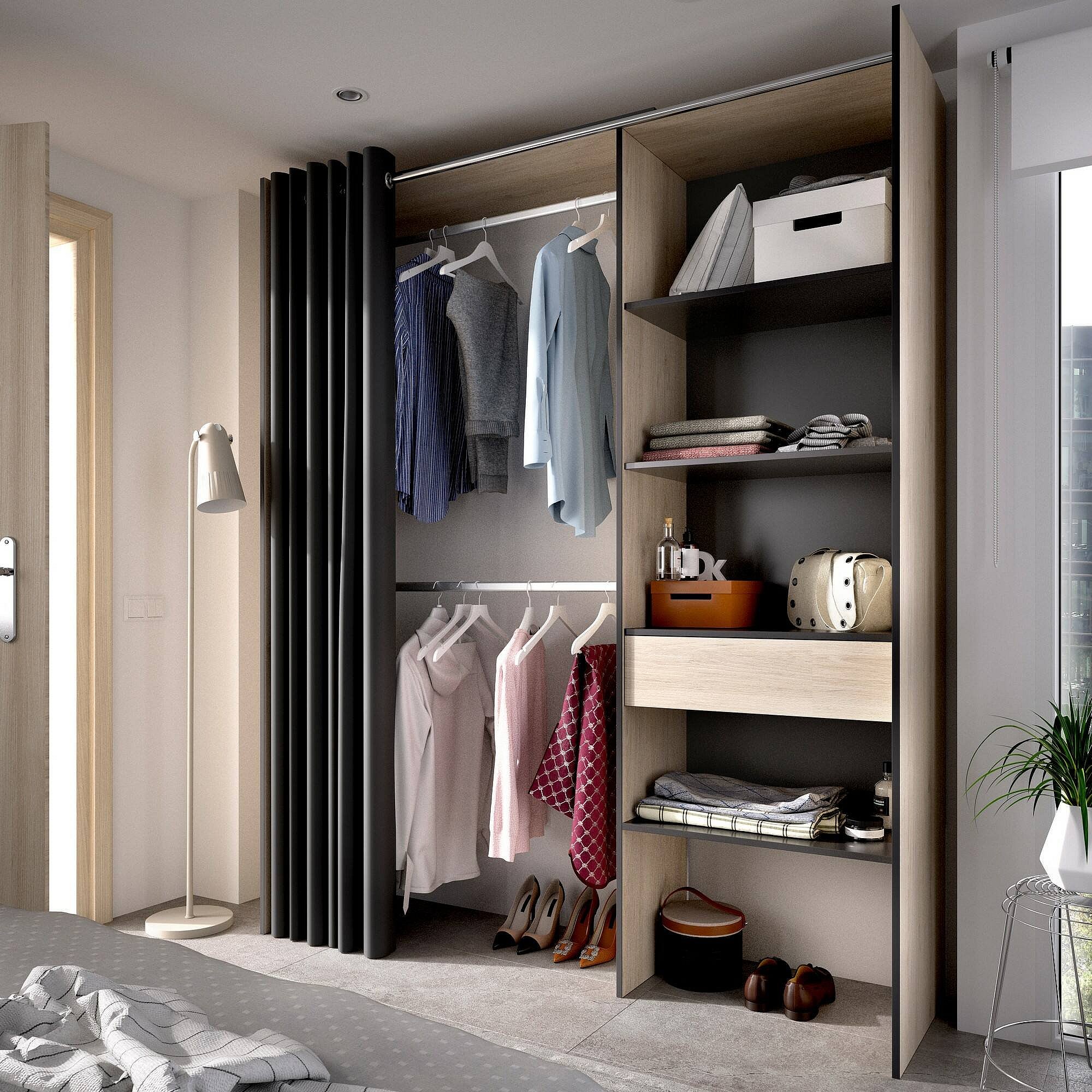 GARDEROBE - Structuur voor inloopkast met gordijn, Open kleerhanger, 160x50h205 cm, Eiken en Antraciet.