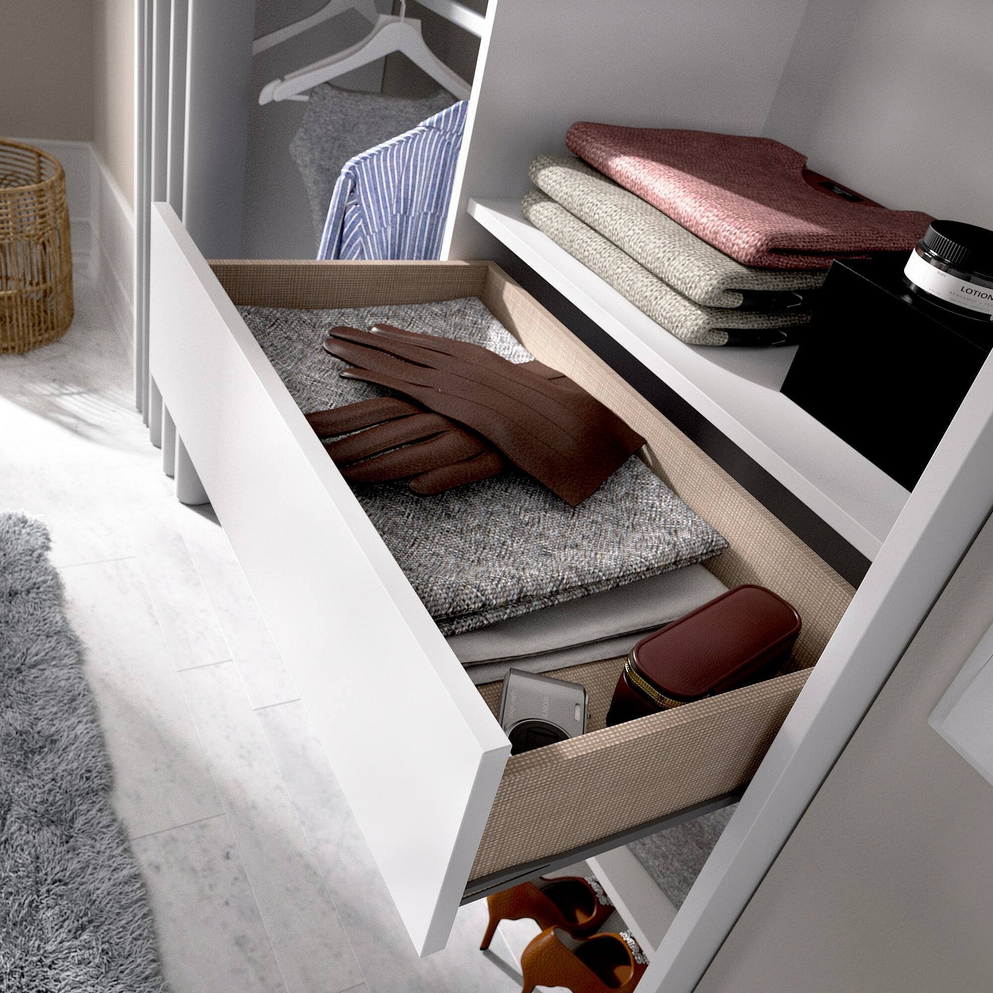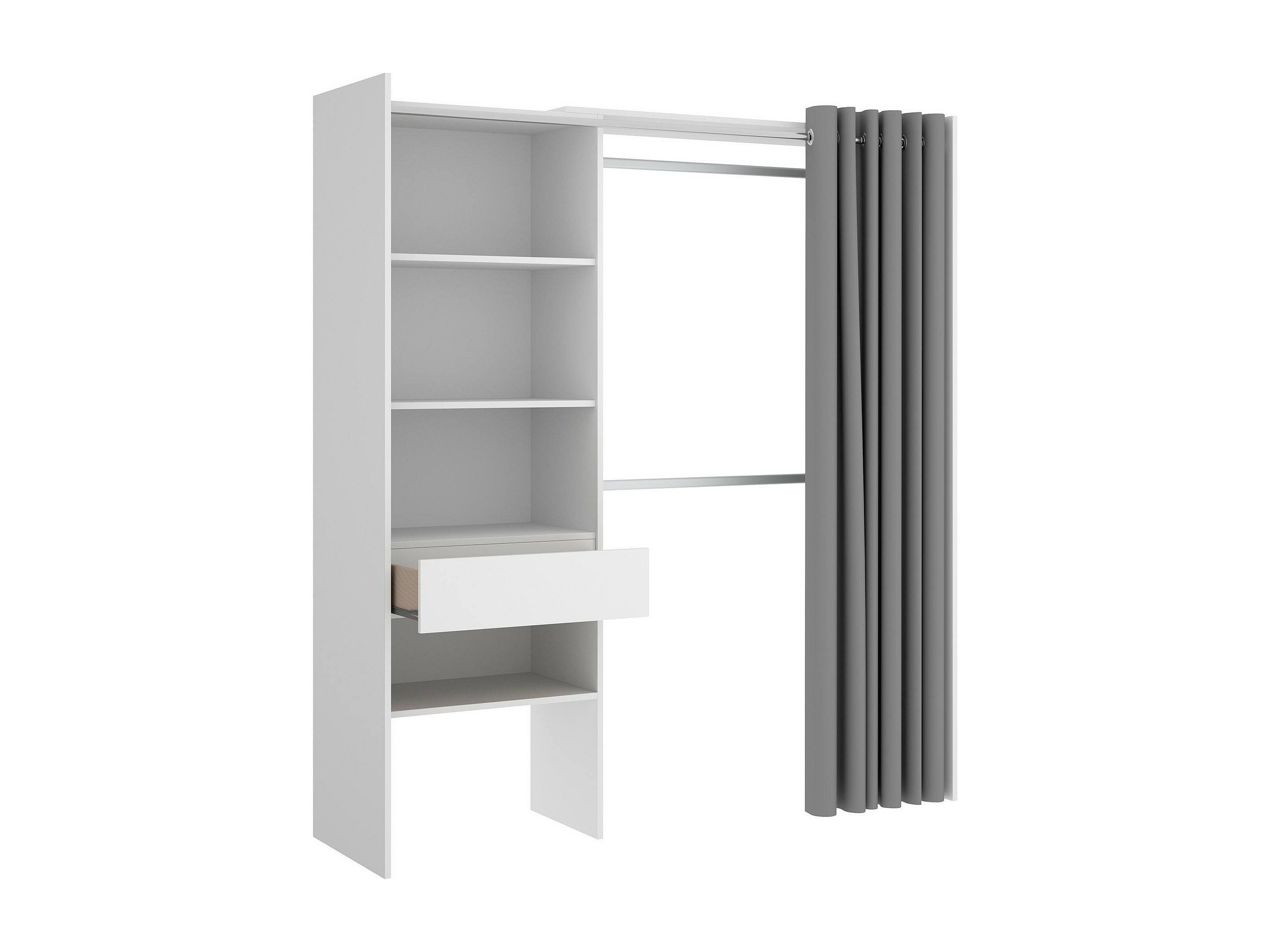 STRUCTUUR EN GEBRUIK - Kledingkast met gordijn, compleet met twee aluminium kleerhangerstangen, een lade en vier planken, dankzij de organisatie van de Spaces biedt voldoende opbergruimte - De gehele structuur van het meubilair is perfect om een â€