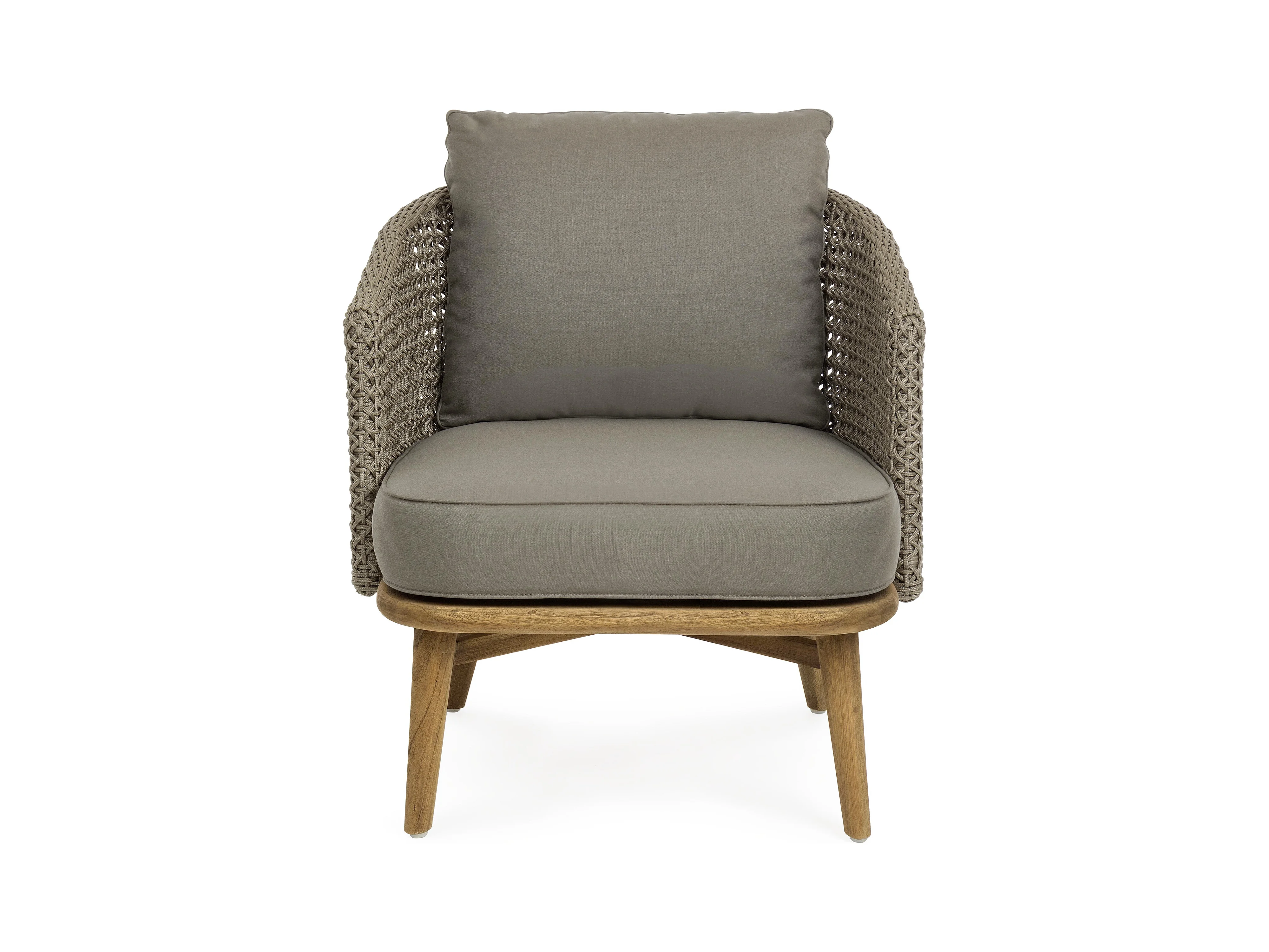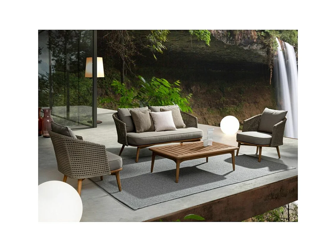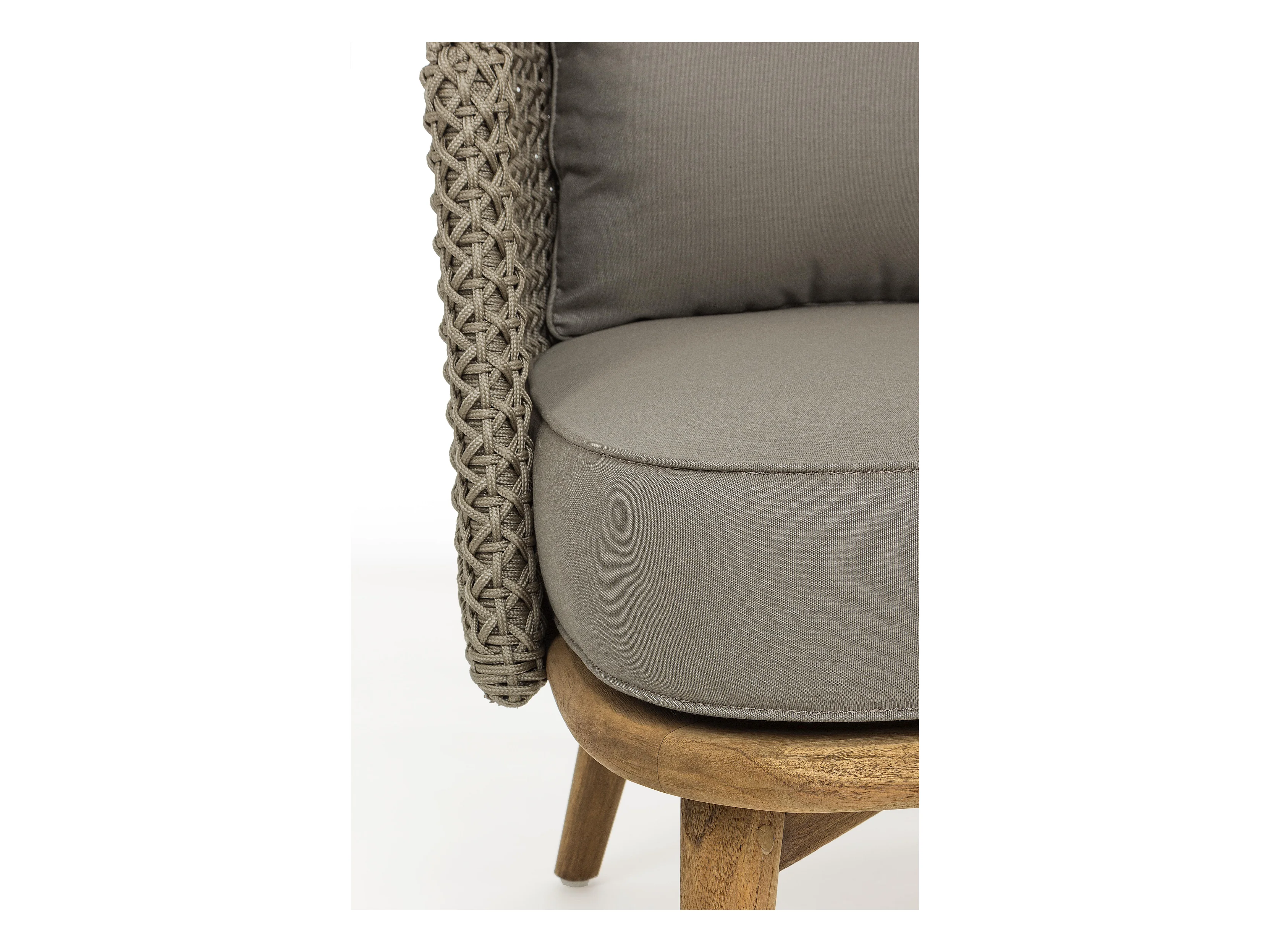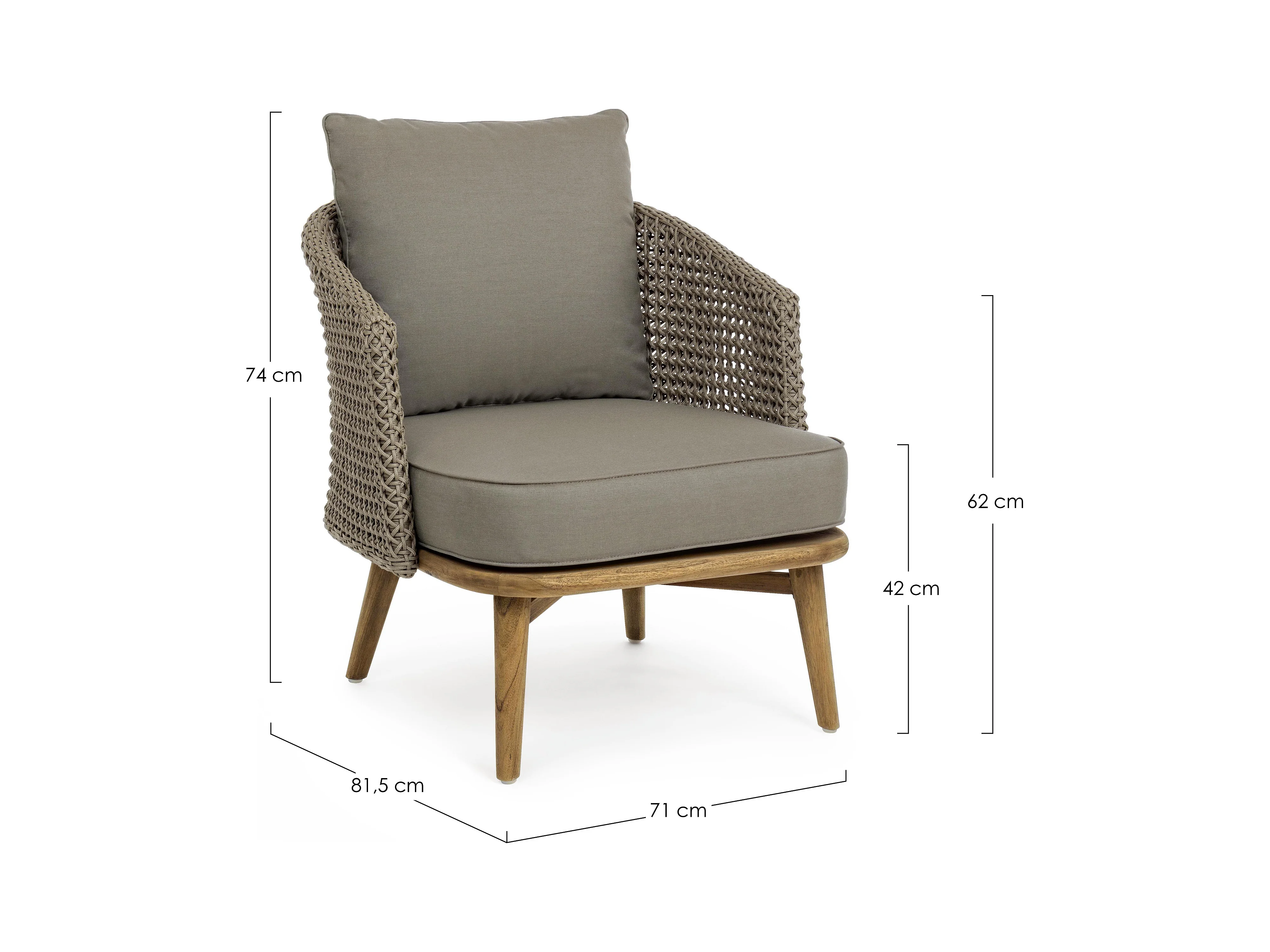 Weven tuinfauteuil in beige touw en teakhouten poten met rustieke afwerking Irina