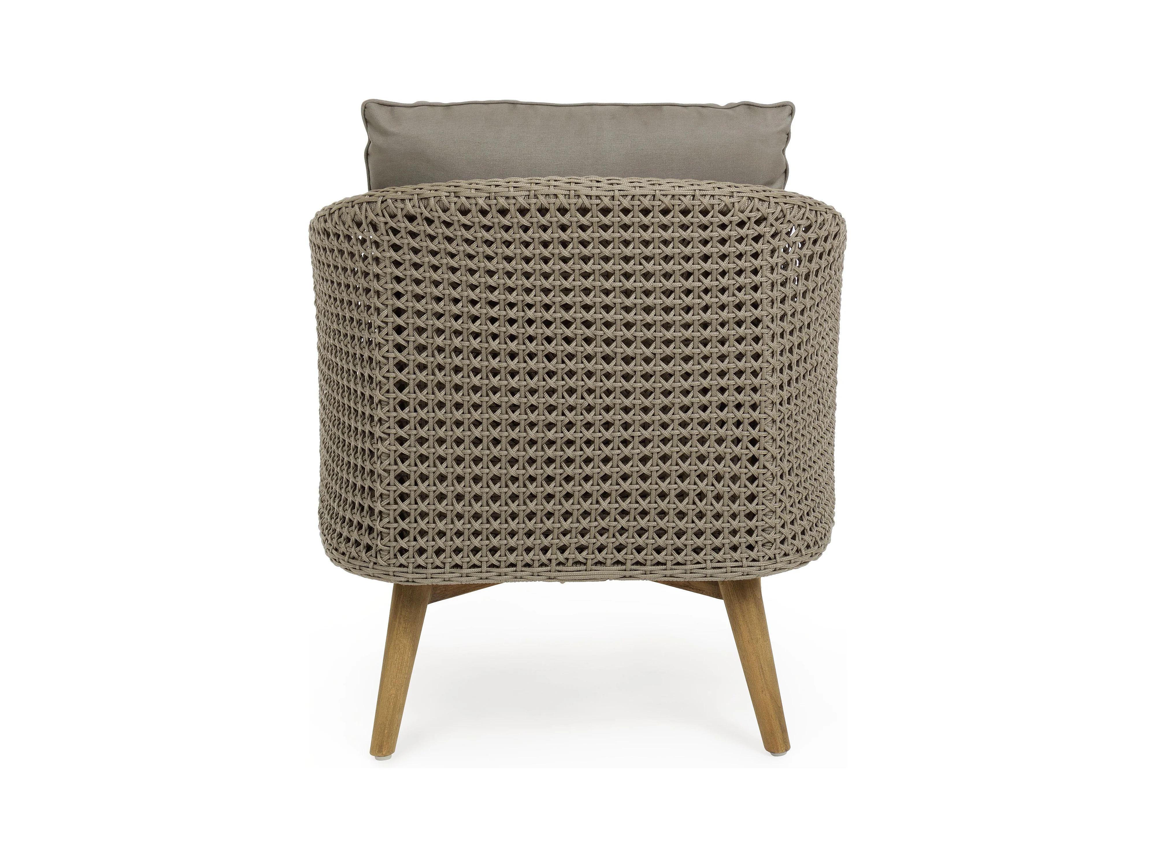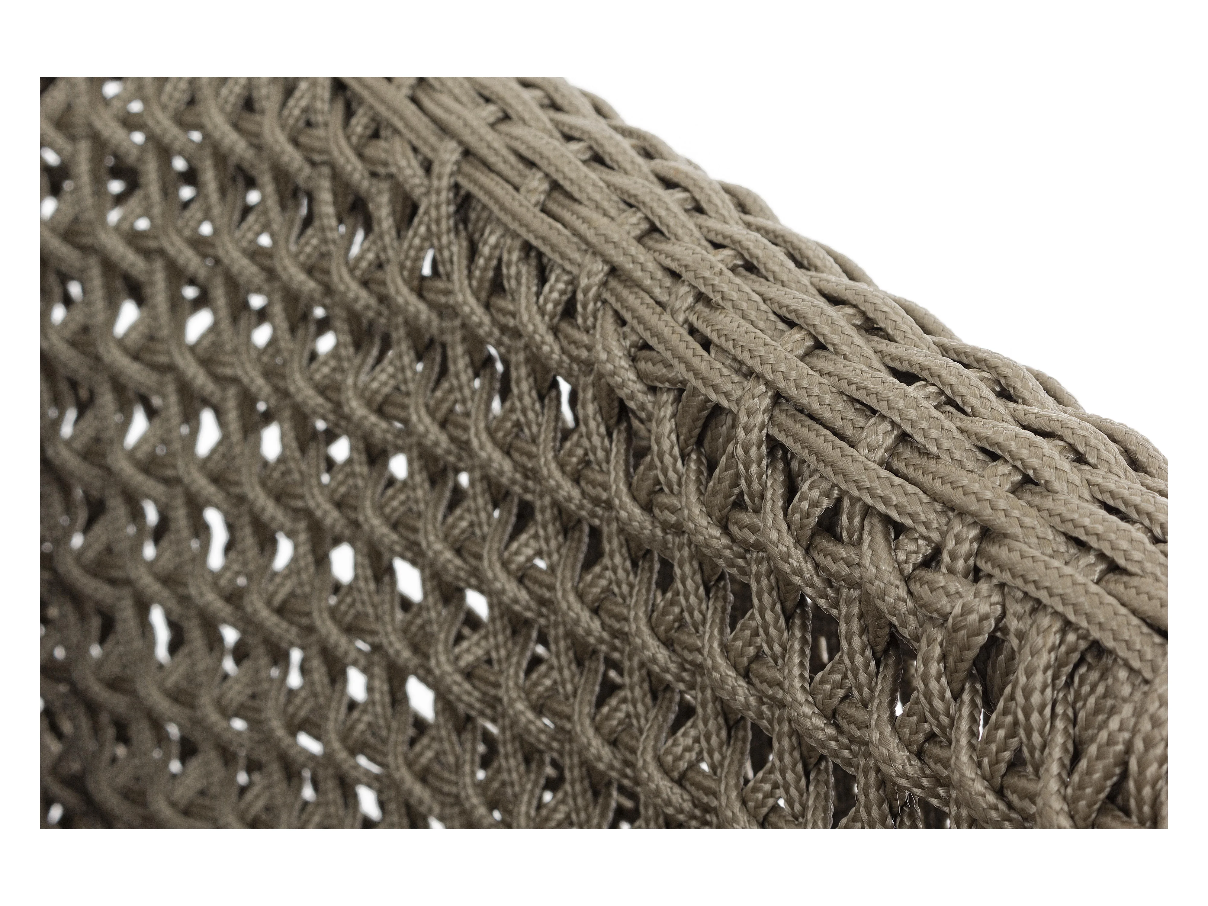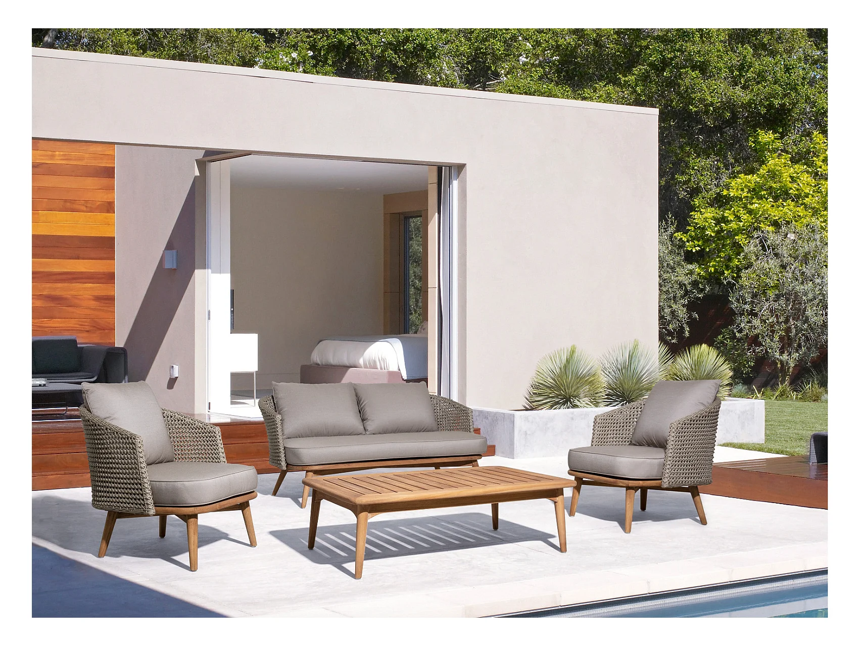 Weven tuinfauteuil in beige touw en teakhouten poten met rustieke afwerking Irina
