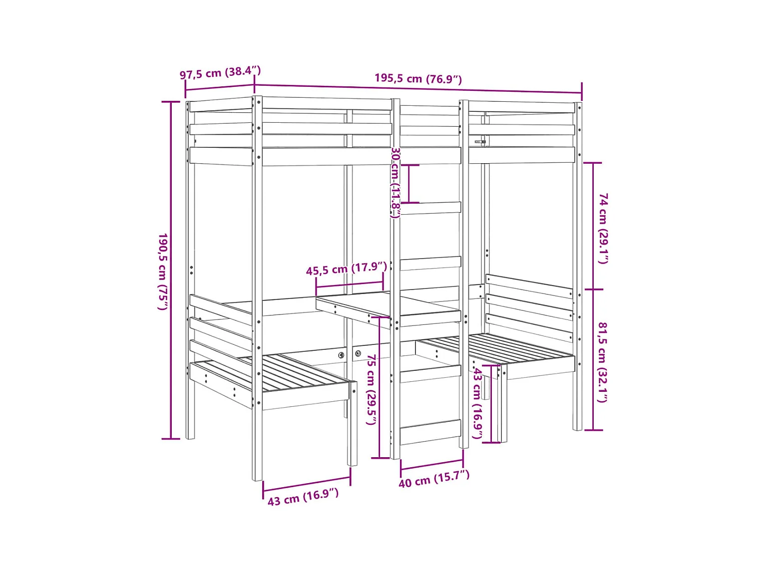 Wit mezzaninebed met bureau en stoelen 90x190 cm massief grenen