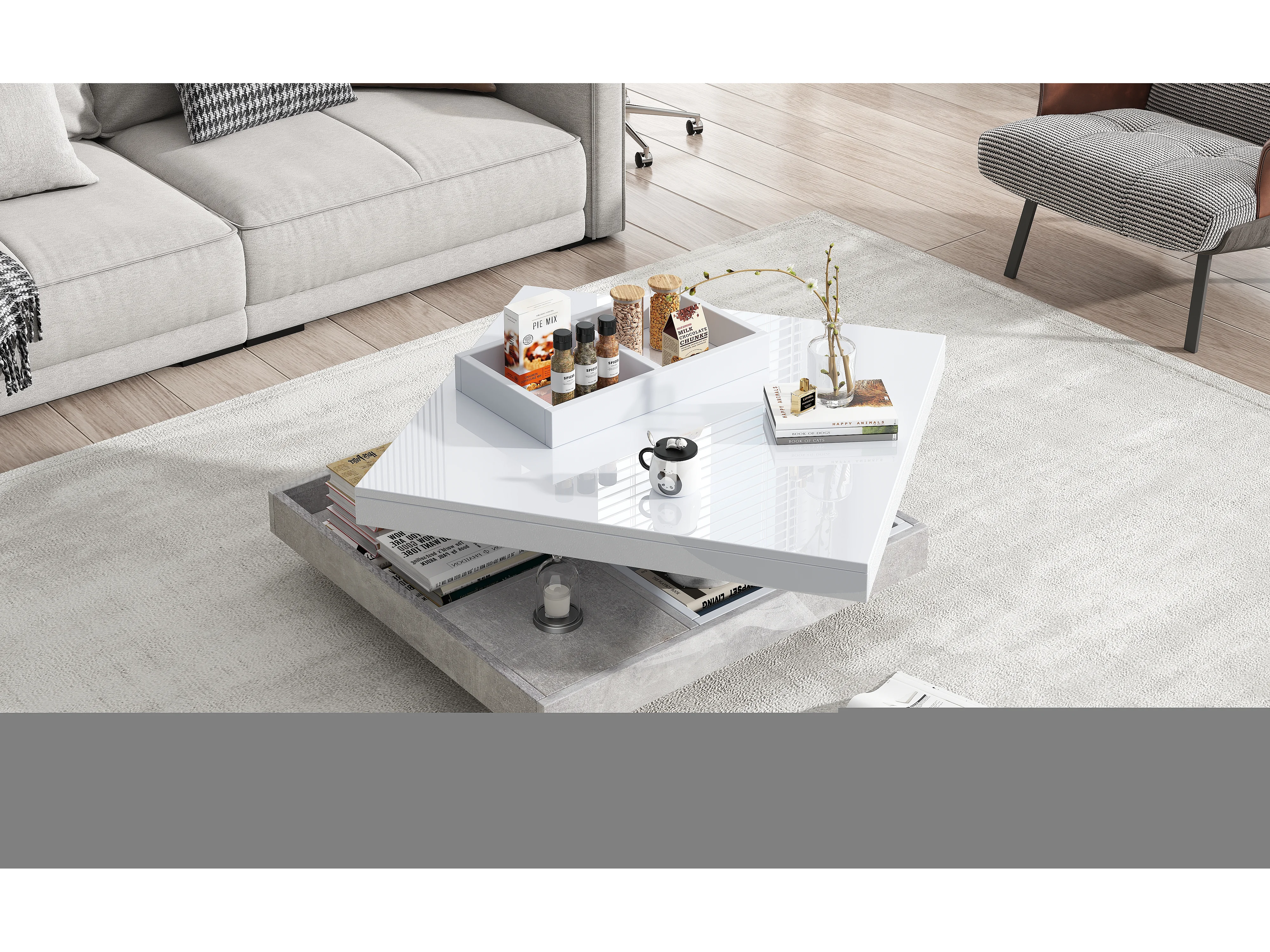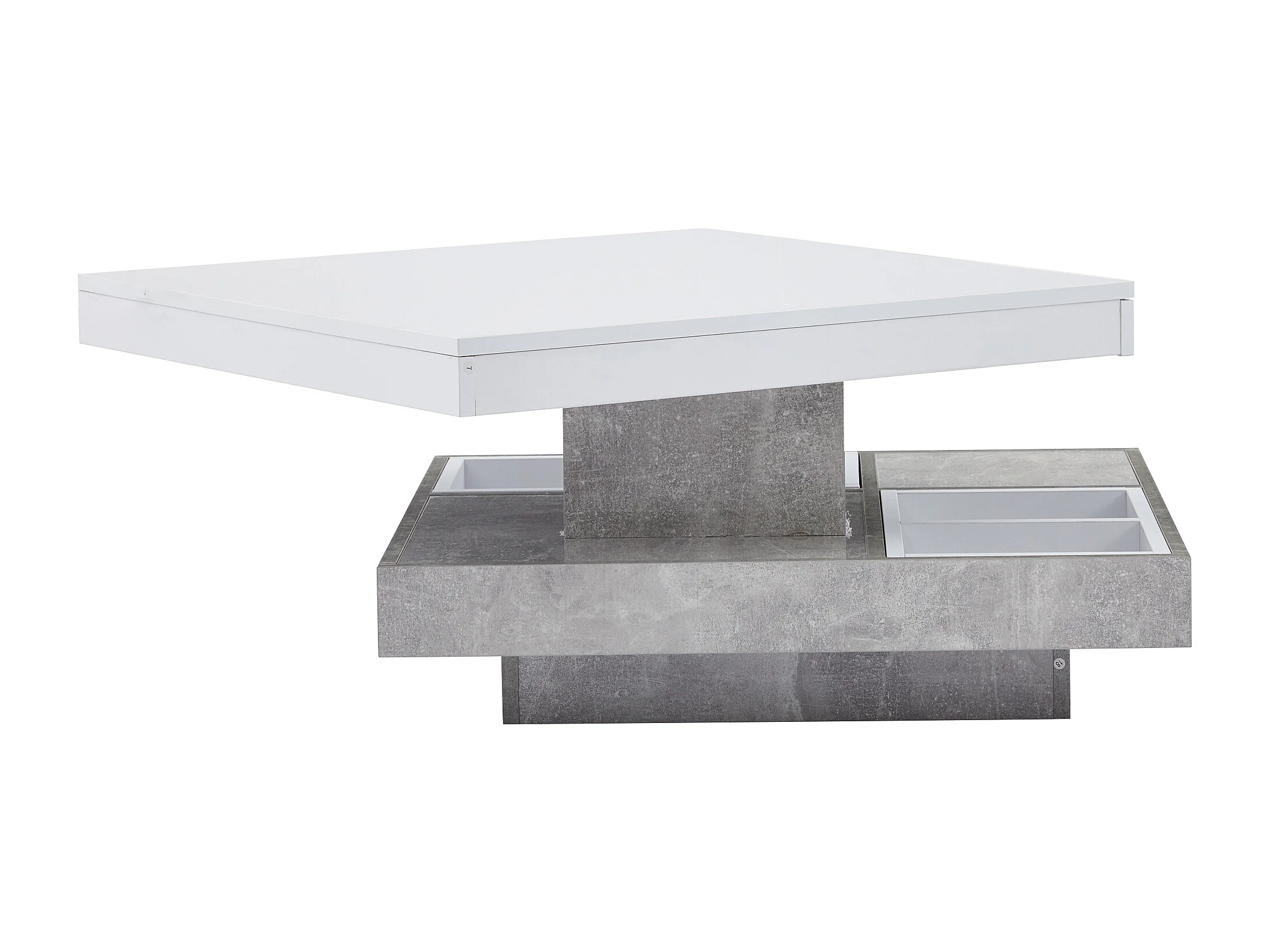 Witte draaibare salontafel met opbergruimte, glanzend gelakt blad - Marmerlook