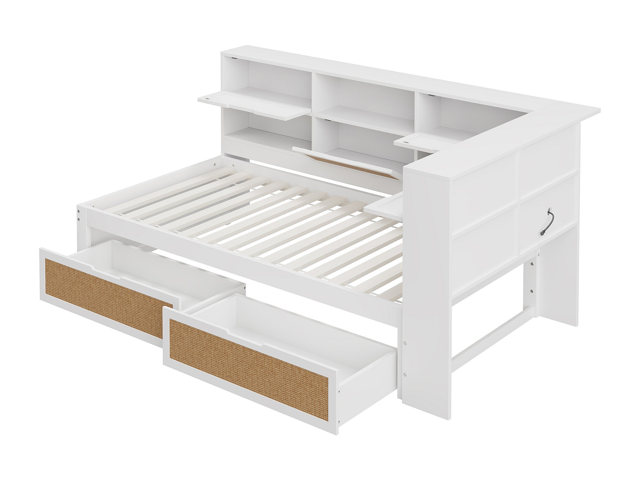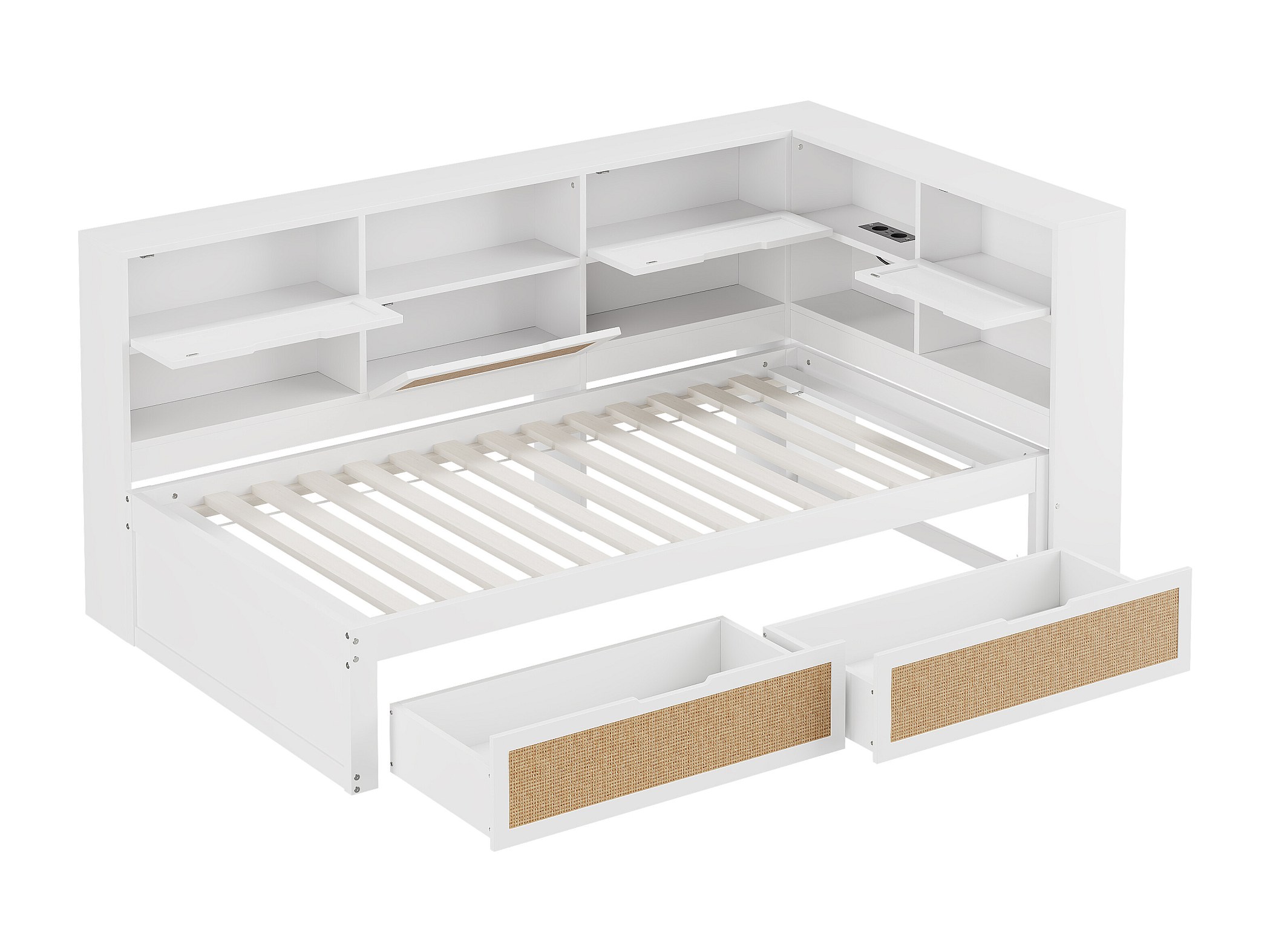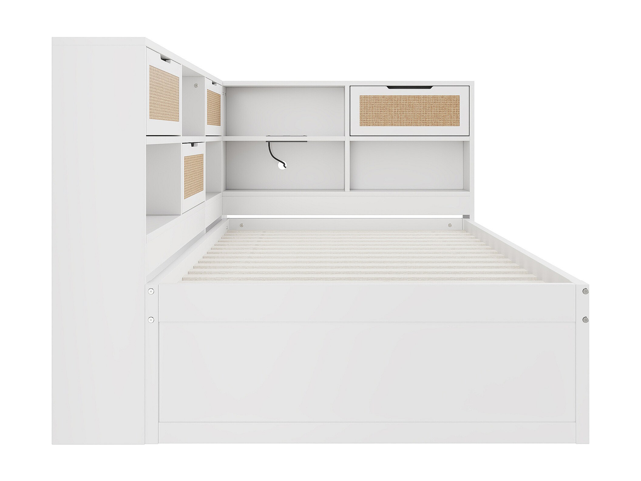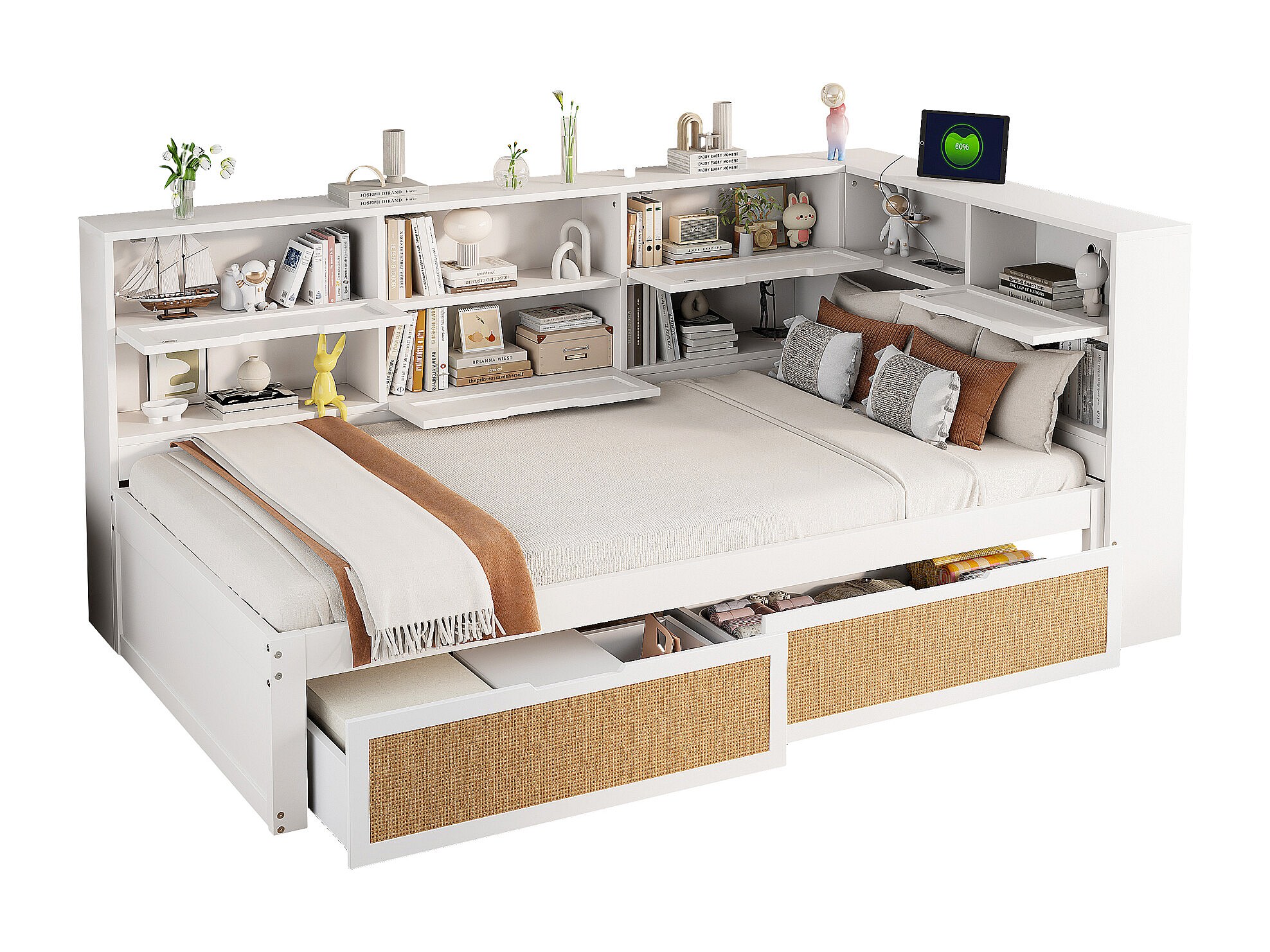 Witte en houten kinderbedbank 90x200cm met lades, diverse opbergruimtes en oplaadpoort (zonder matras)