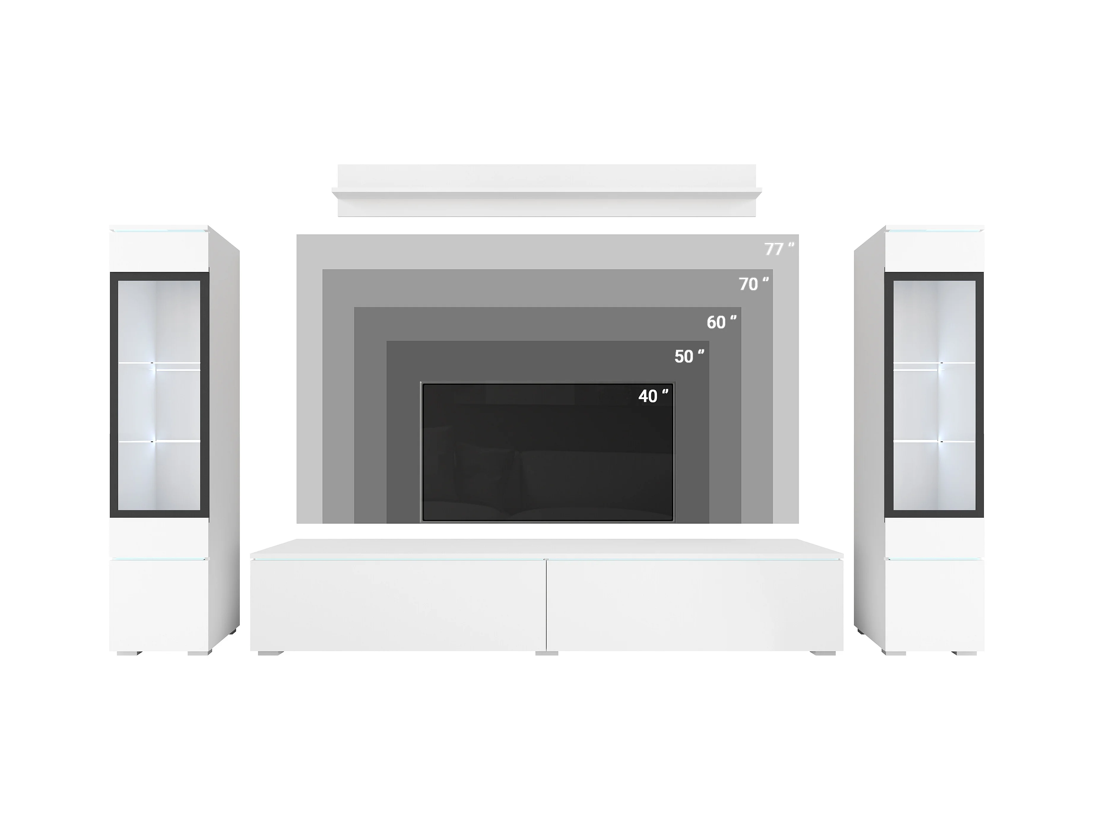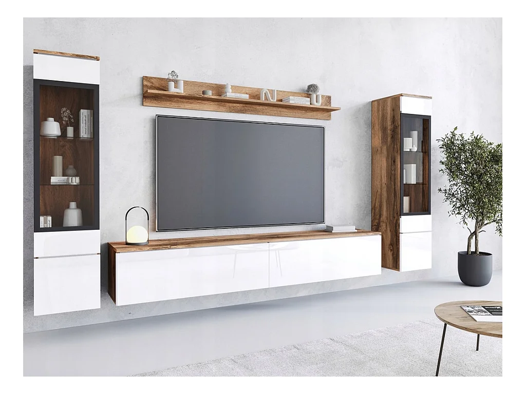 Woonkamerset met LED, 4 elementen – tv-meubel 180 cm, 2 vitrinekasten en plank, staand of hangend, romp eiken Wotan, fronten hoogglans wit