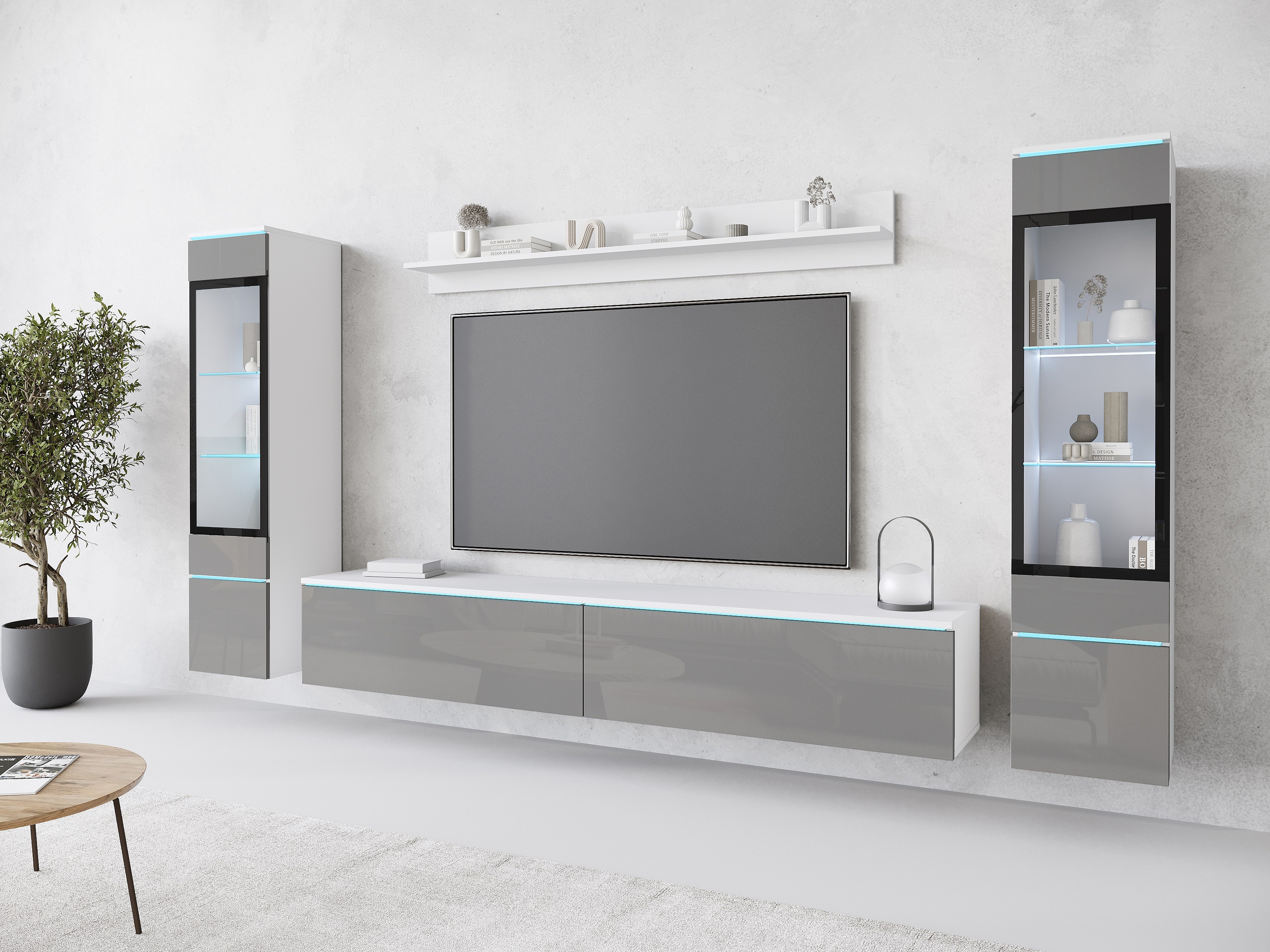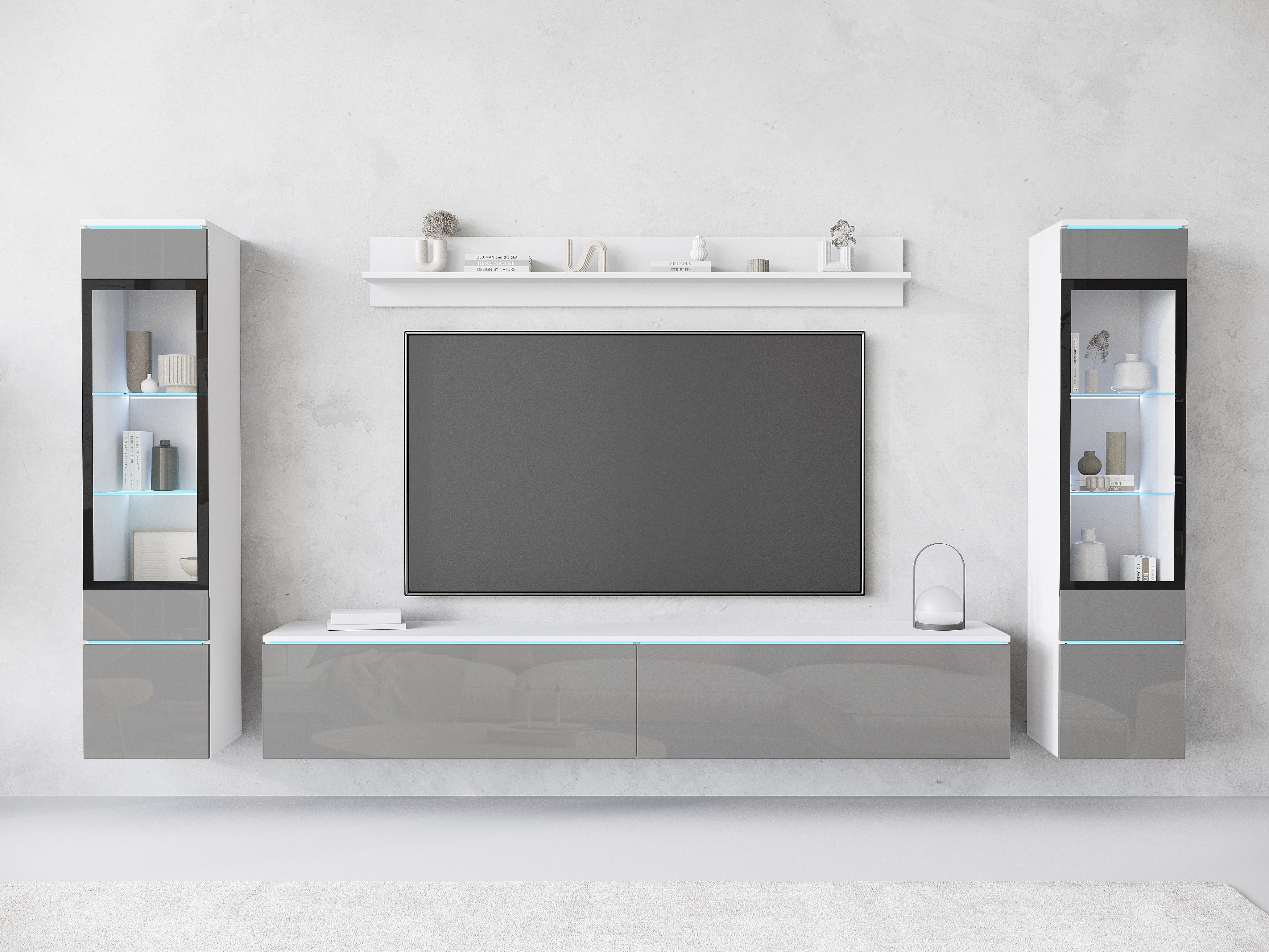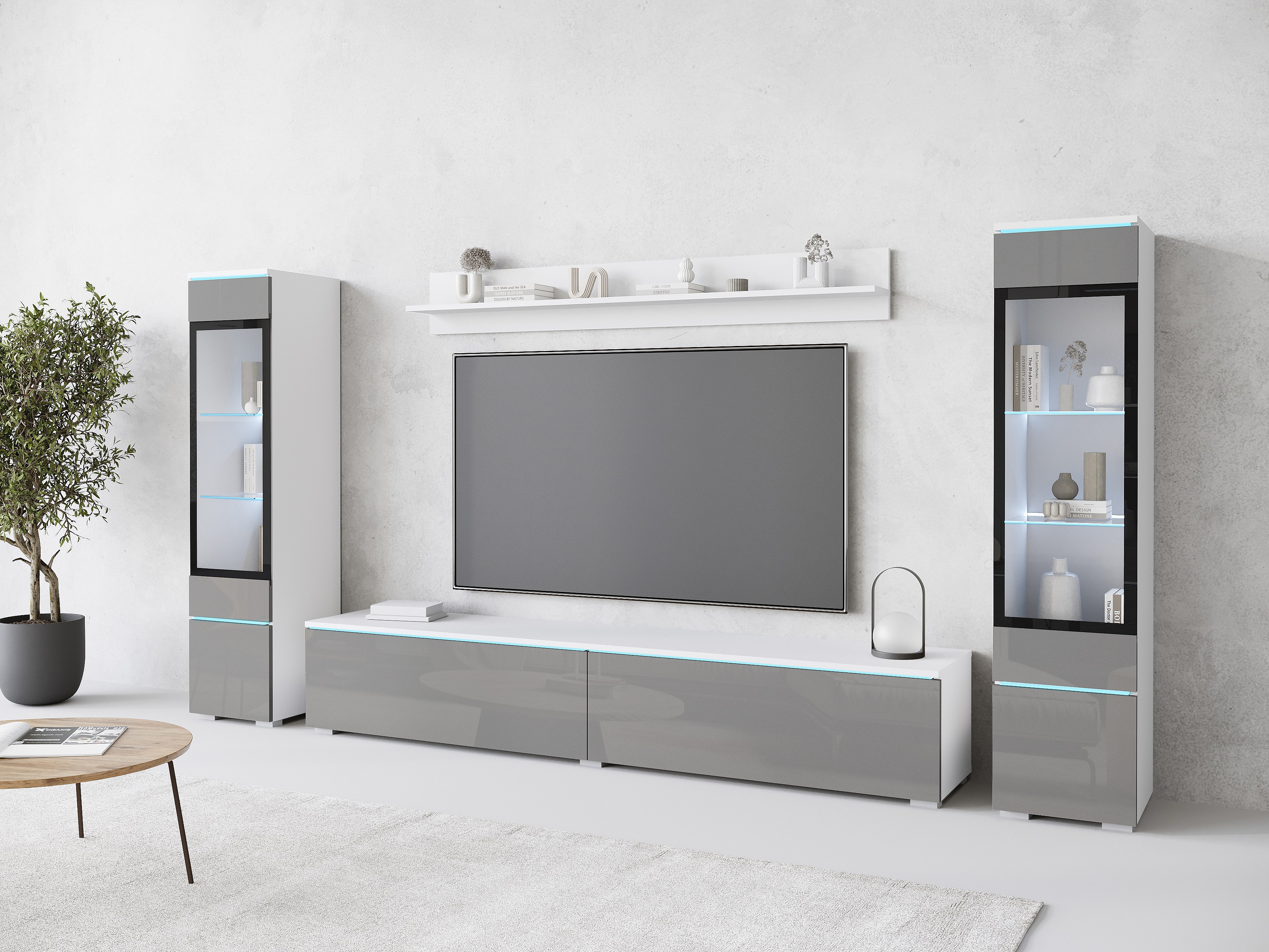 Woonkamerset met LED, 4 elementen – tv-meubel 180 cm, 2 vitrinekasten en plank, staand of hangend, romp wit mat, fronten hoogglans grijs