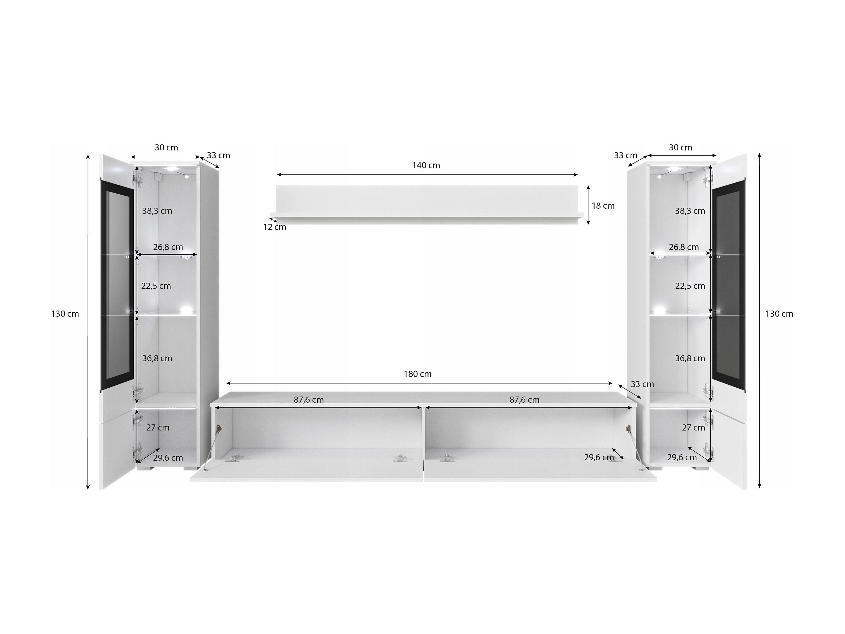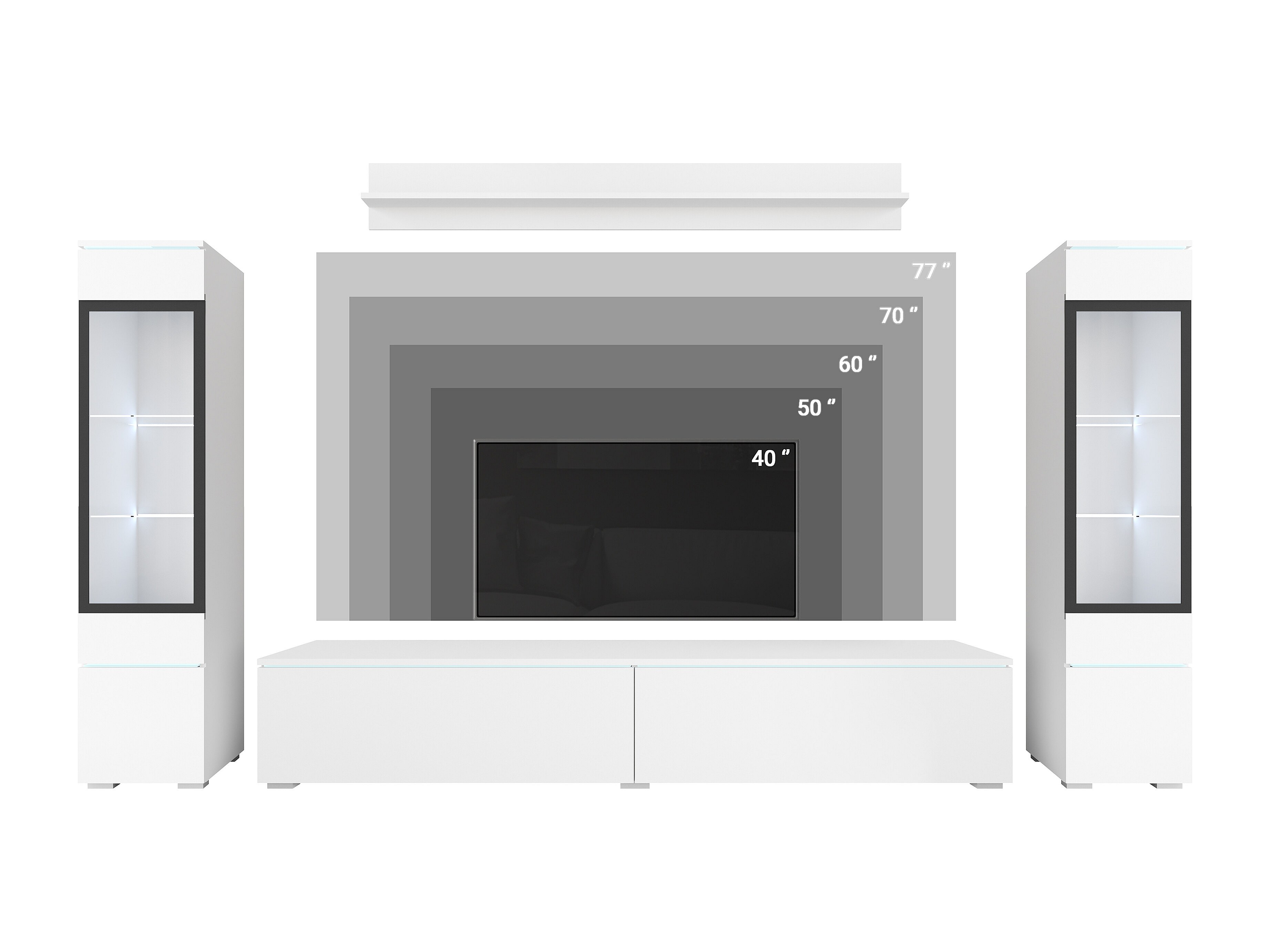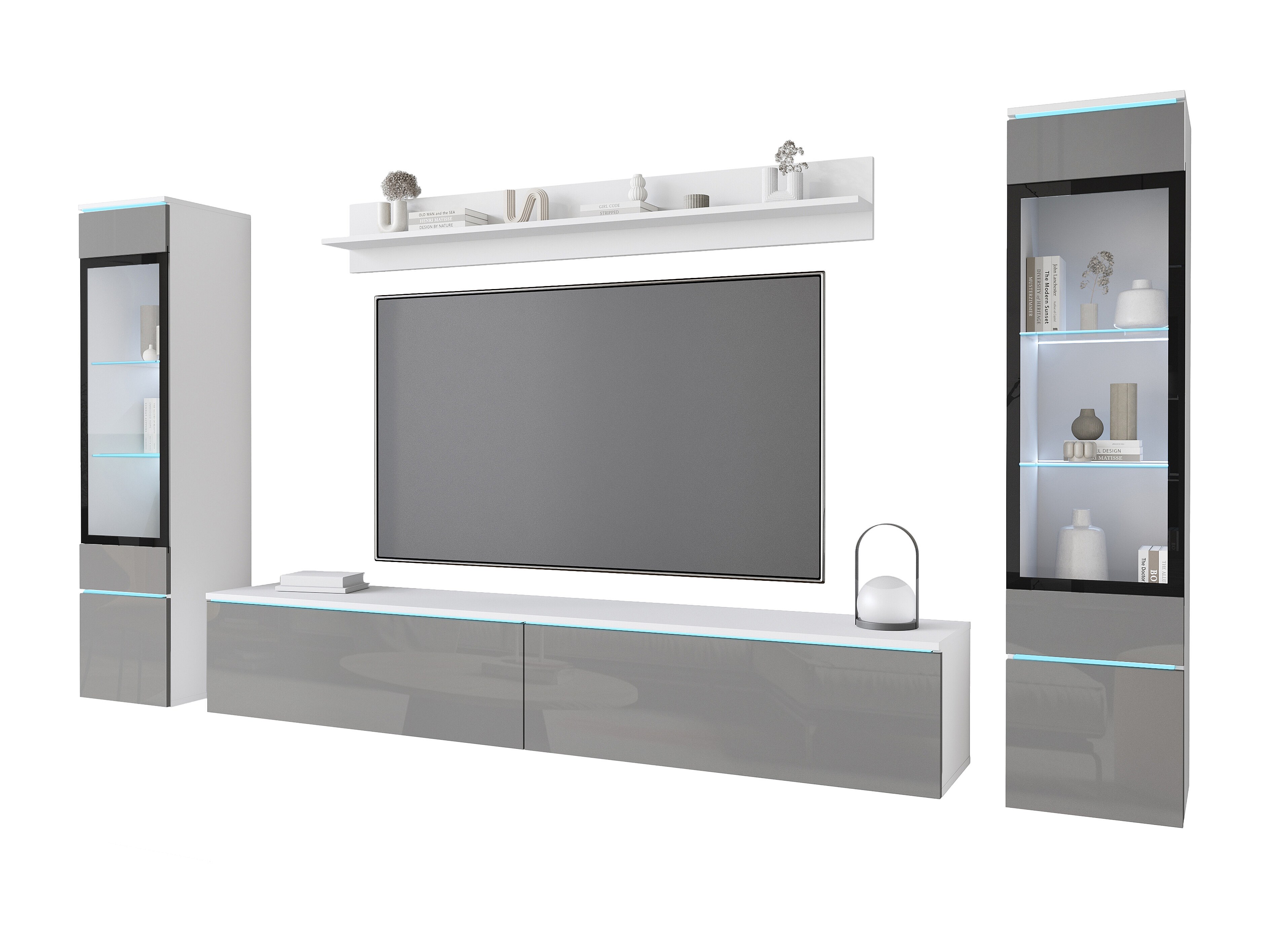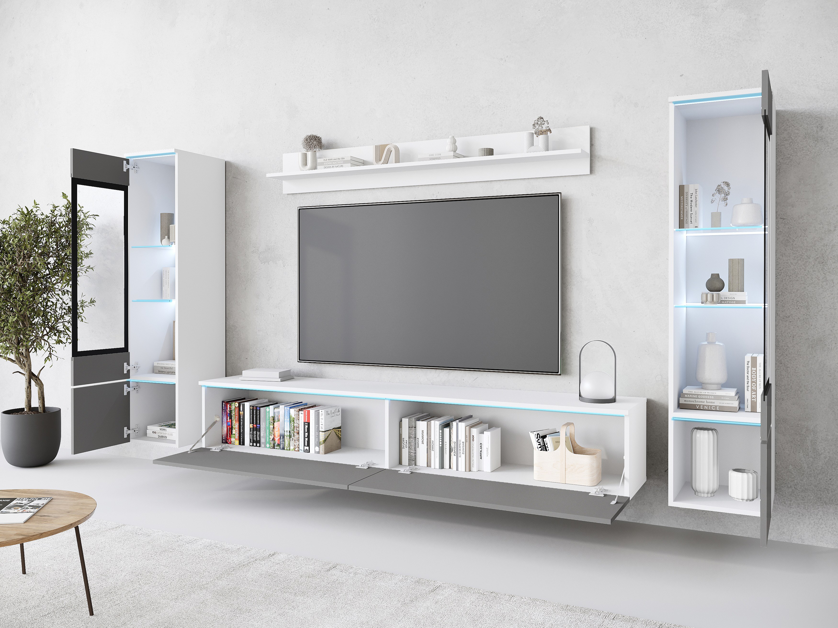 Woonkamerset met LED, 4 elementen – tv-meubel 180 cm, 2 vitrinekasten en plank, staand of hangend, romp wit mat, fronten hoogglans grijs