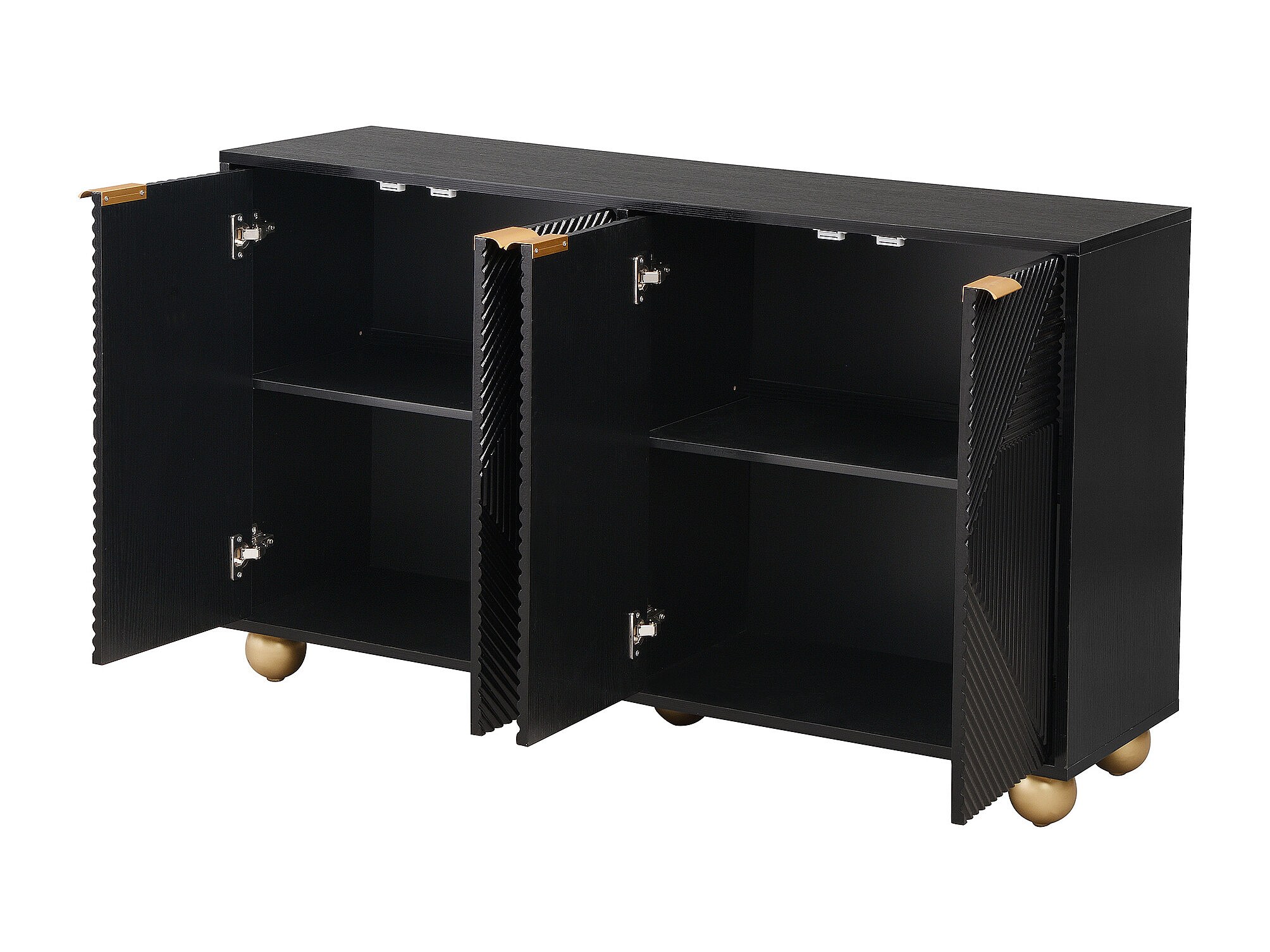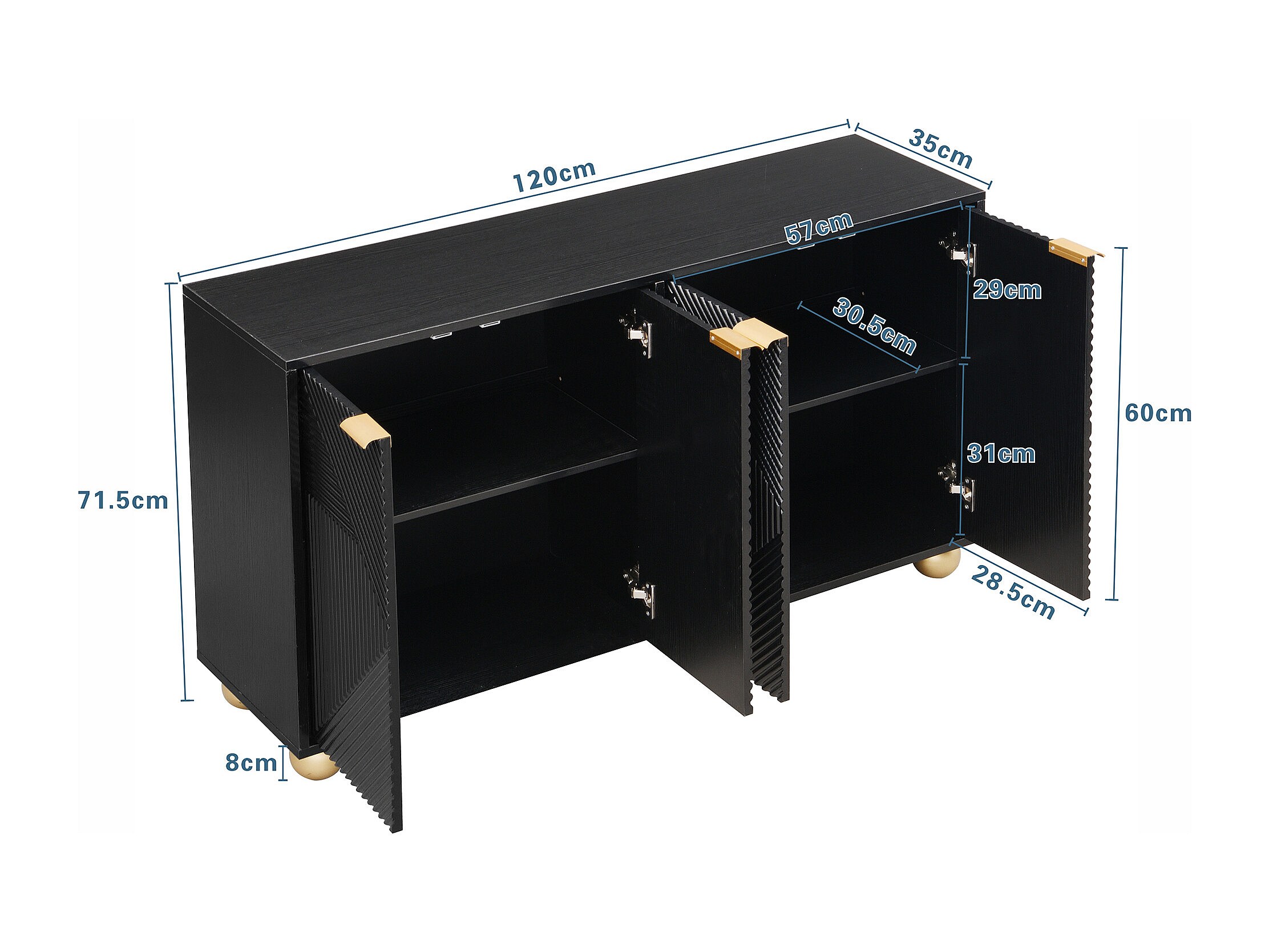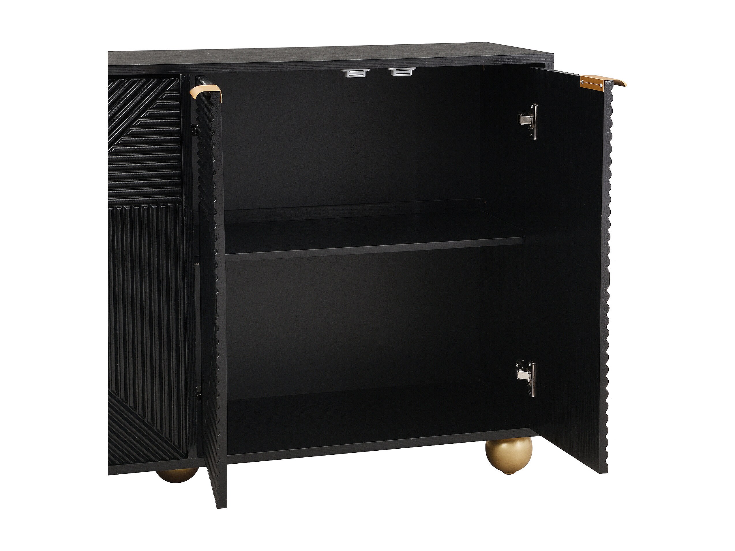 Zwart dressoir met 4 textuurdeuren, verstelbare binnenplanken en gouden bolvormige poten