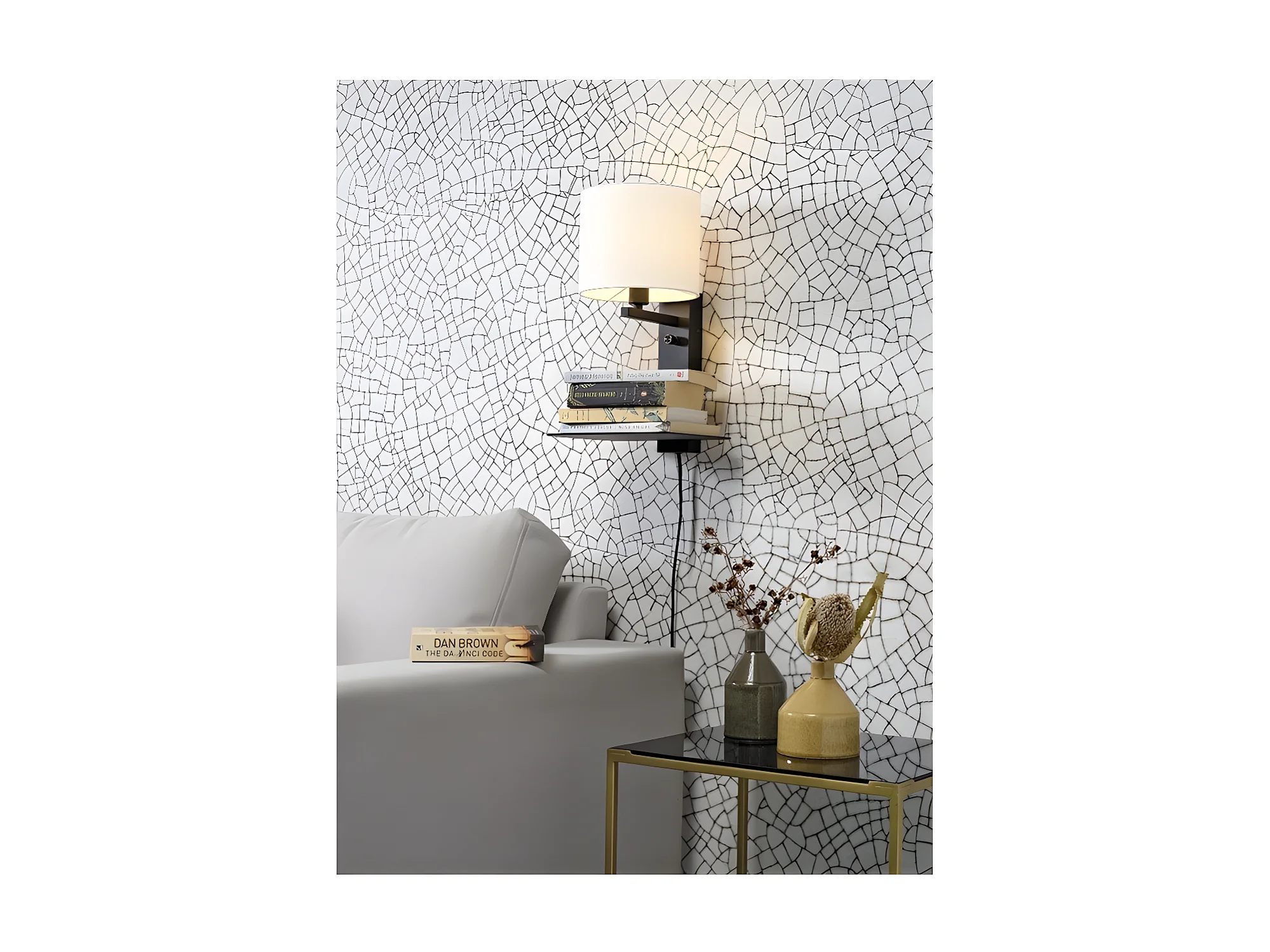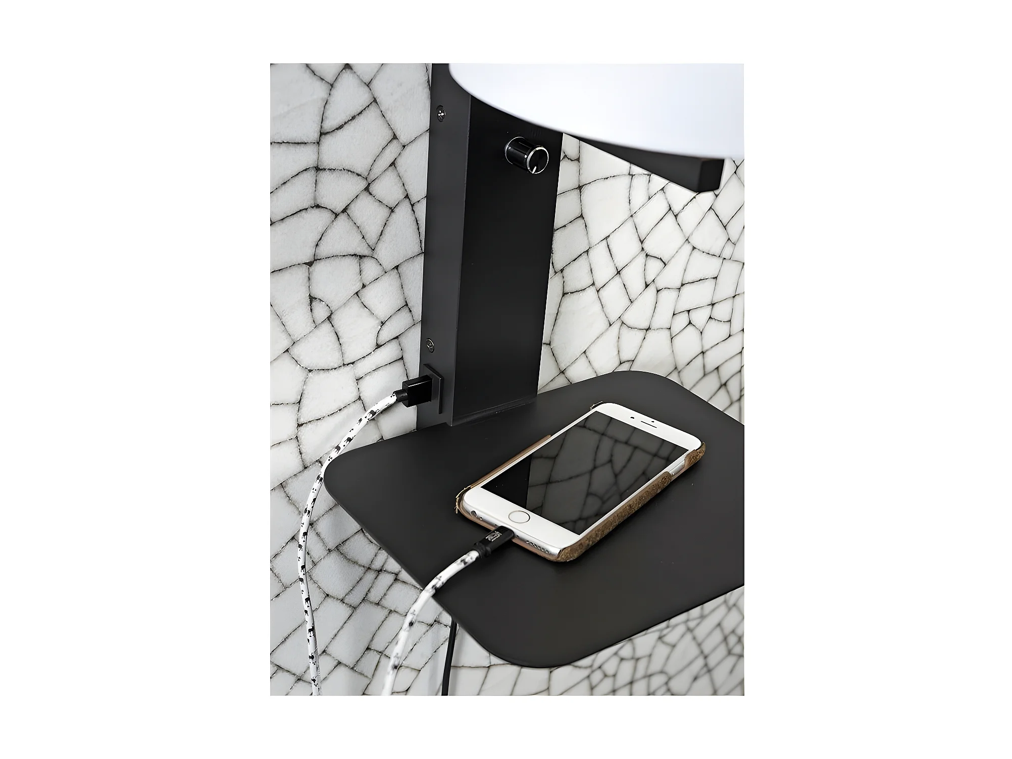 Zwart metalen wandlamp met witte lampenkap plus plank en USB-aansluiting