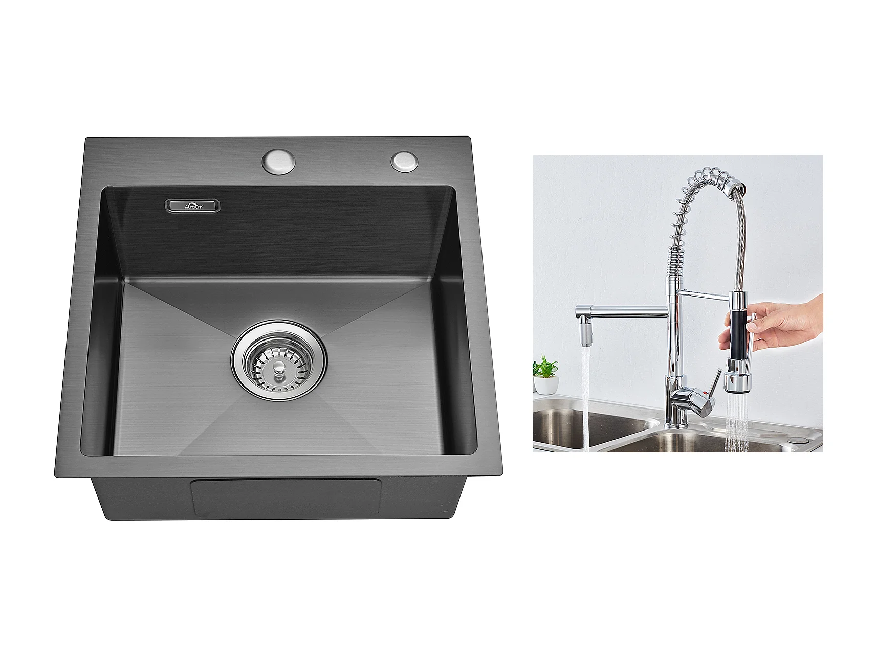 Zwarte Aanrecht 1 Bak 45x45CM Roestvrij Staal 304 , Inbouw en Opzetbaar + Draaibare Keukenkraan 360° Uittrekbare Handdouche