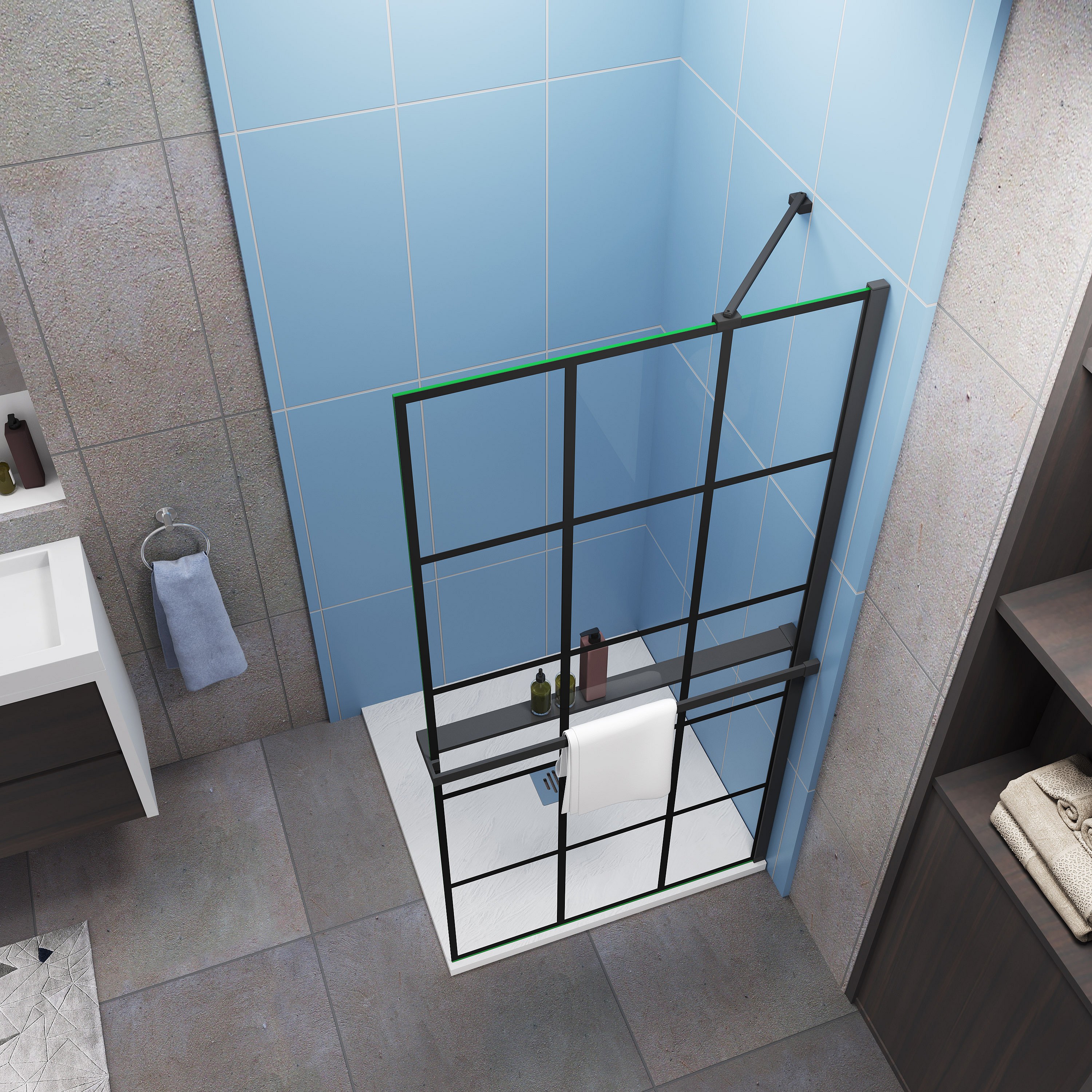 Inloopdouchewand met zwart profiel, 140x200cm - 8mm antikalkglas + 8 ... 100x200cm - 8mm antikalkglas + 100cm zwarte aluminium doucheplank + 45cm montagestang