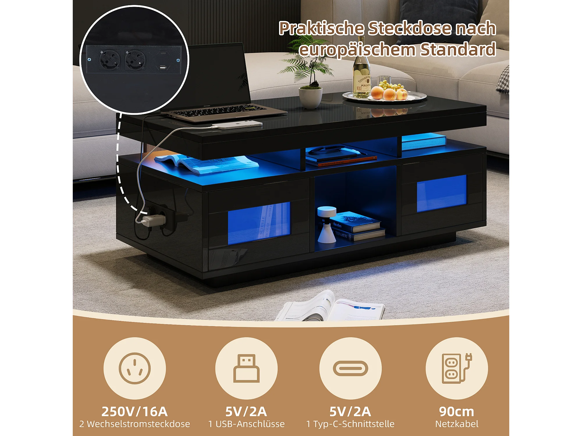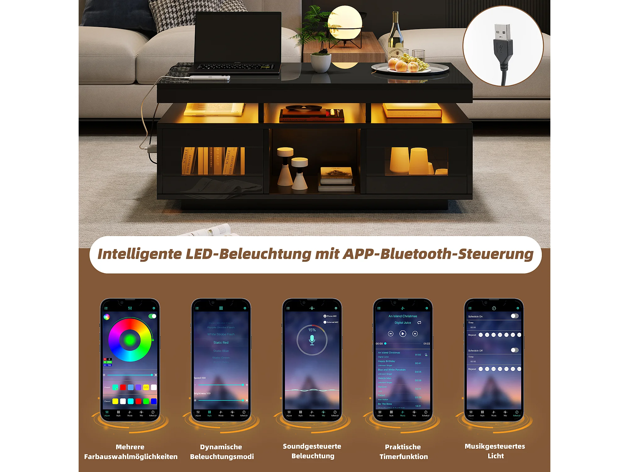 Zwarte salontafel met app-gestuurde LED, geïntegreerd stopcontact en USB, opbergruimte, (100x50x43 cm)