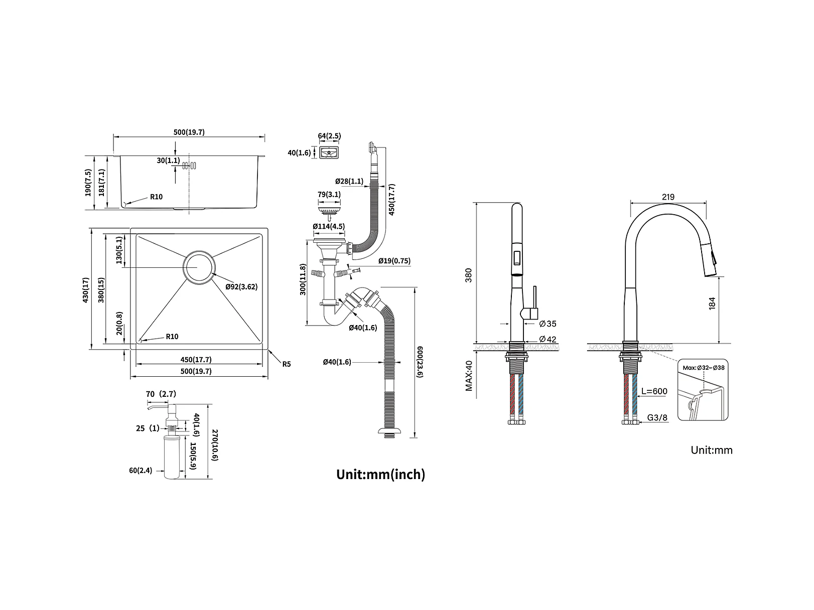 Zwarte Wastafel 1 Bak 50x43x18,5CM, Roestvrij Staal, met Zeep Distrubutor + C KraanUisine Roestvrij Staal Uittrekbaar 360 ° Draaibaar