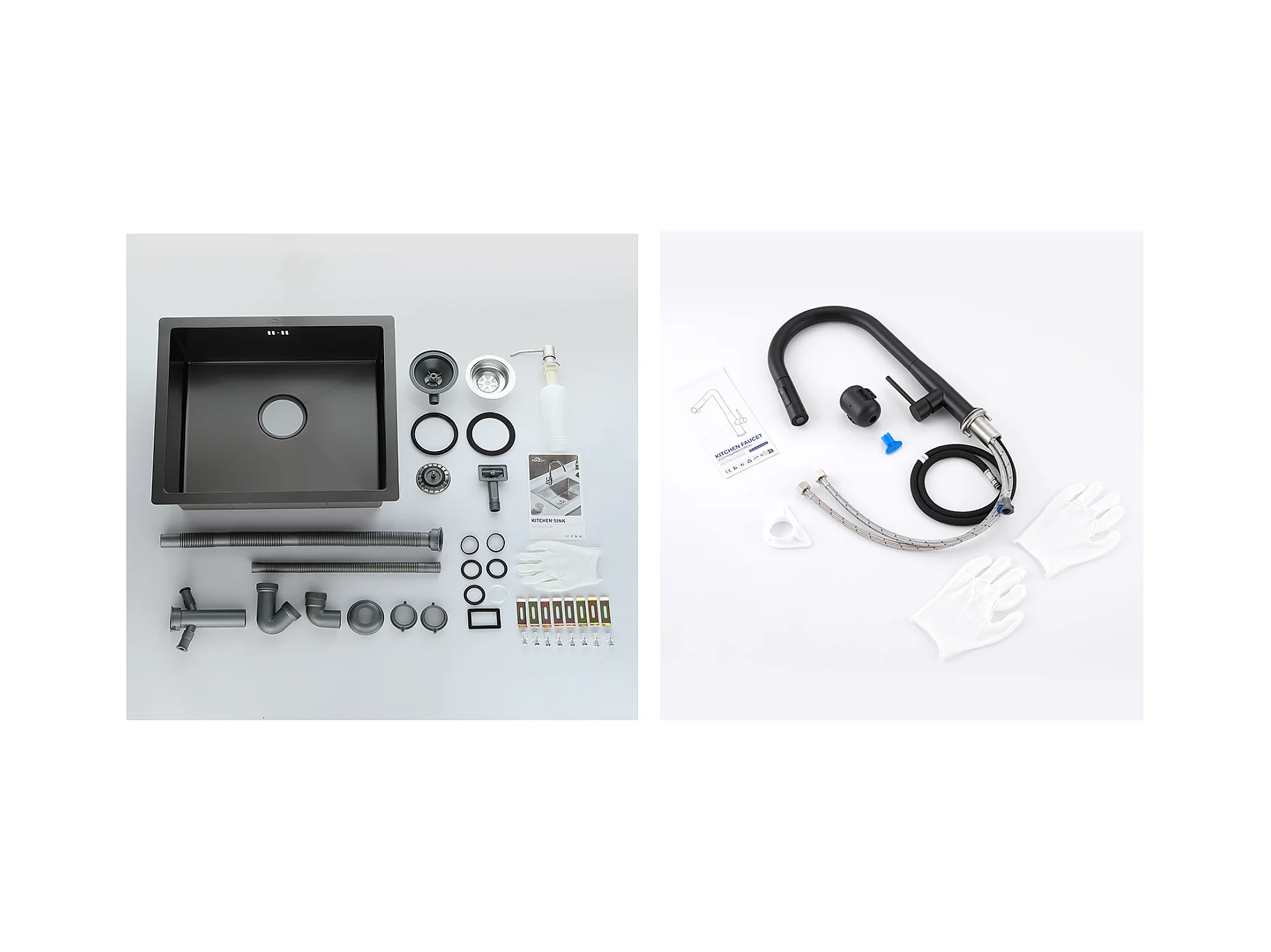 GootsteenZwart 1 Bak 50x43x18,5CM, Roestvrij Staal, met Zeepdistructor + 360° Draaibare Keukenkraan Uittrekbare Handdouche