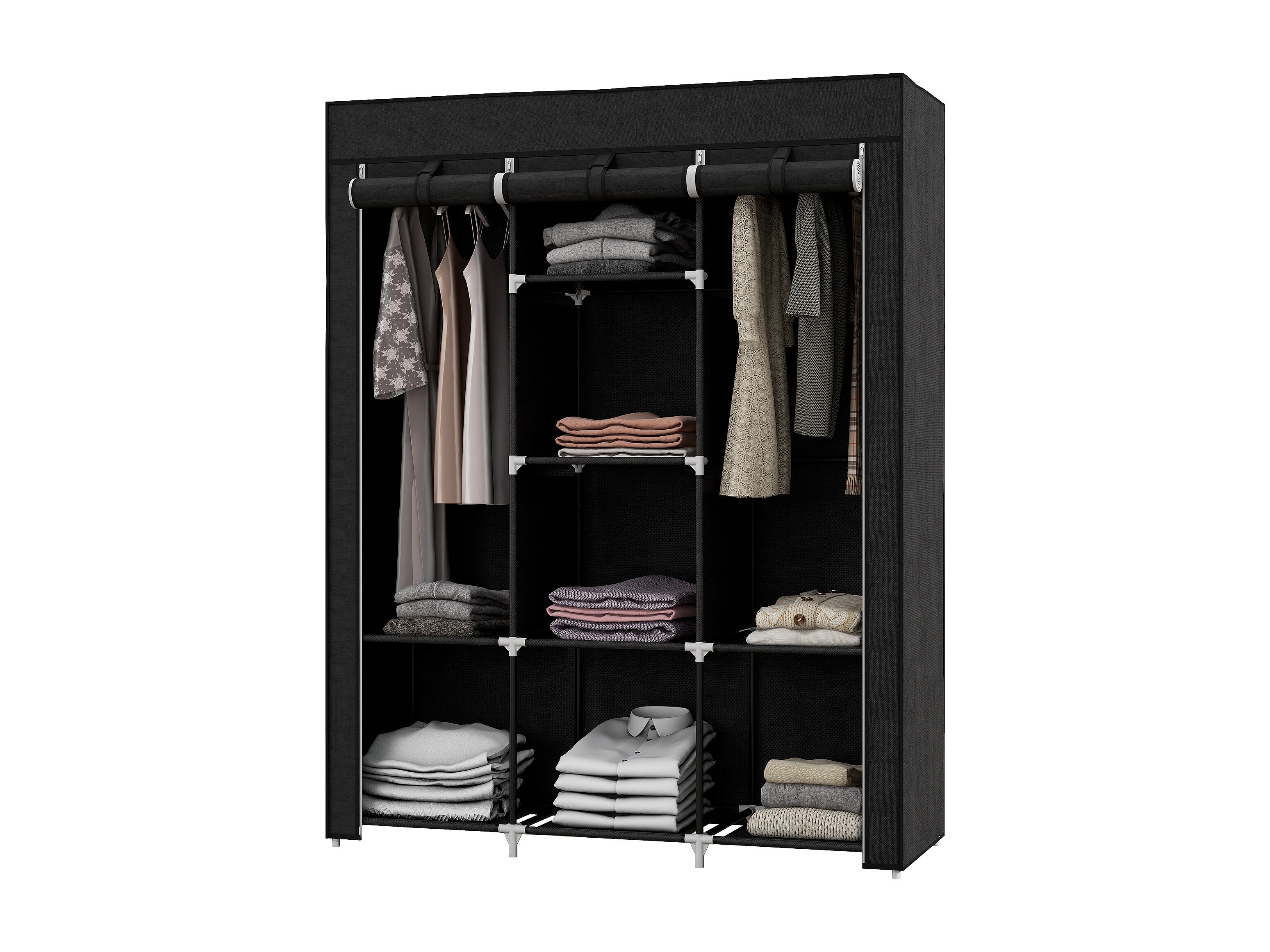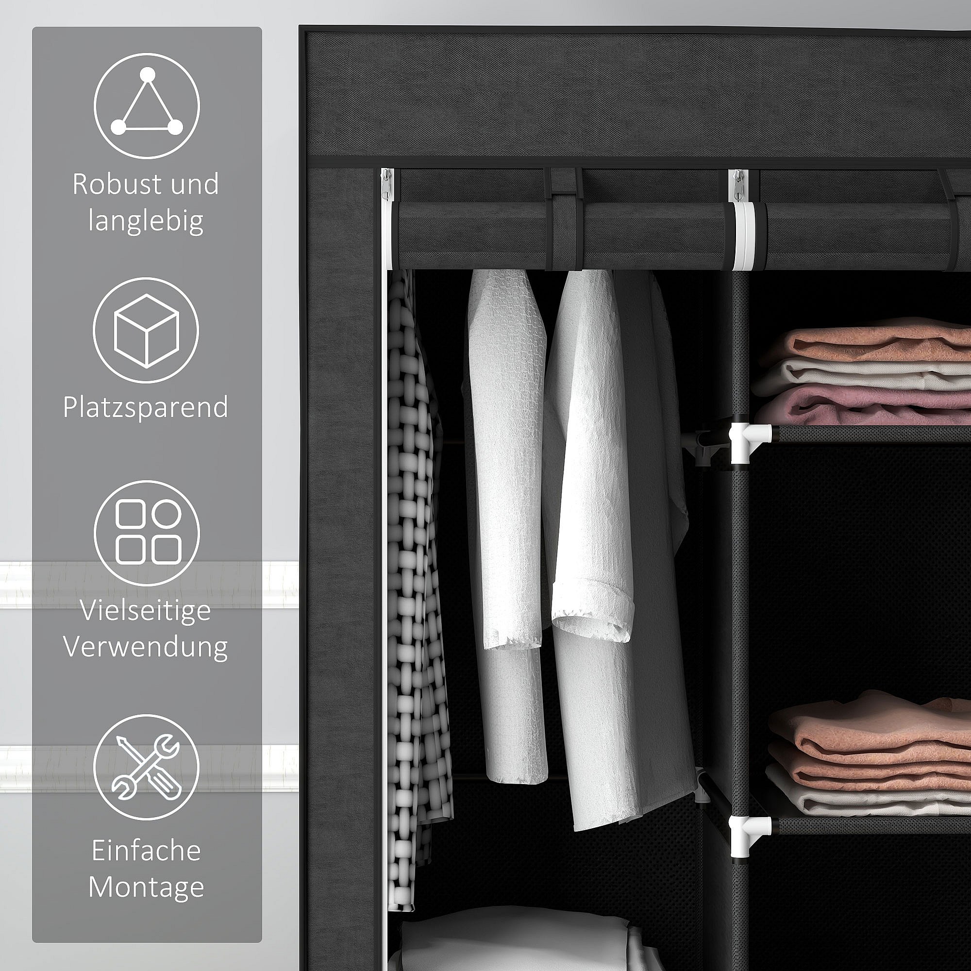 Zwarte stoffen opvouwbare kledingkast met 8 planken en kledingroede - 125 x 43 x 162,5 cm, praktisch en ruimtebesparend voor slaapkamer of hal
