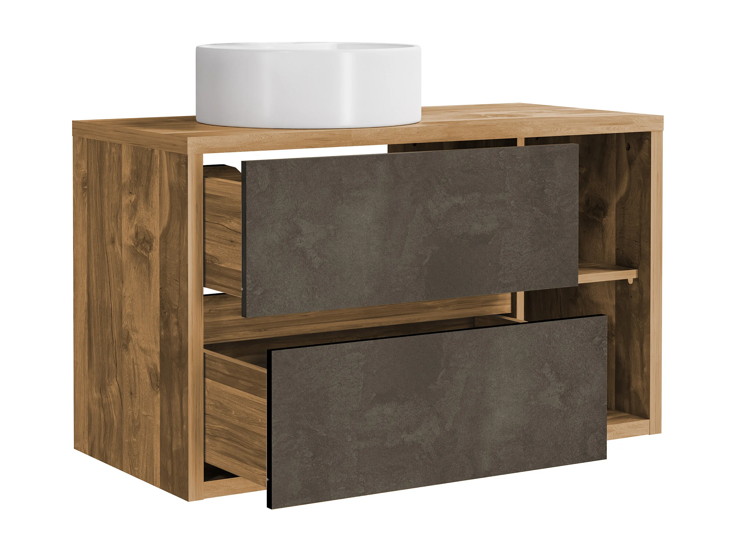 Zwevend badkamermeubel met ronde wastafel - Houtlook en donkergrijs - 100 cm - TIKITIKI