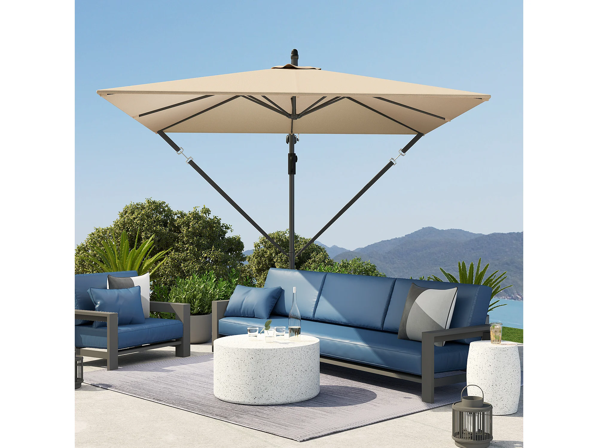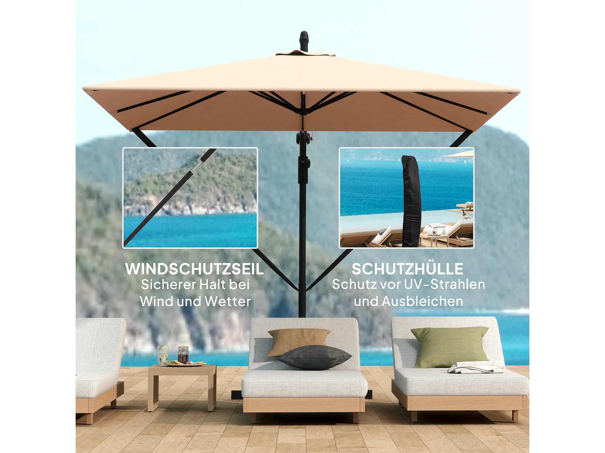 Zwevende parasol Ø260cm, 180g/m² polyesterstof, UV50+ bescherming, kaki, incl. voet, slinger en hoes (295x250x235cm)